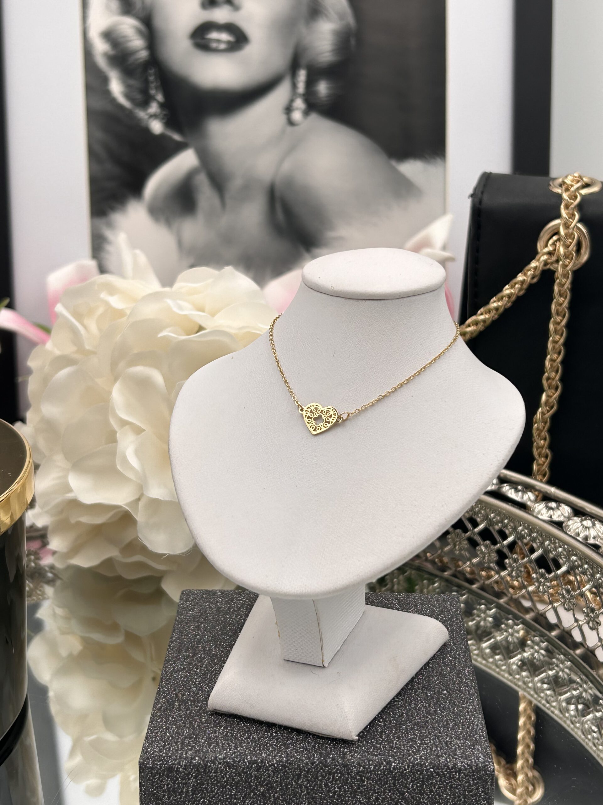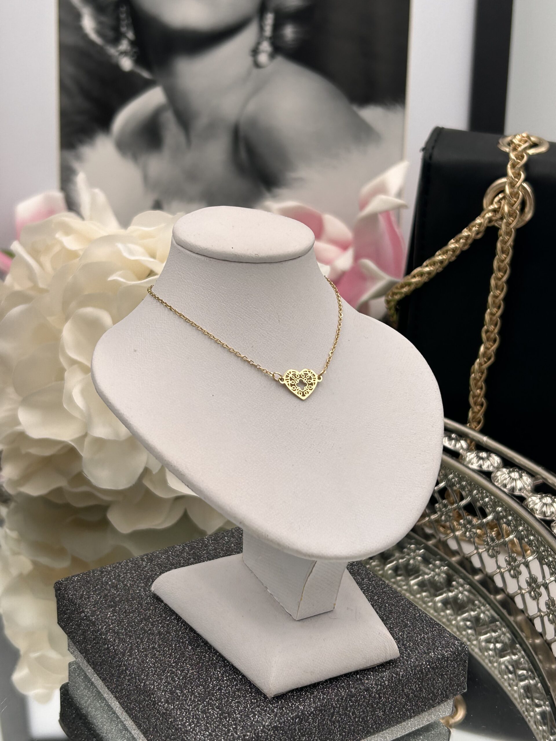 Celebrytka, delikatny łańcuszek, ażurowe serce.