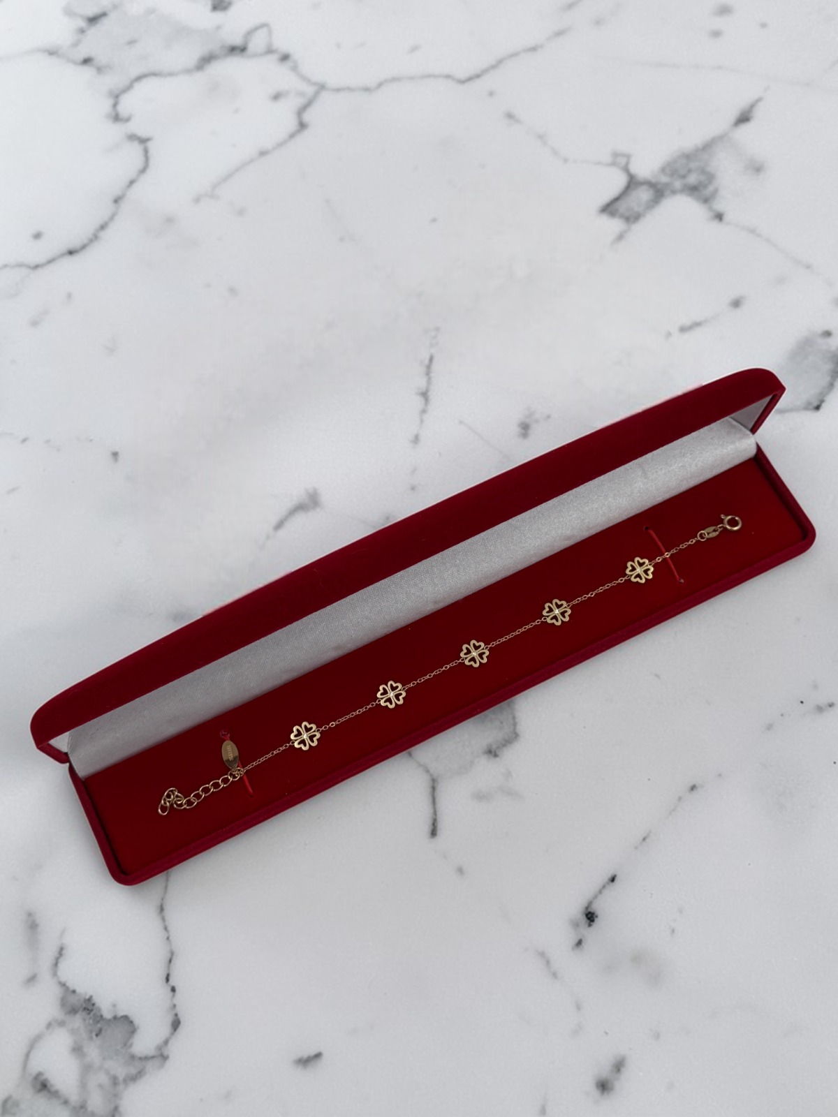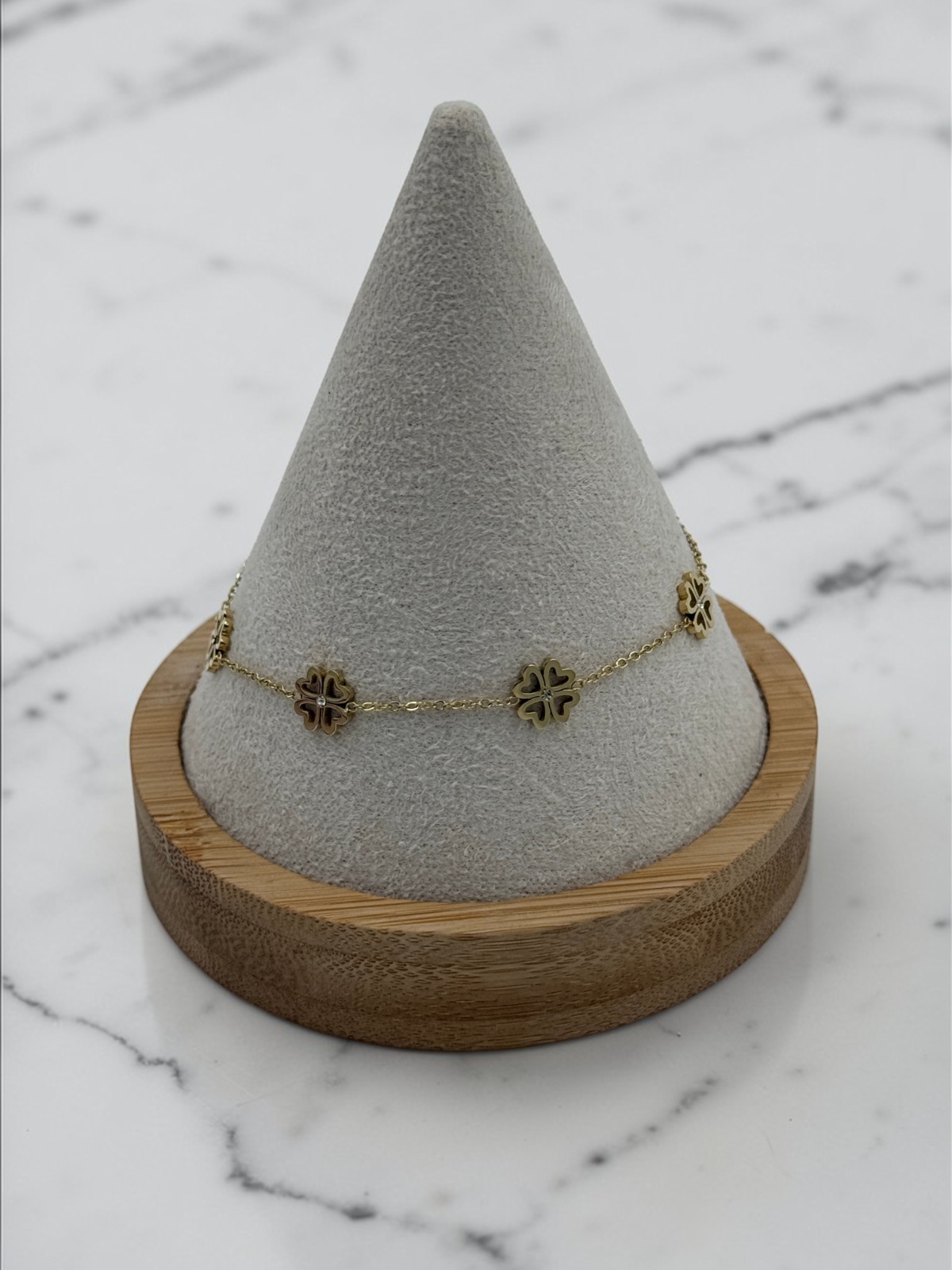 Bransoletka, piękna celebrytka, delikatny łańcuszek – koniczynki, cyrkonia. Kolor złoty.