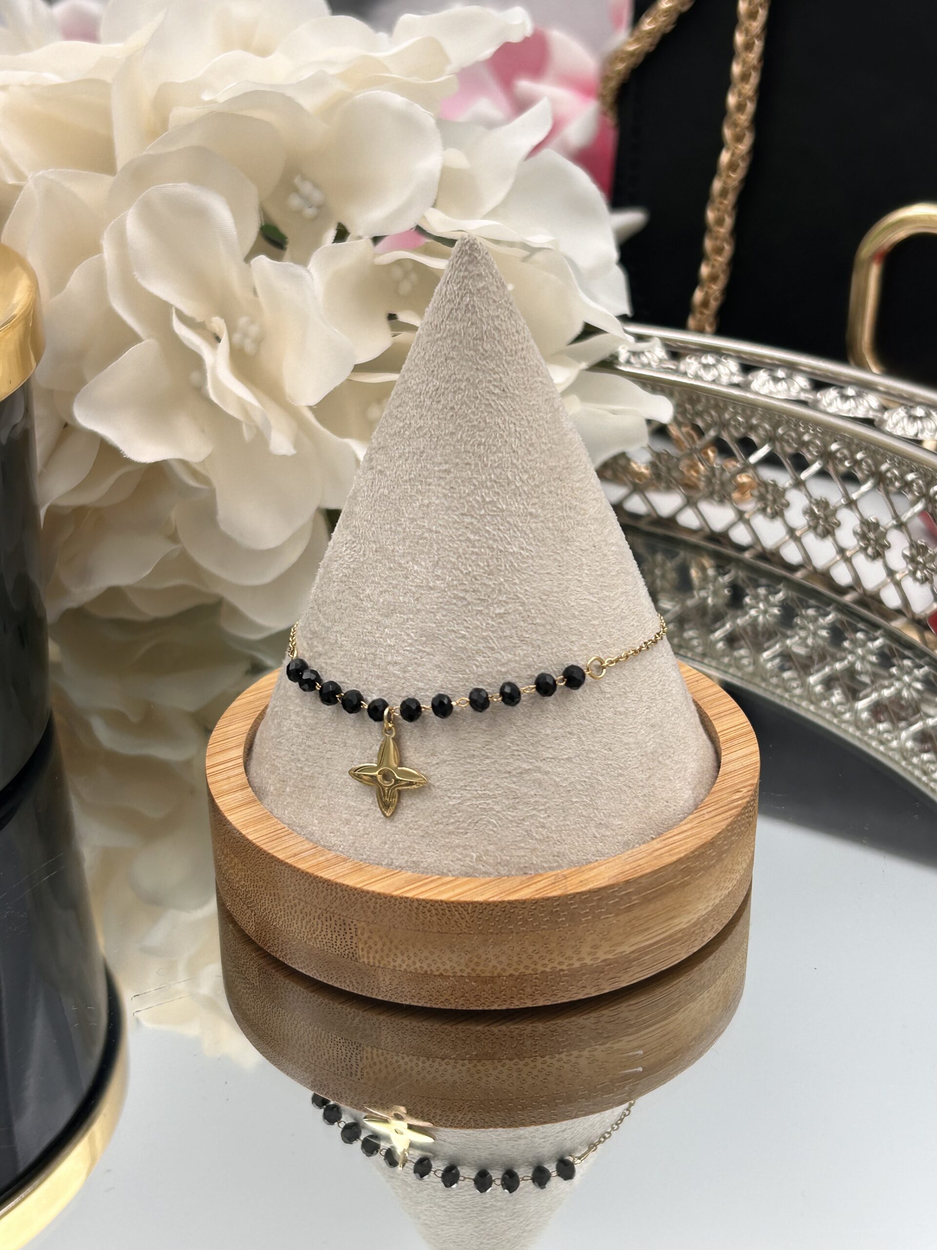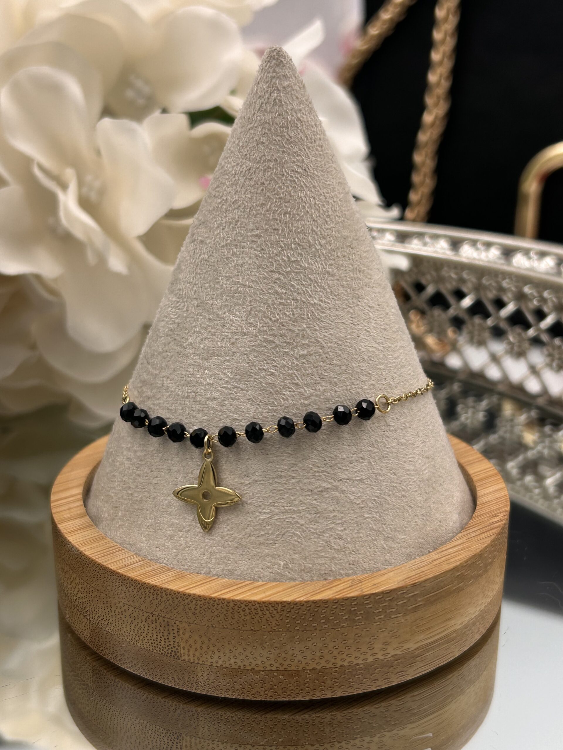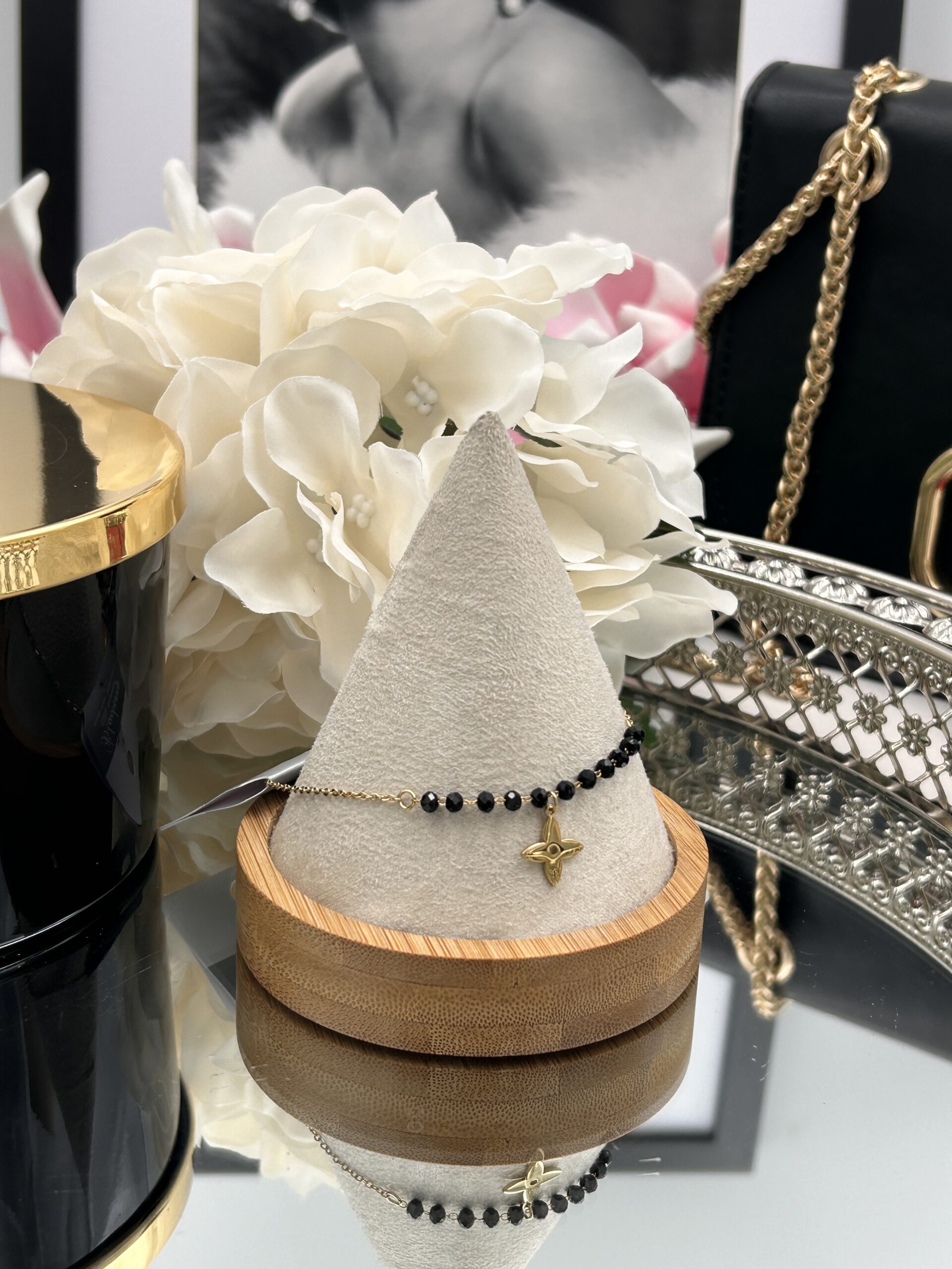 Piękna celebrytka, delikatny łańcuszek. Czarne fasetowane kamienie.  Zawieszka z koniczynką.