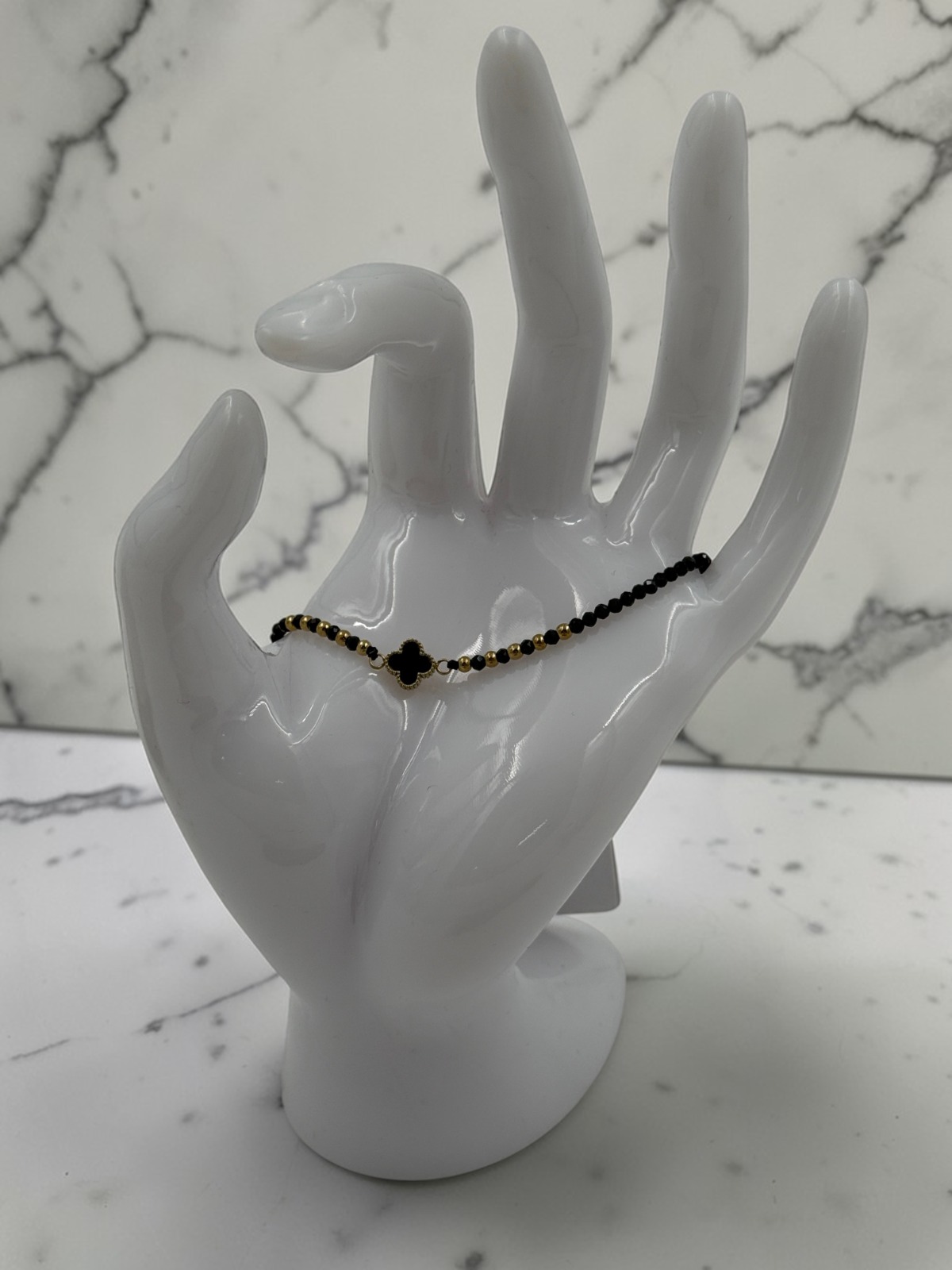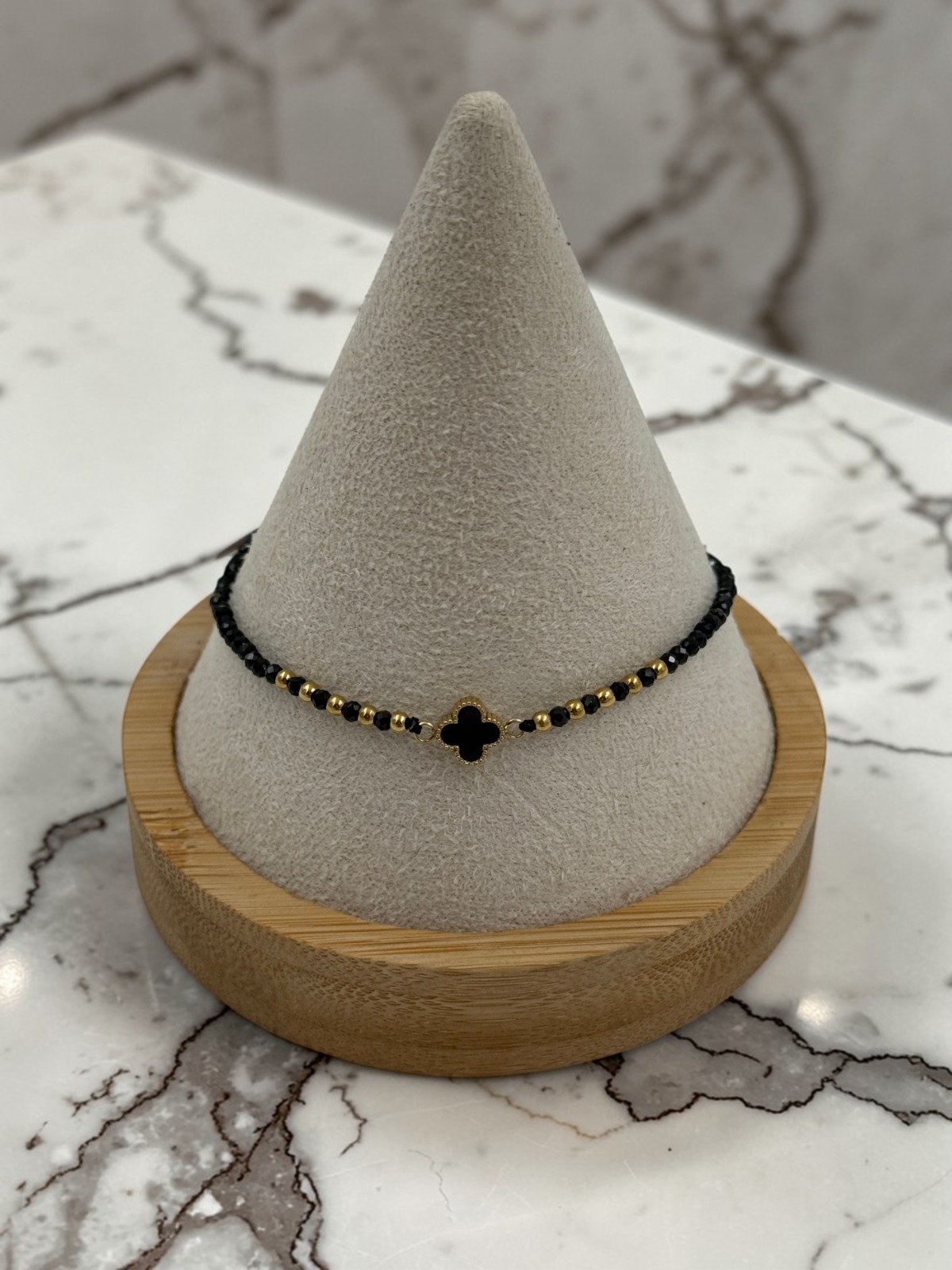 Bransoletka, piękna celebrytka – czarna koniczynka, czarne koraliki. Kolor złoty.