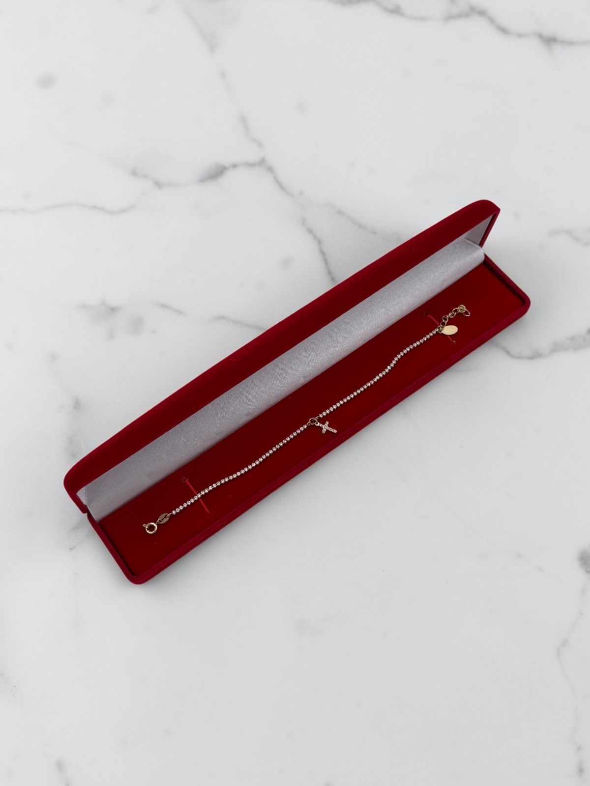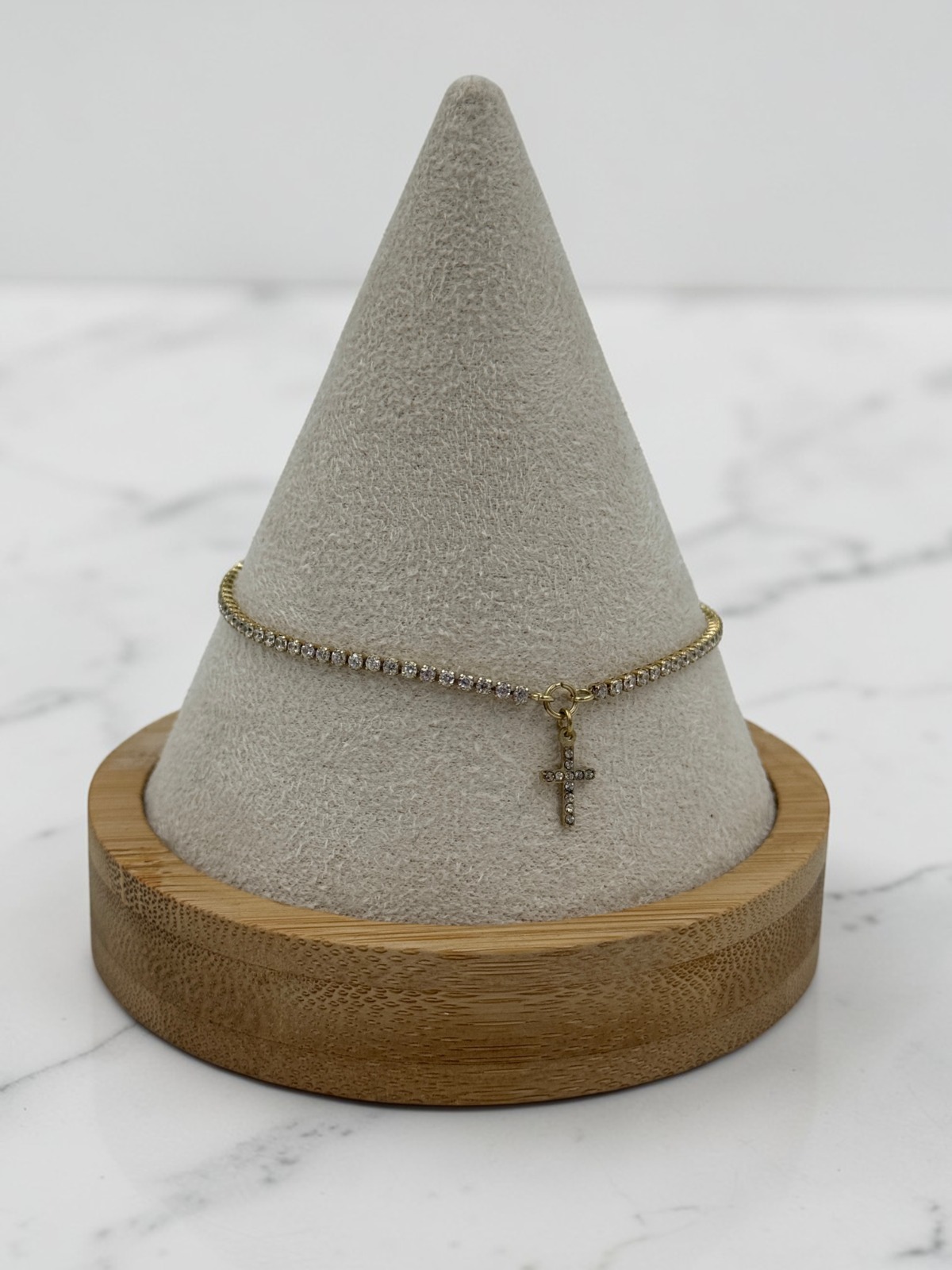 Bransoletka, piękna celebrytka kamienie – cyrkonie, krzyż. Kolor złoty.