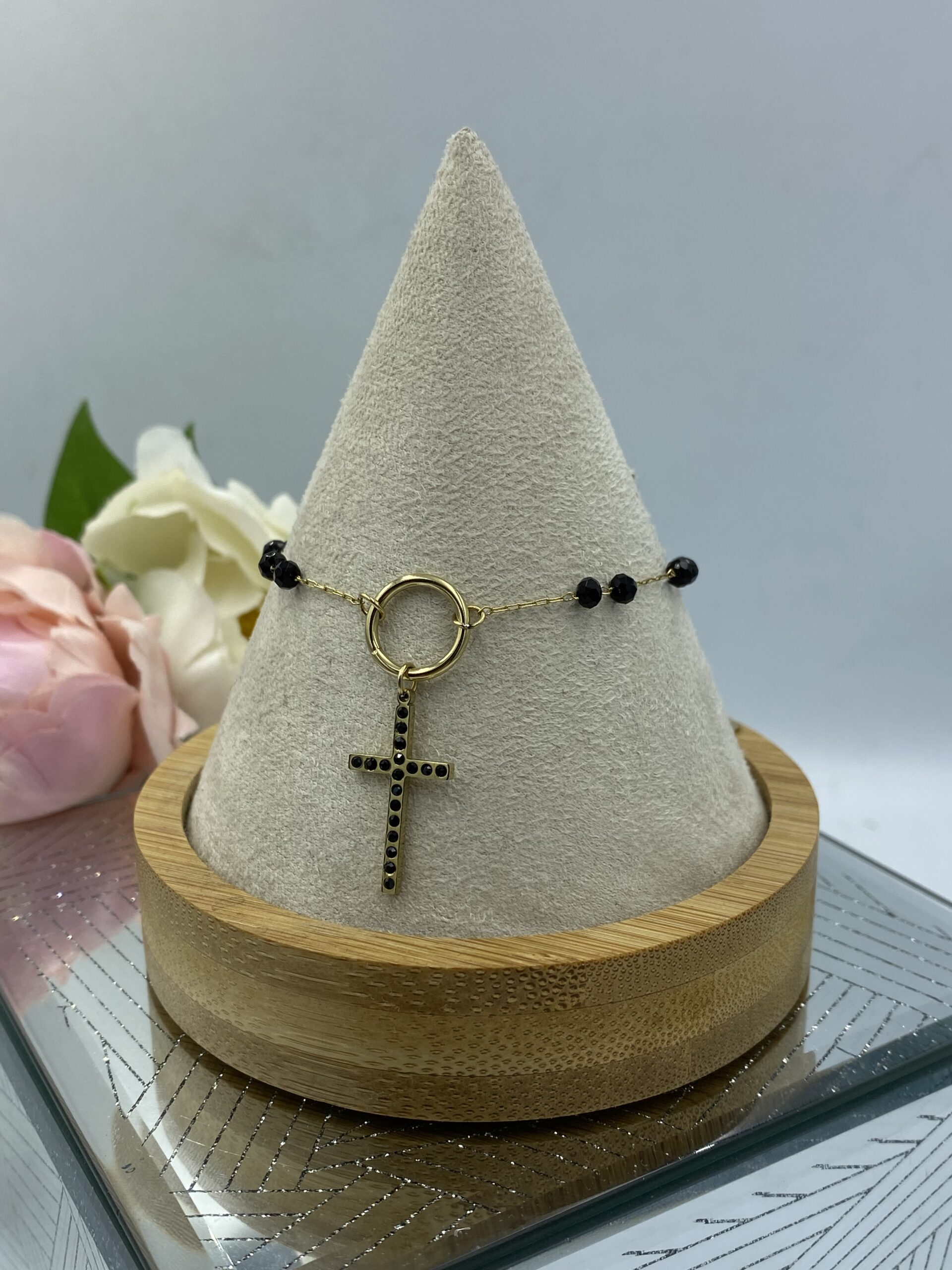 Bransoletka z krzyżykiem wysadzanym czarnymi cyrkoniami. Czarne szlifowane kamienie, delikatna celebrytka.