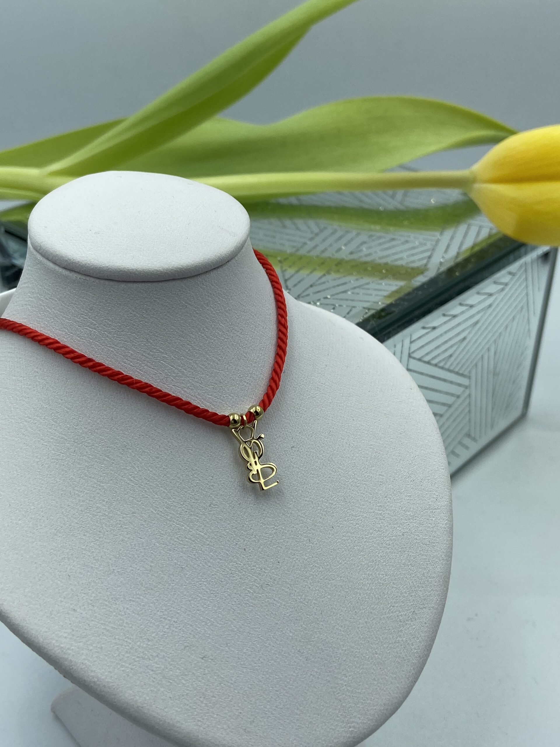 Bransoletka litery YGL, na czerwonym sznurku.
