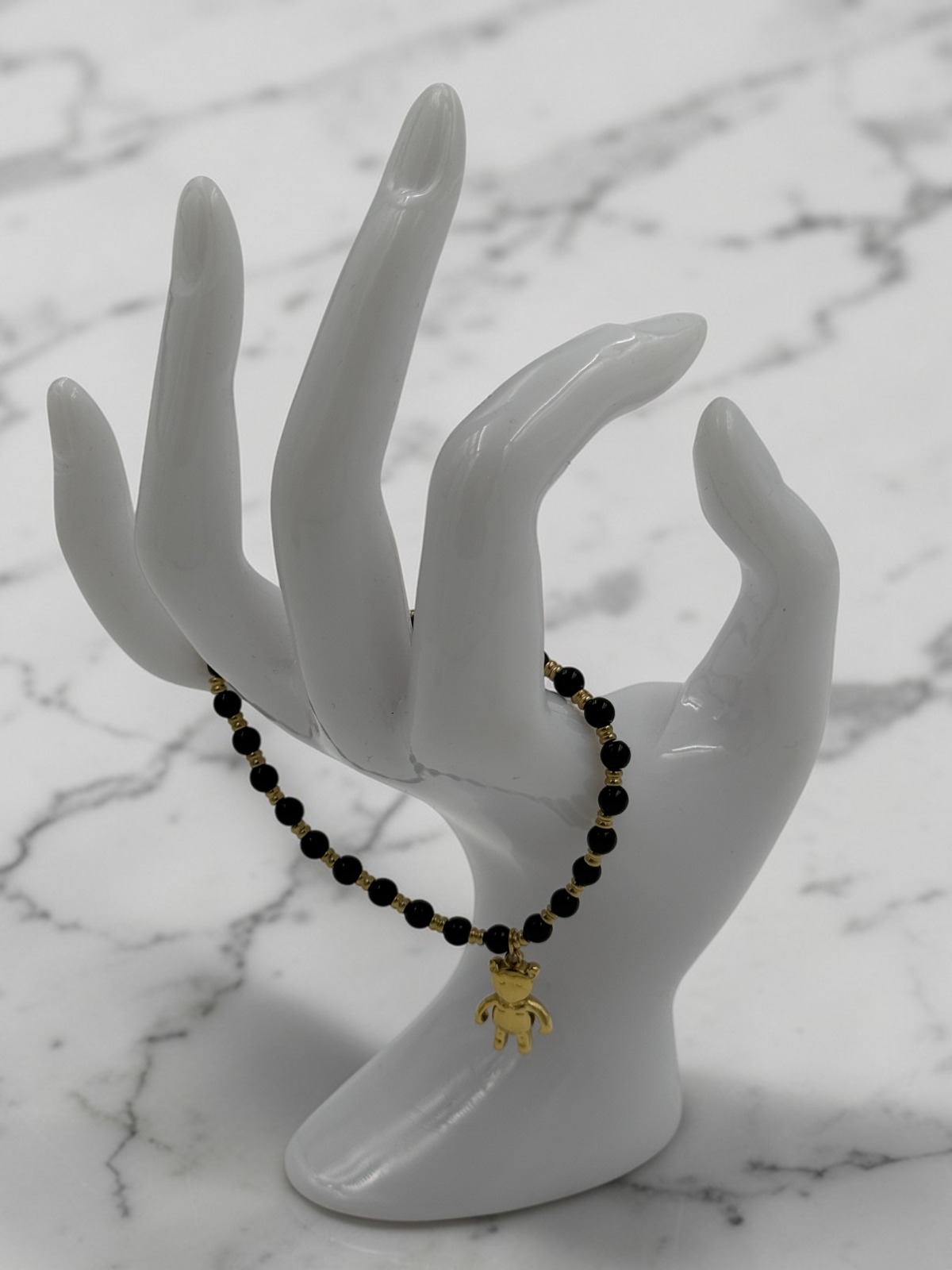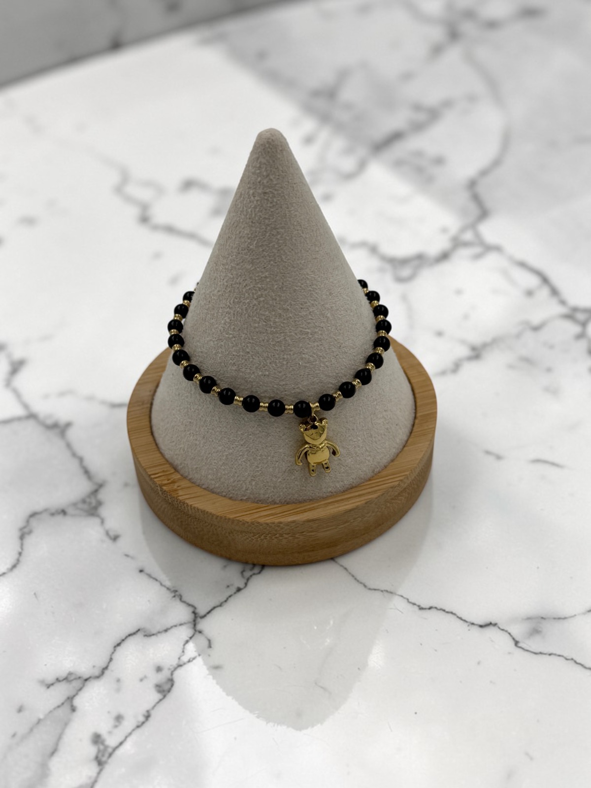 Bransoletka, piękna celebrytka – miś, czarne koraliki. Kolor złoty.