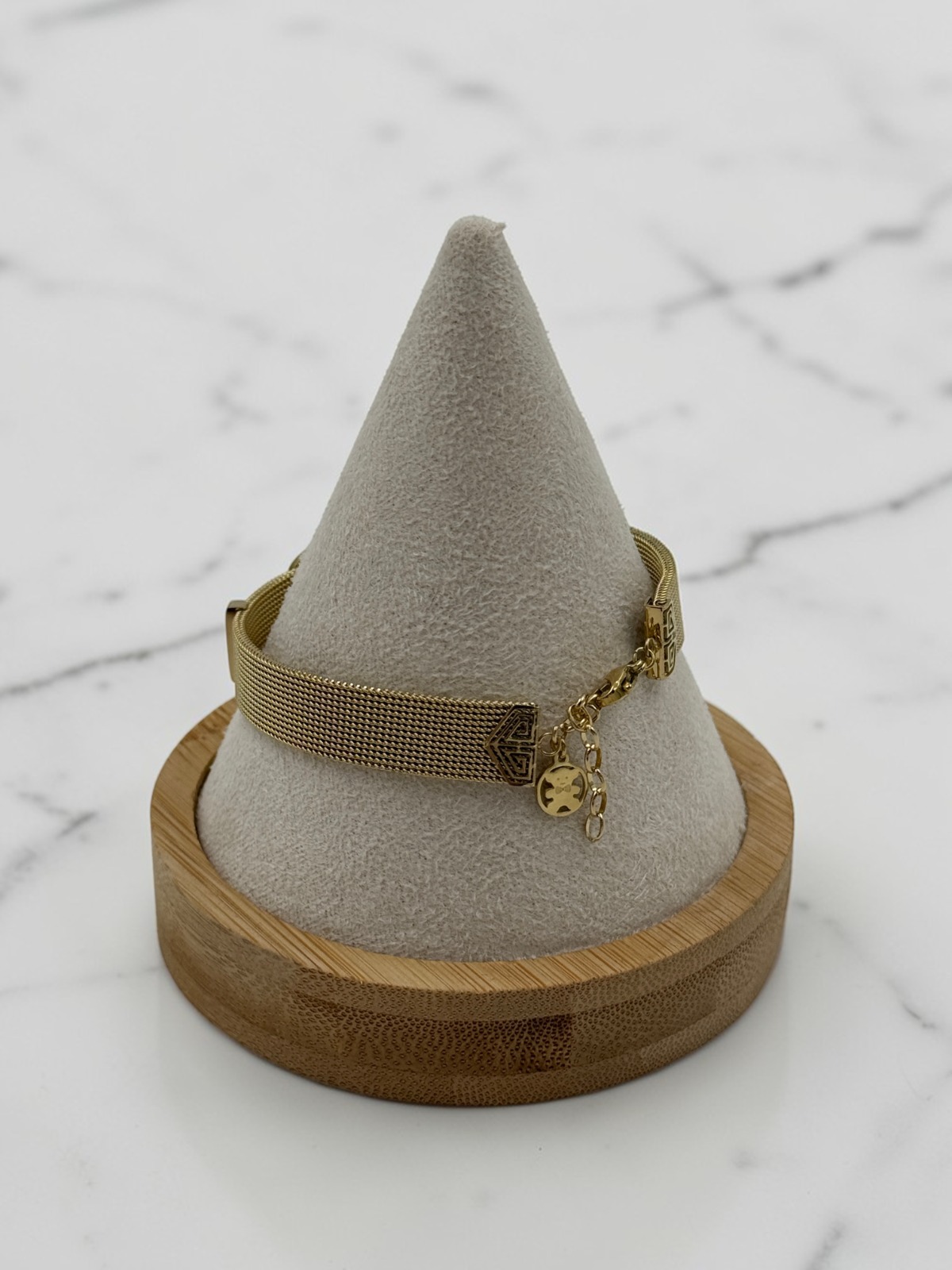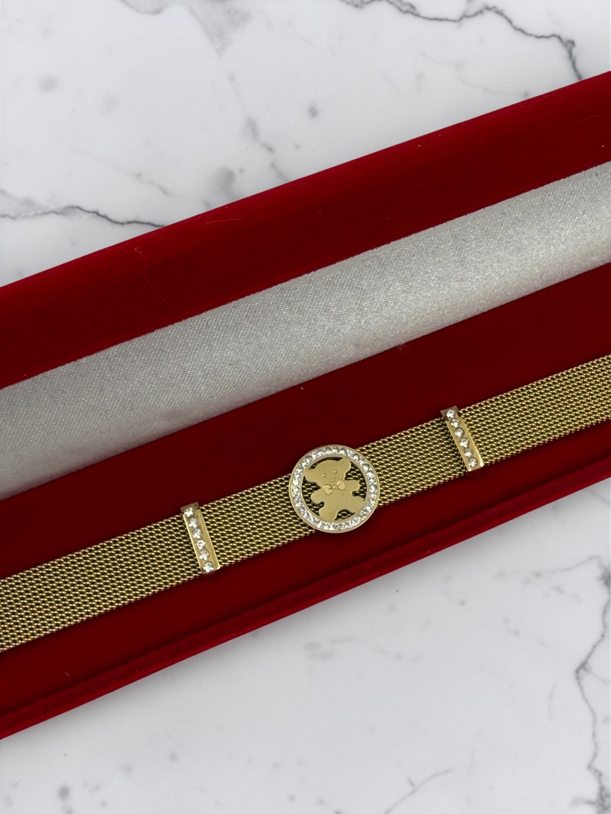 Bransoletkatypu pasek, lejąca – miś w kółku, cyrkonie dookoła. Kolor złoty.