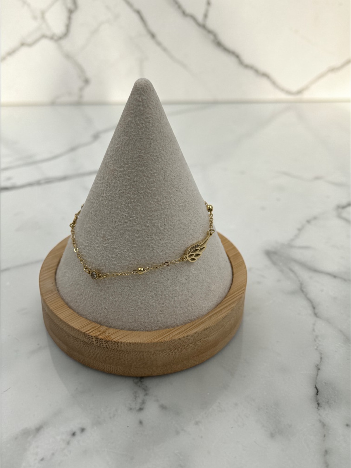 Bransoletka, piękna celebrytka – skrzydło, kulki, cyrkonie. Kolor złoty.