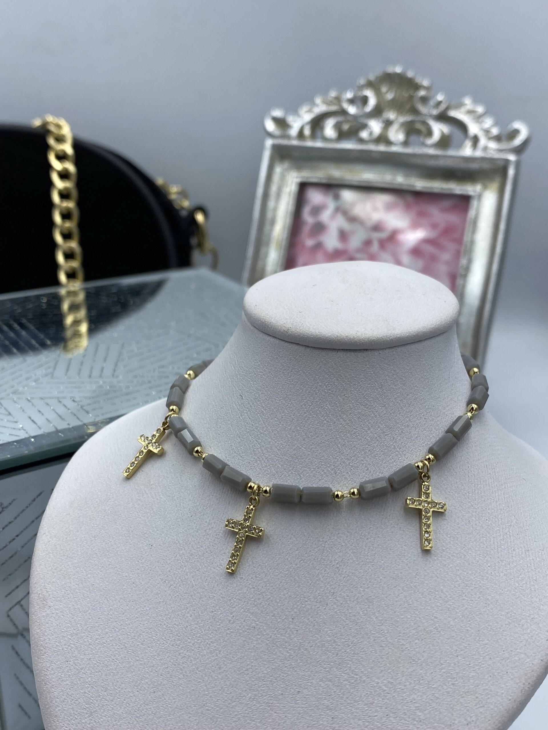 Bransoletka – szare kamyki z zawieszkami. Zawieszki – krzyżyki wysadzane cyrkoniami.