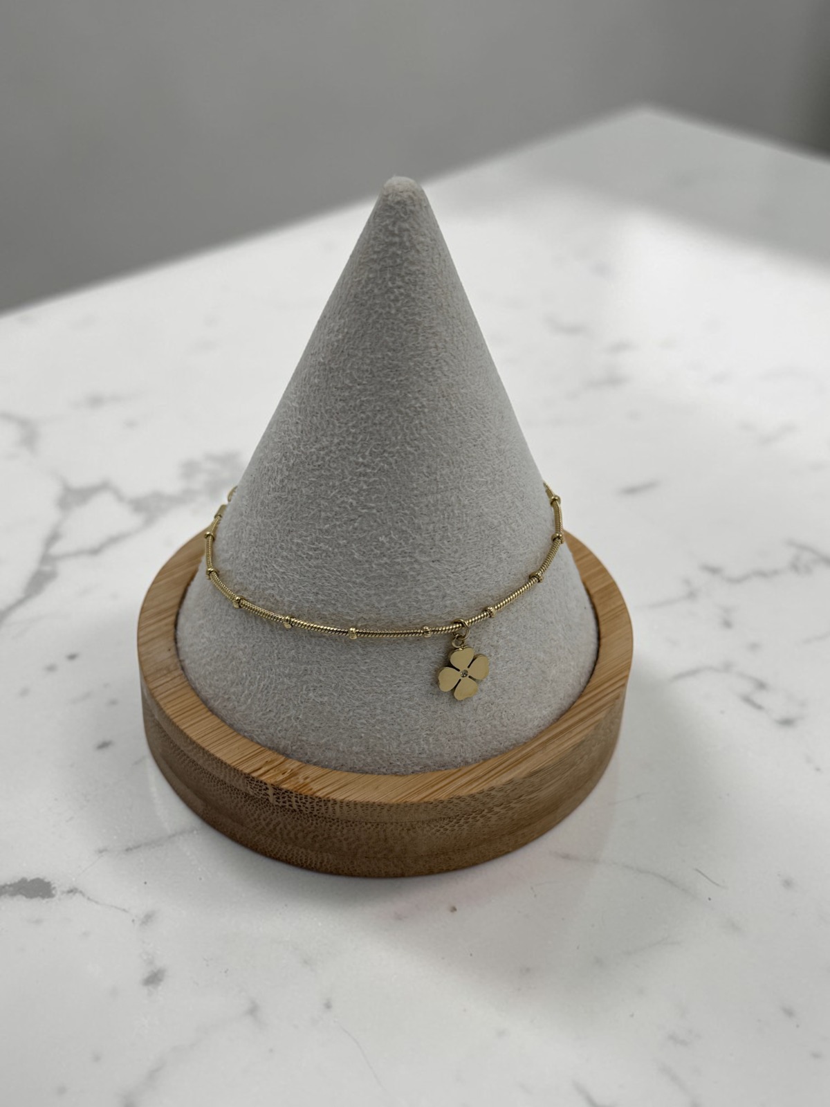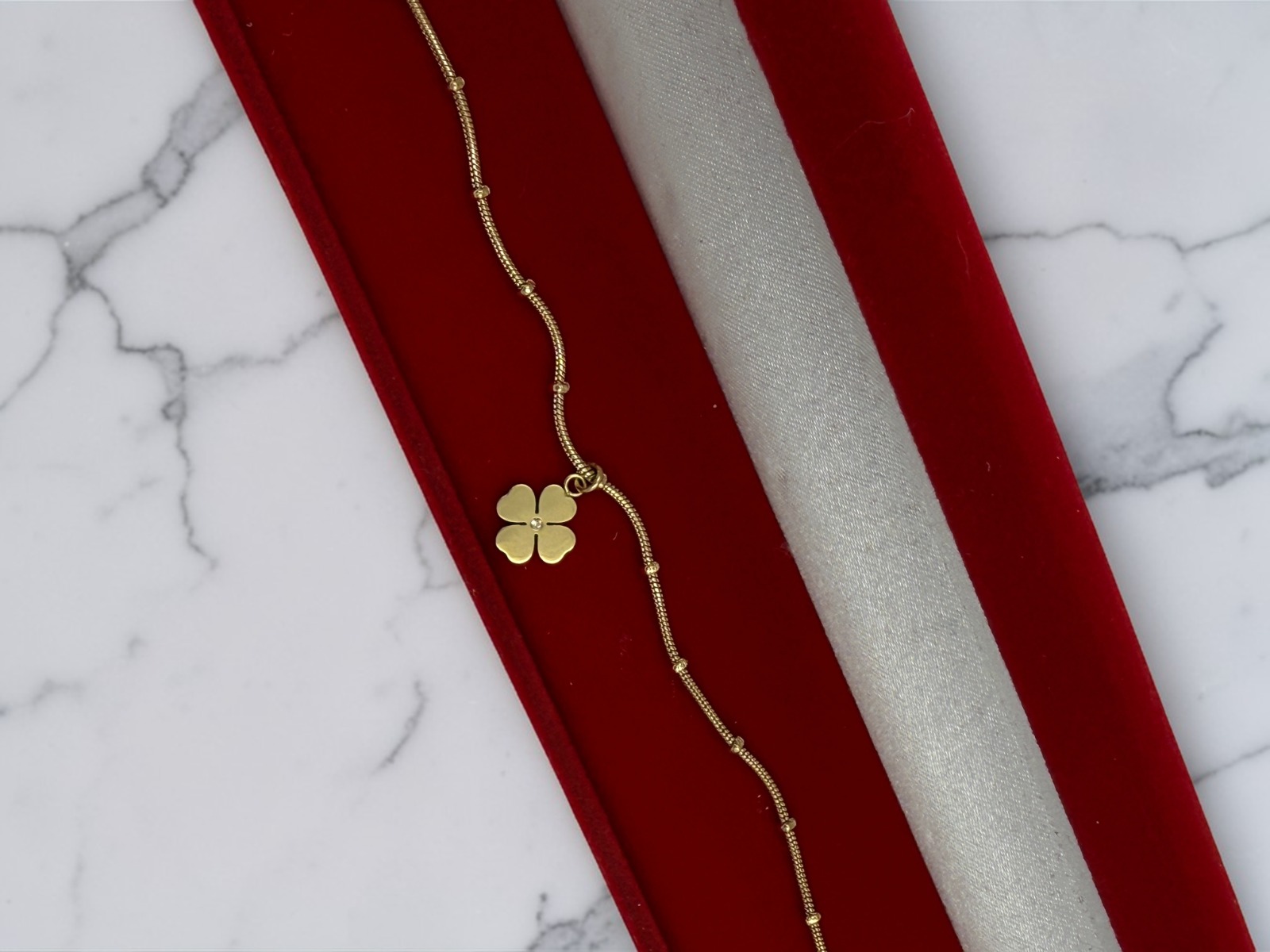 Bransoletka, piękna celebrytka, łańcuszek typu wężyk – kuleczki, koniczynki, cyrkonie. Kolor złoty.