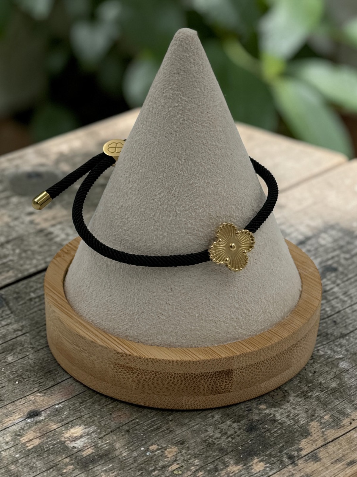 Bransoletka, piękna celebrytka – czarny, solidny sznurek, kwiatek, koniczynka. Kolor złoty.