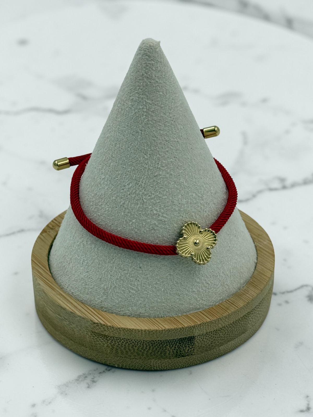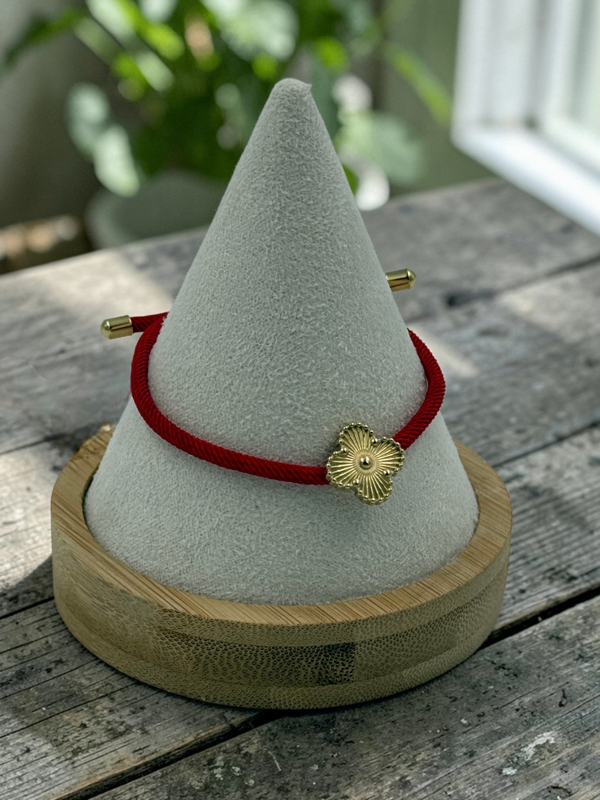 Bransoletka, piękna celebrytka – czerwony, solidny sznurek, kwiatek, koniczynka. Kolor złoty.