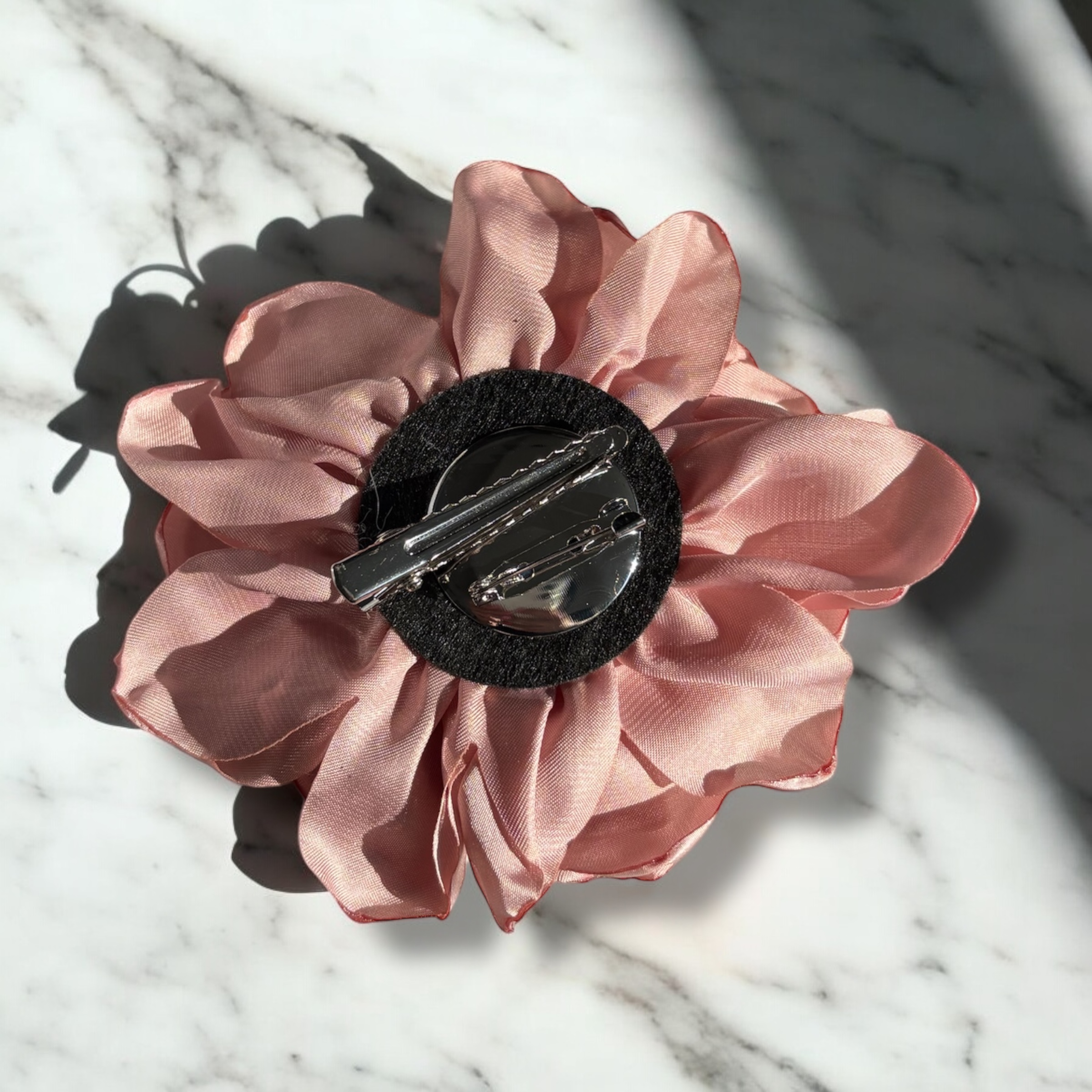 Kwiatek w kolorze brudnego różu, agrafka i wsuwka w kolorze srebrnym.