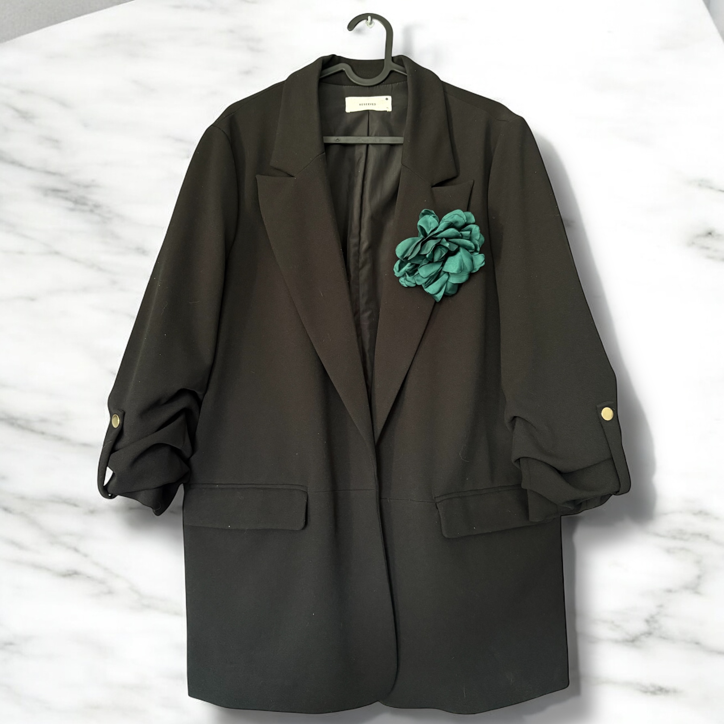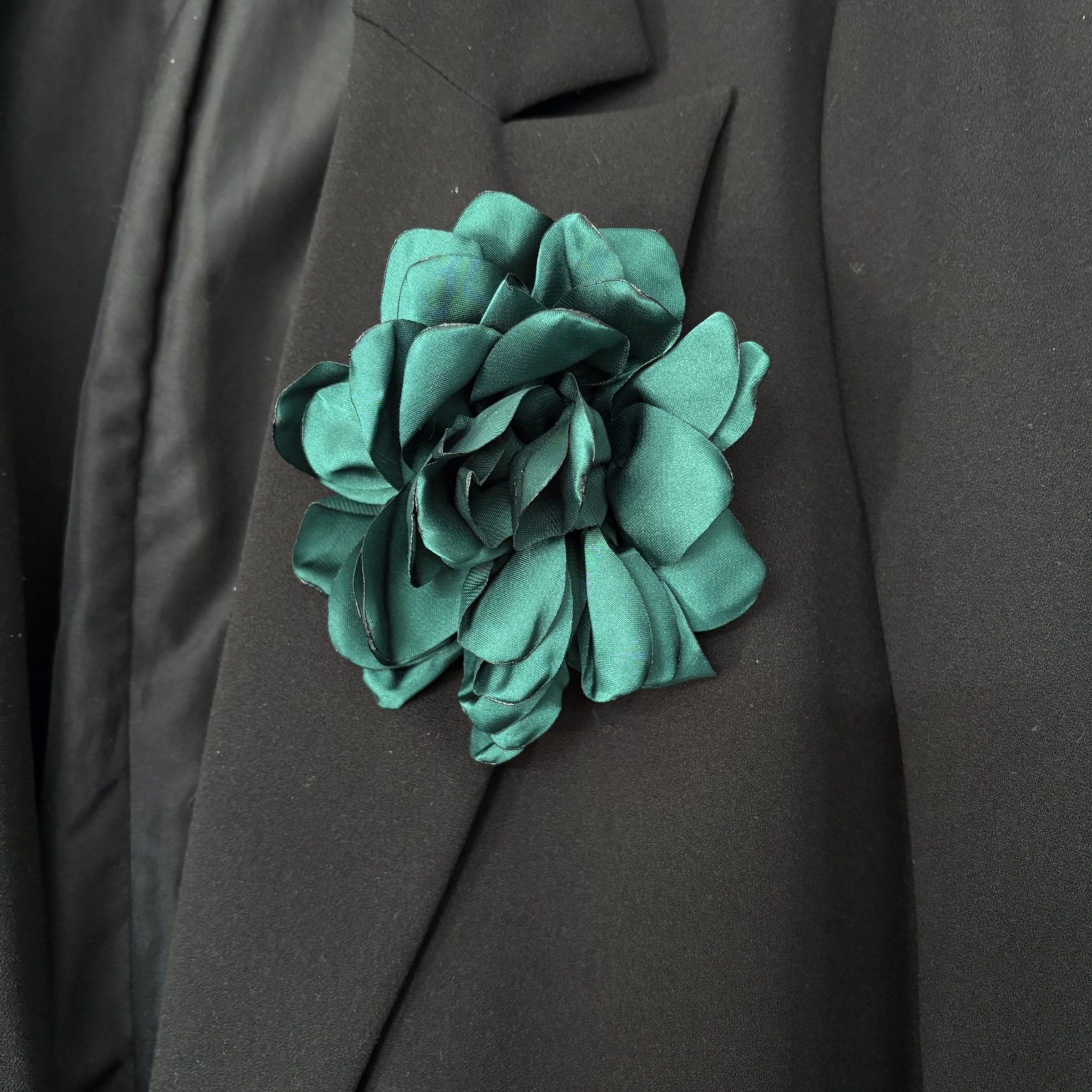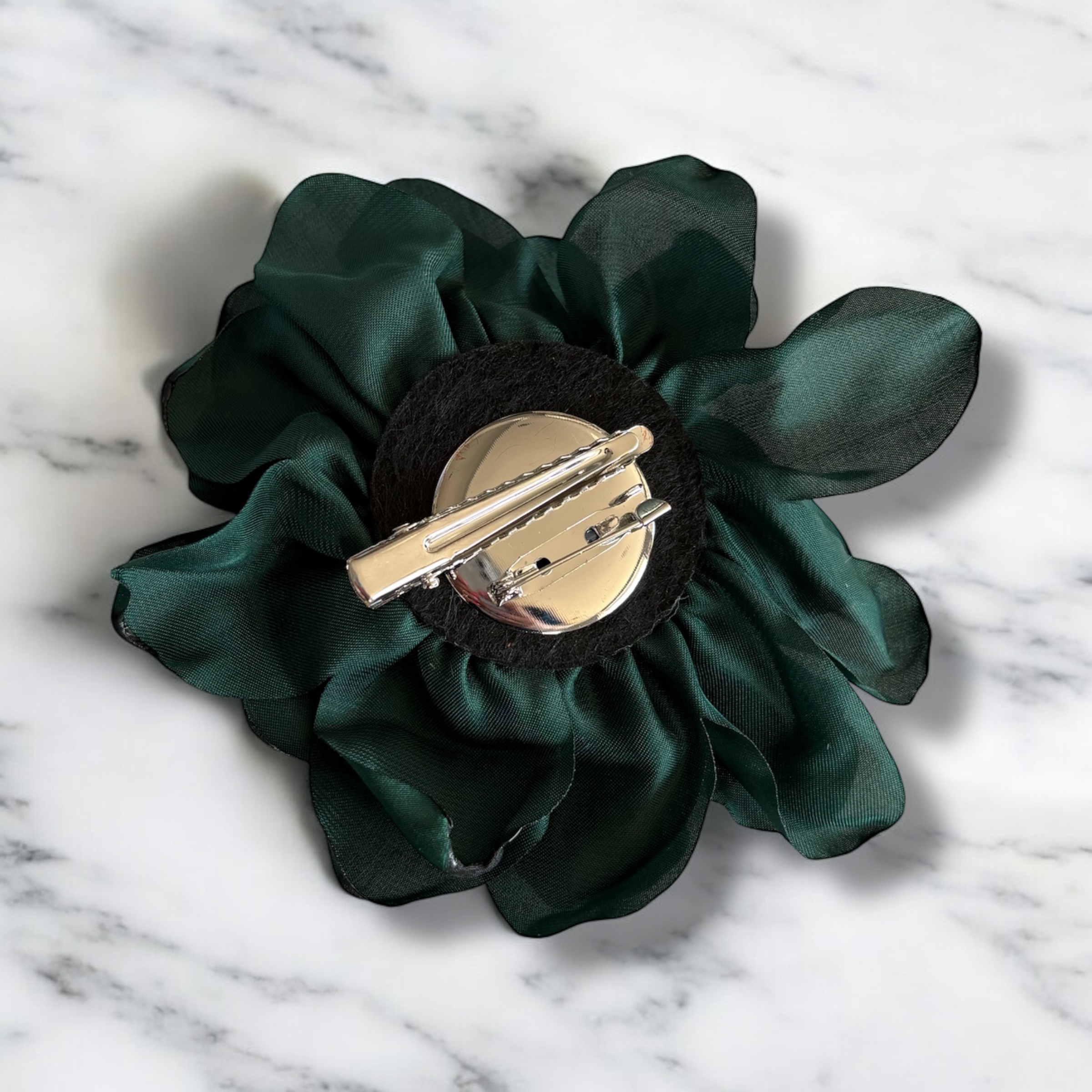 Kwiatek w kolorze szmaragdowym, agrafka i wsuwka w kolorze srebrnym.