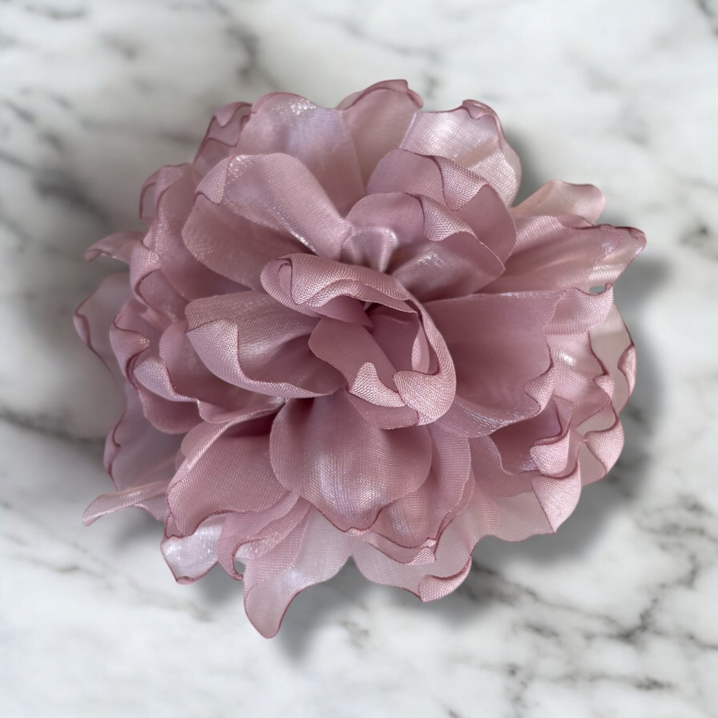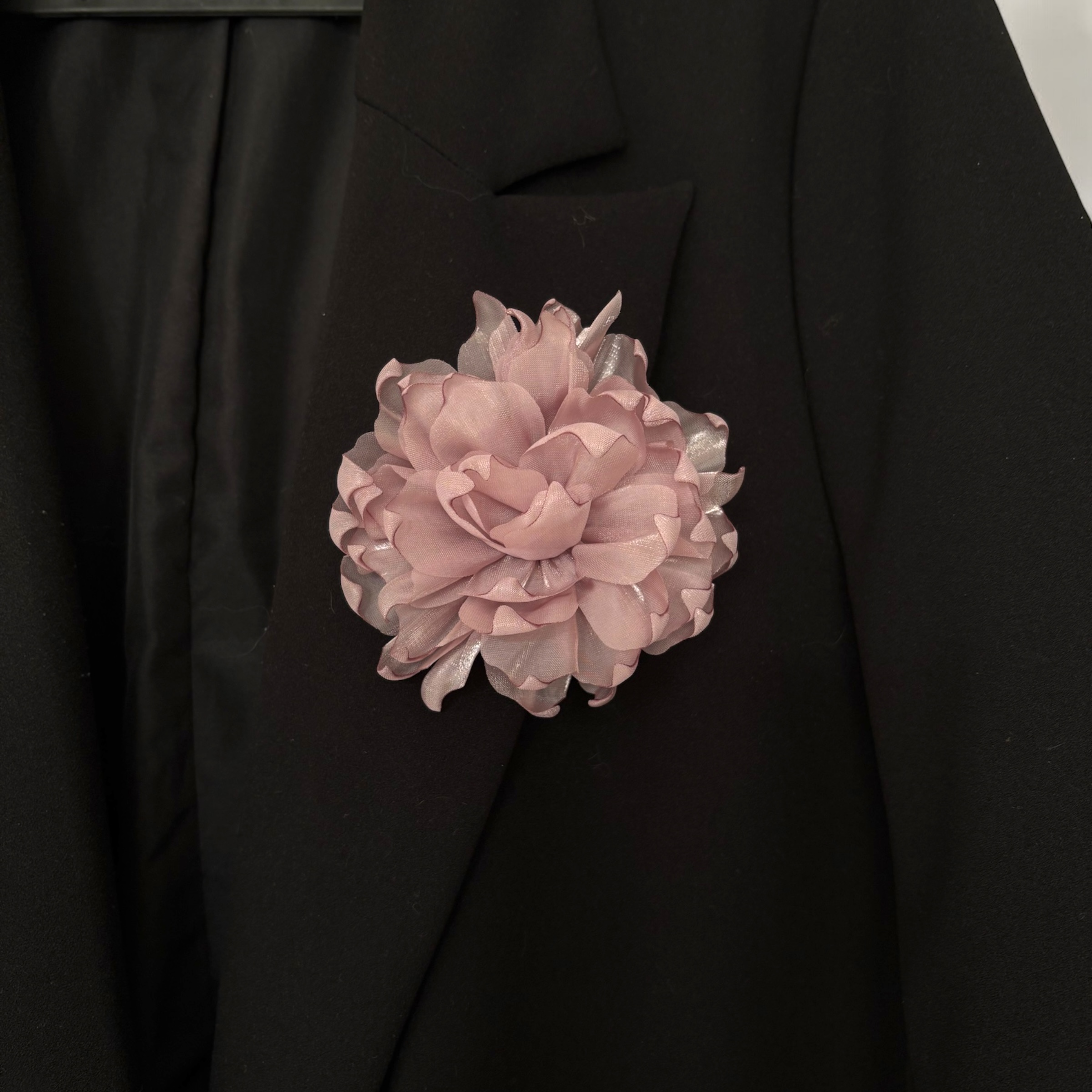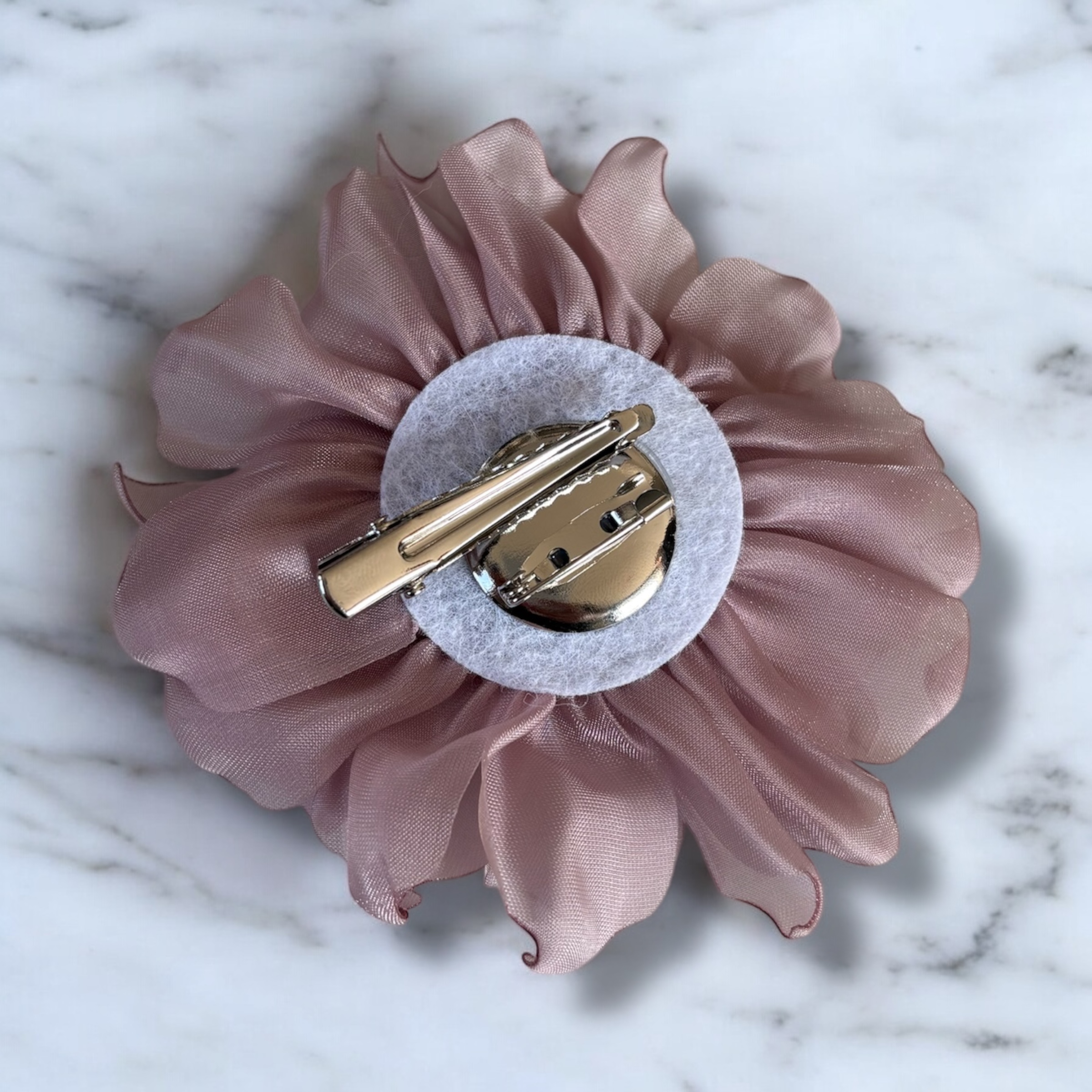 Kwiatek w kolorze brudnym fioletowym, agrafka i wsuwka w kolorze srebrnym.