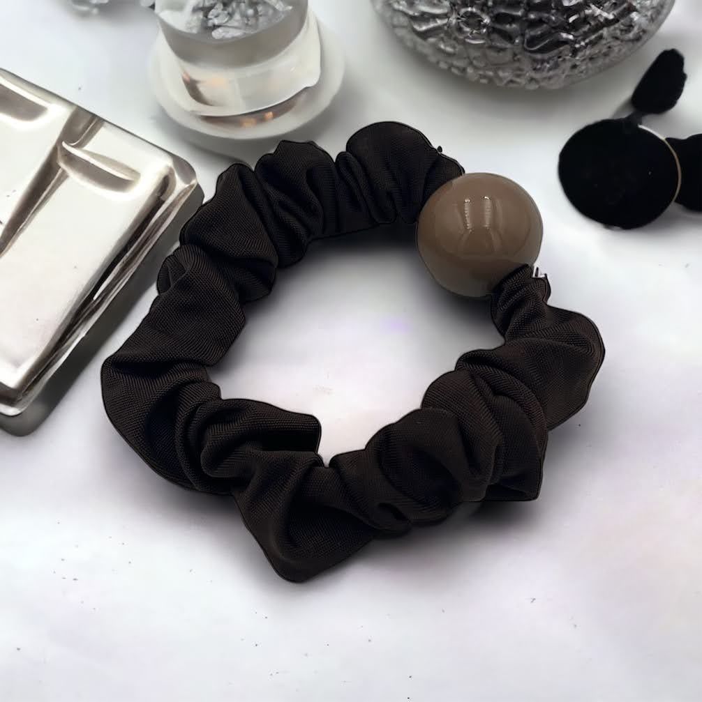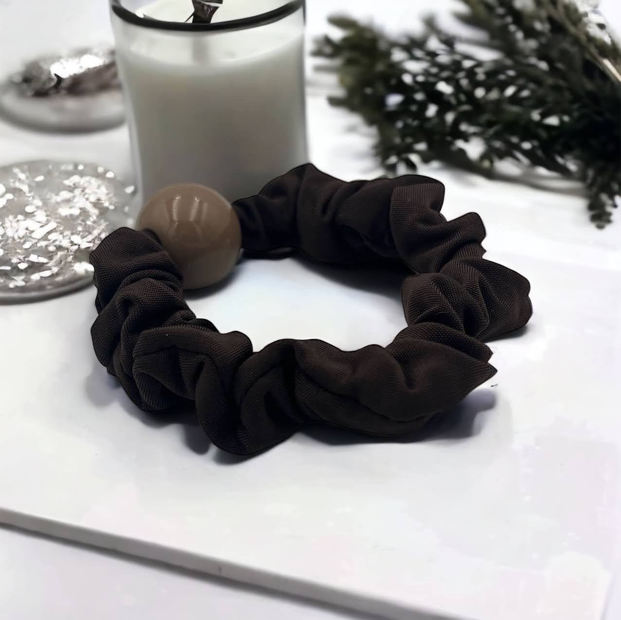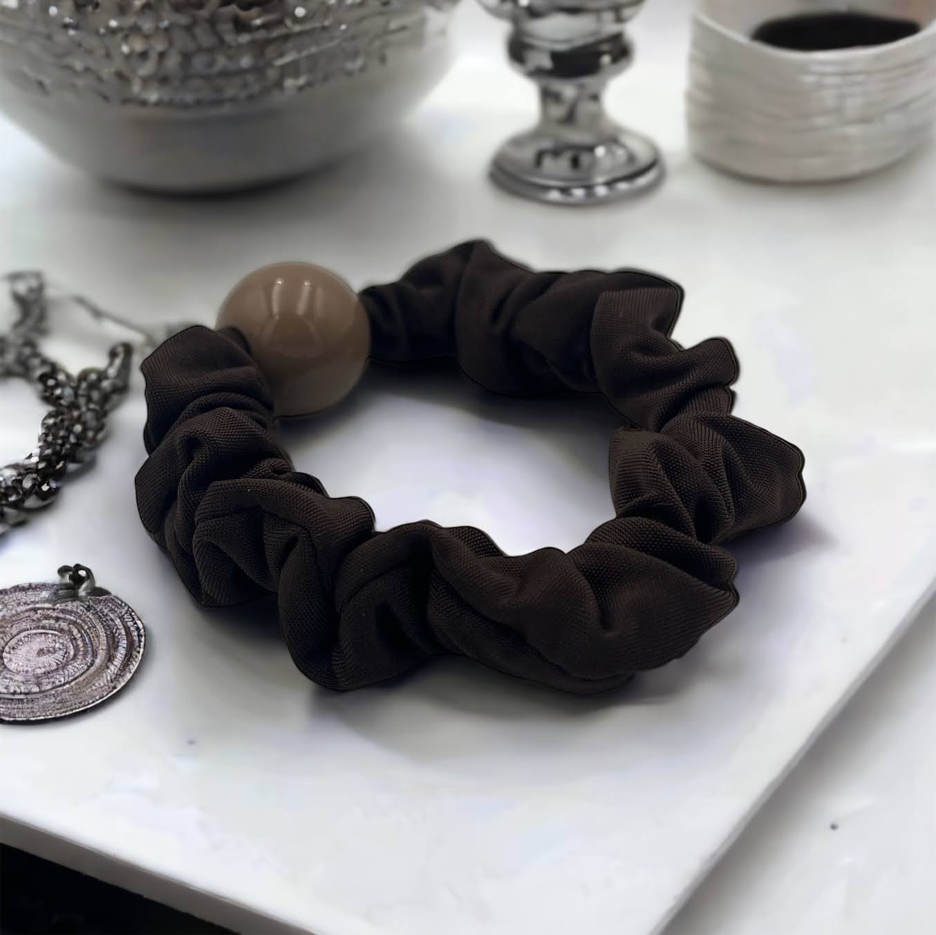 Gumka do włosów typu scrunchie w kolorze brązowym z elementem ozdobnym.