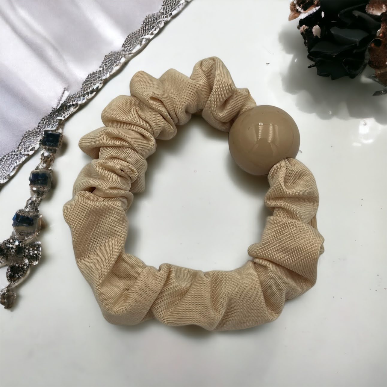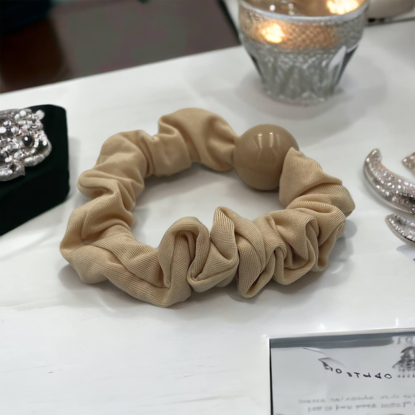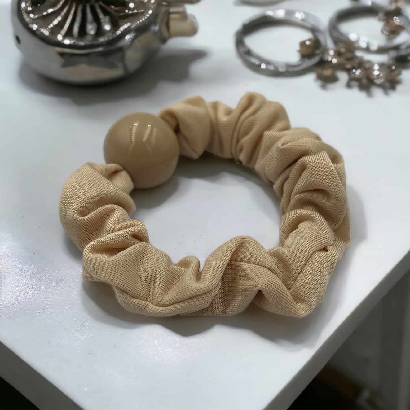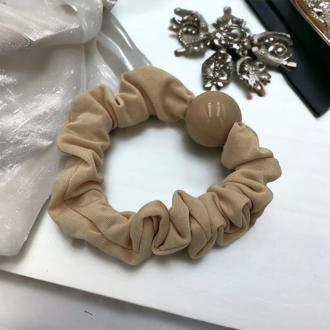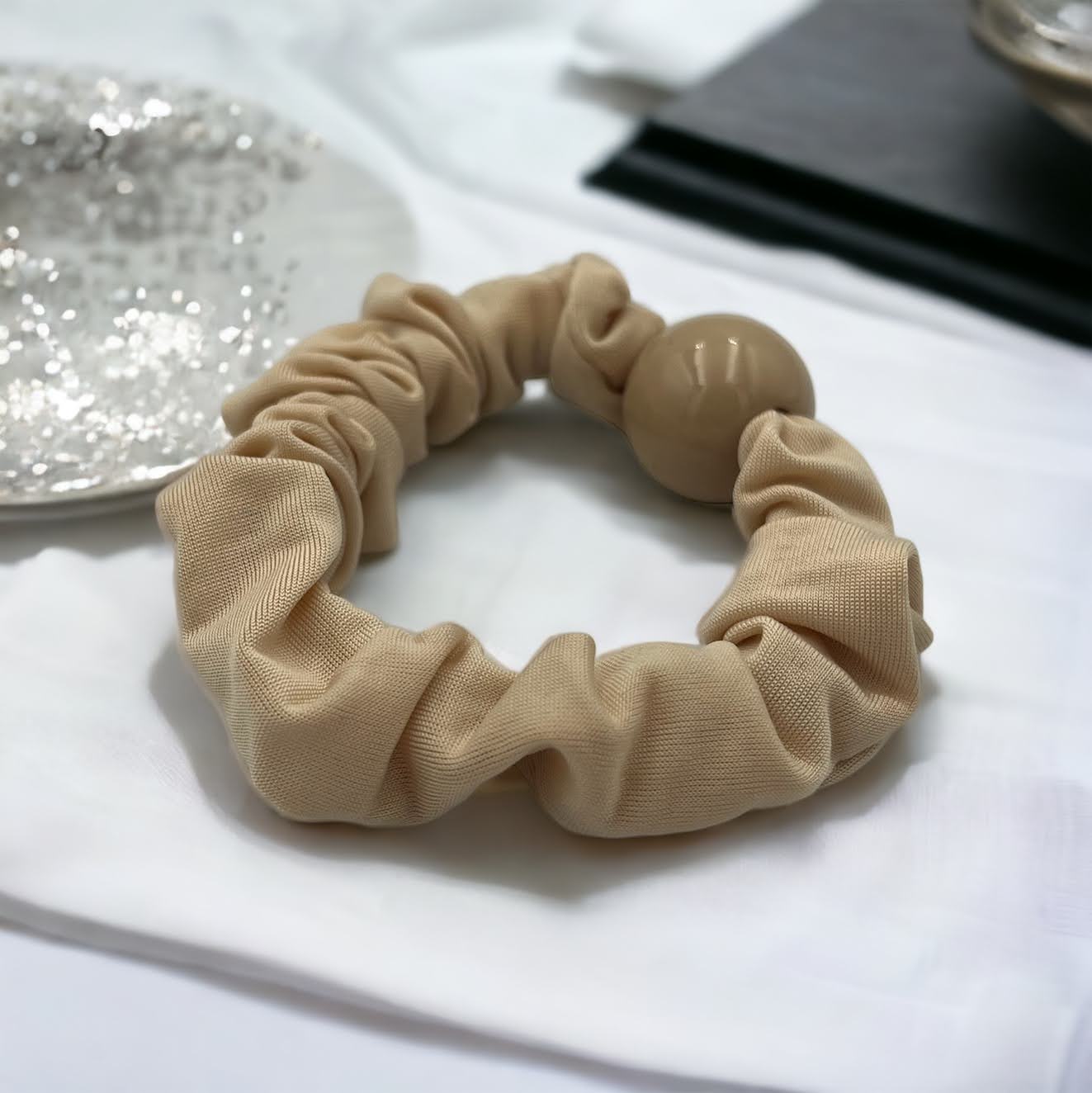Gumka do włosów typu scrunchie w kolorze beżowym z elementem ozdobnym.