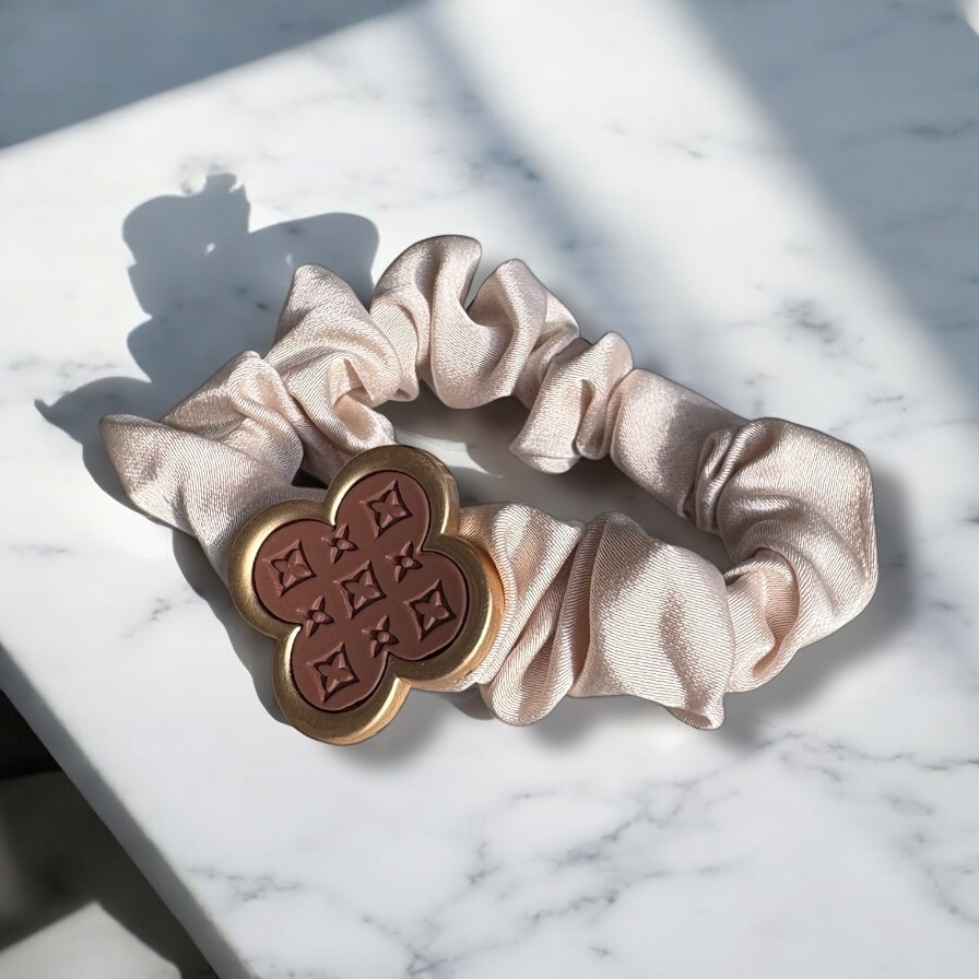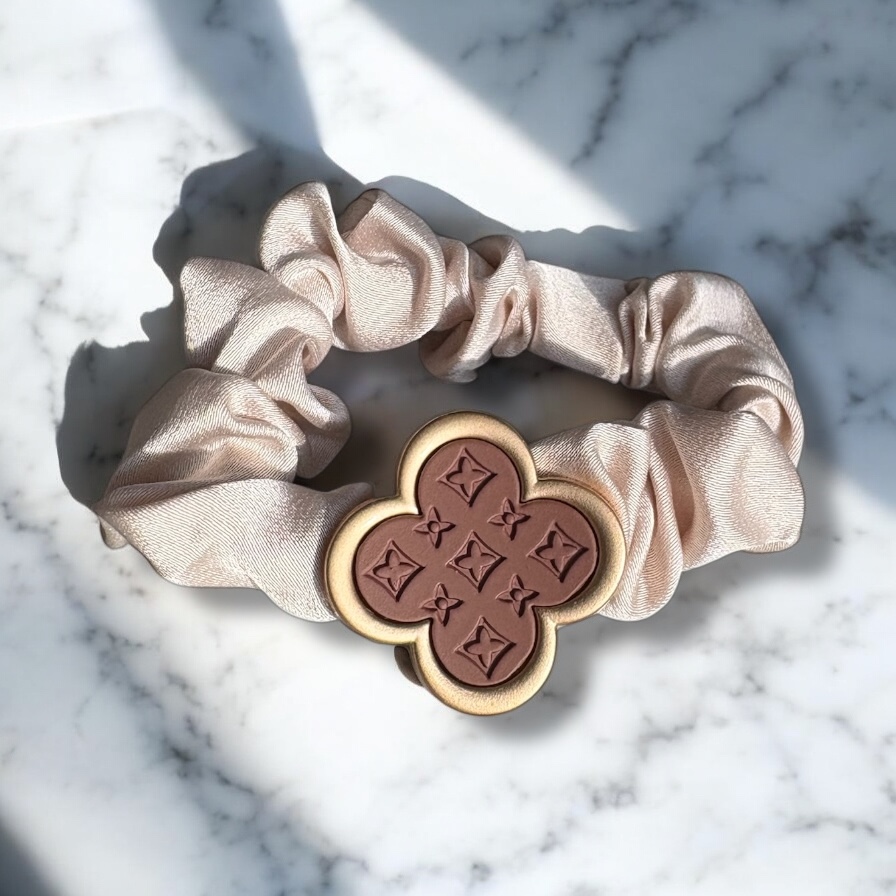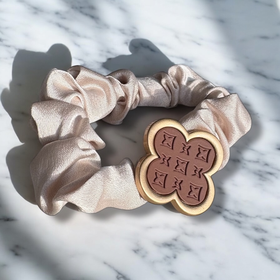 Gumka do włosów typu scrunchie w kolorze beżowym z elementem ozdobnym – koniczynka.