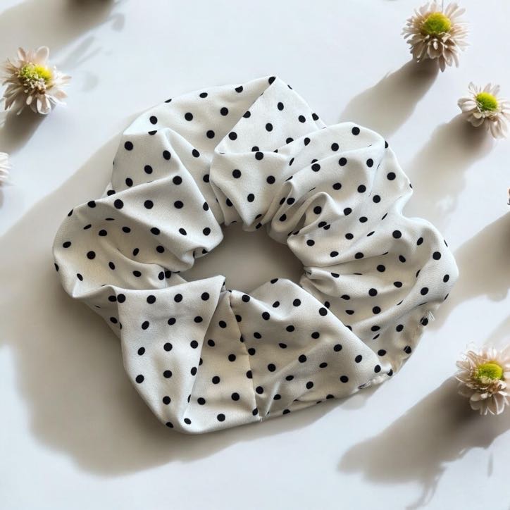 Gumka do włosów typu scrunchie w kolorze białym w czarne kropki.