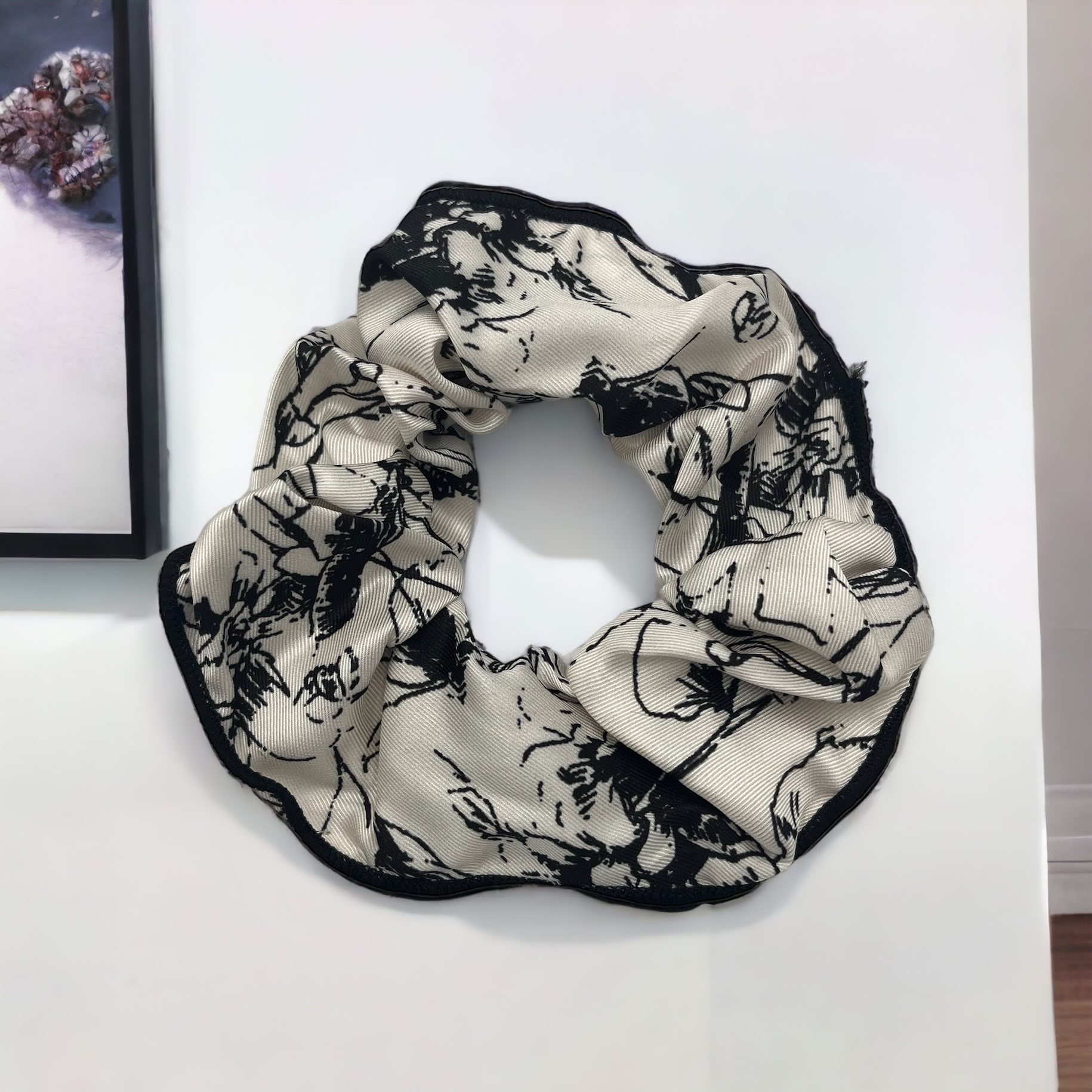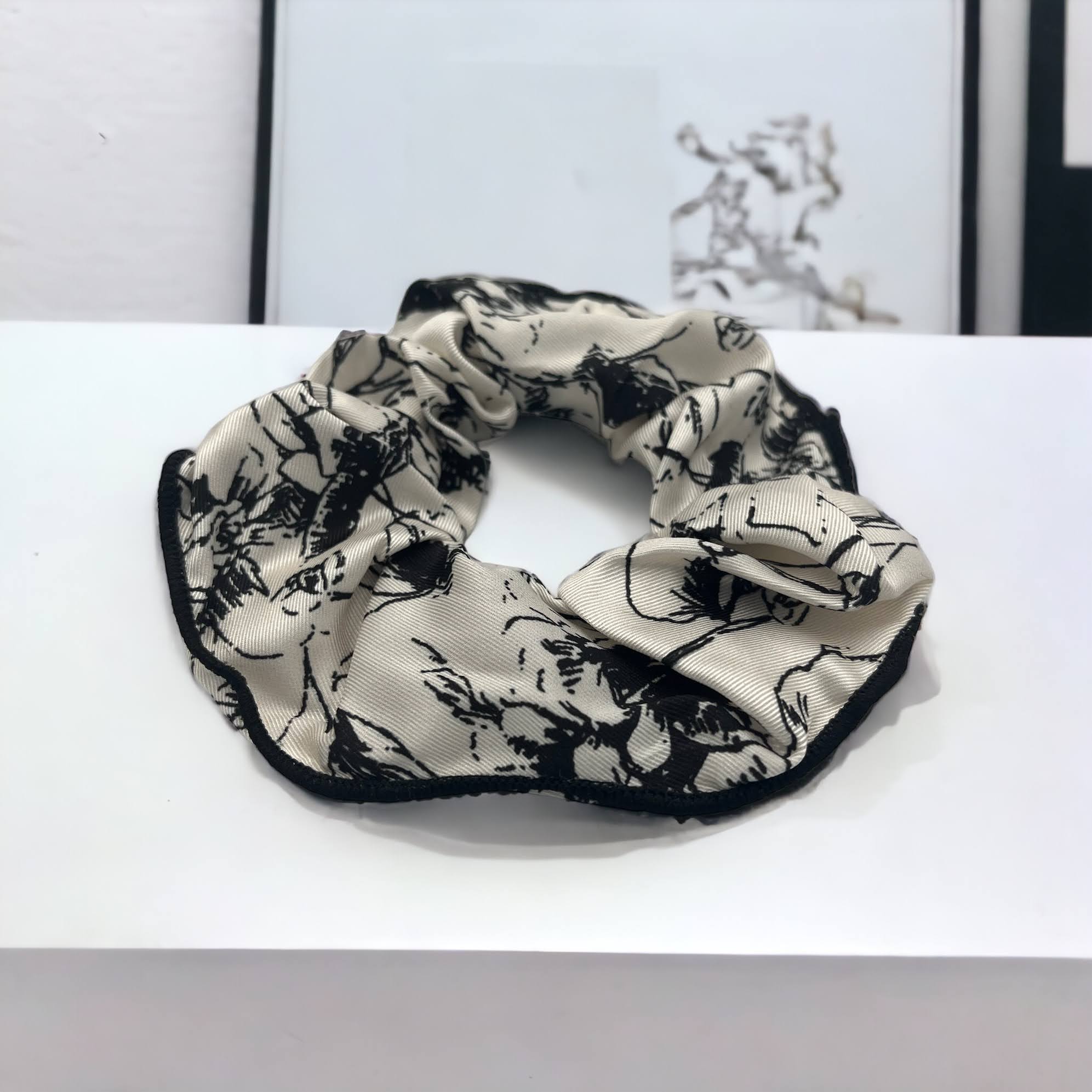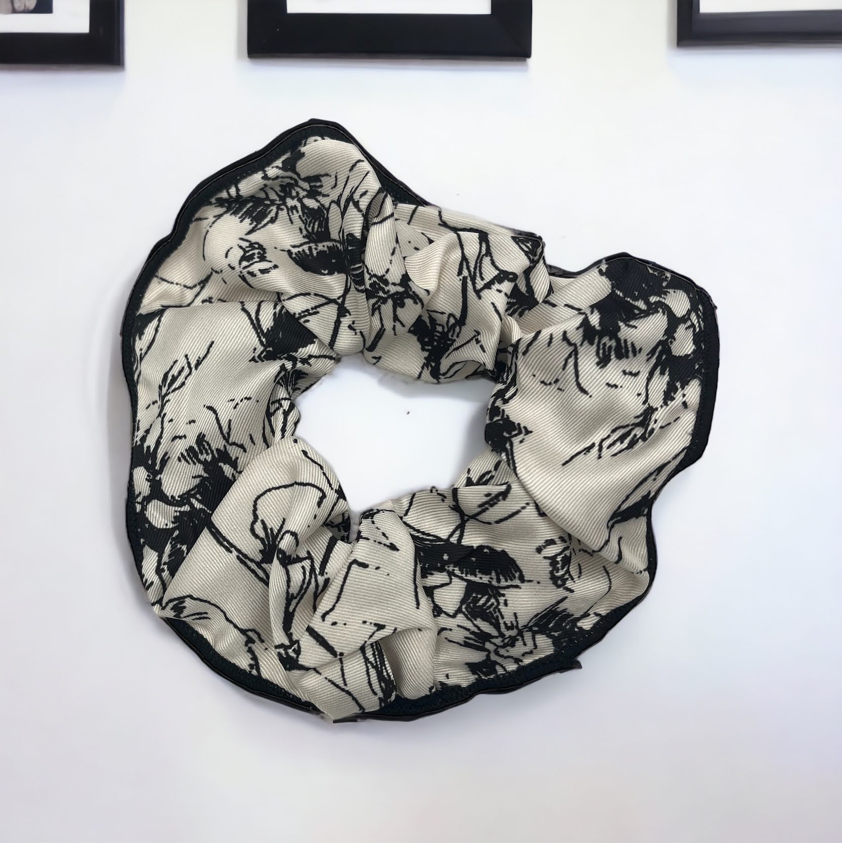 Gumka do włosów typu scrunchie w kolorze białym, z motywem w czarne kwiatki.