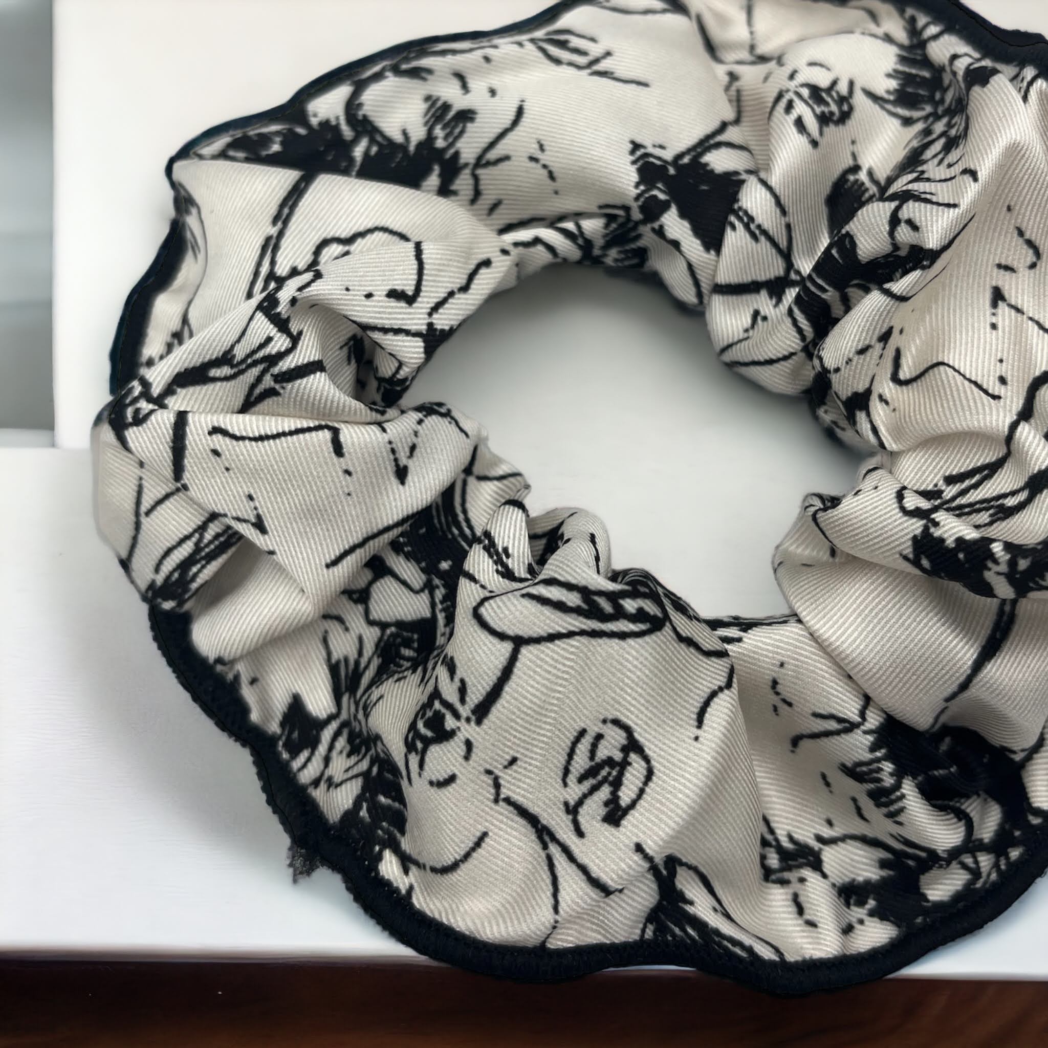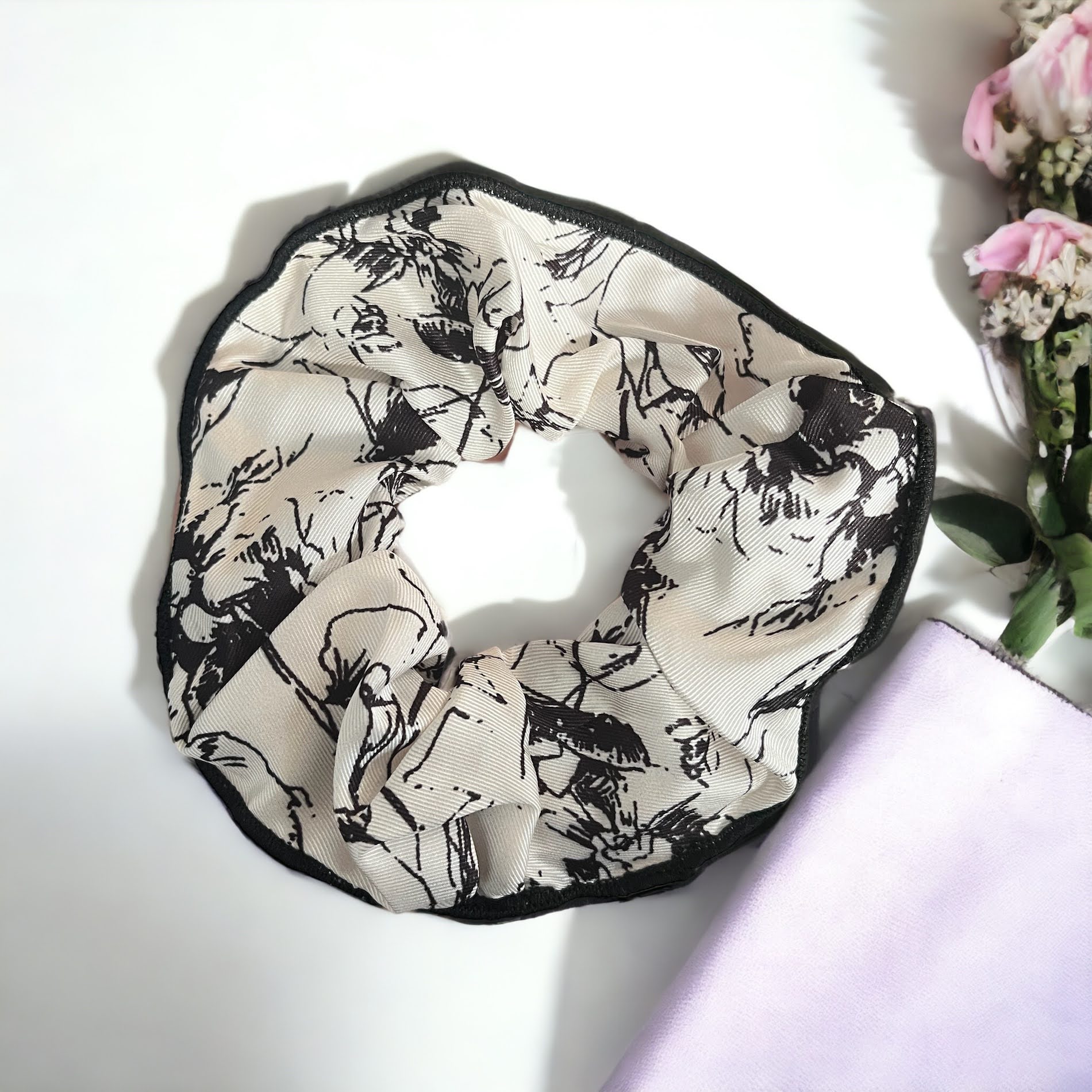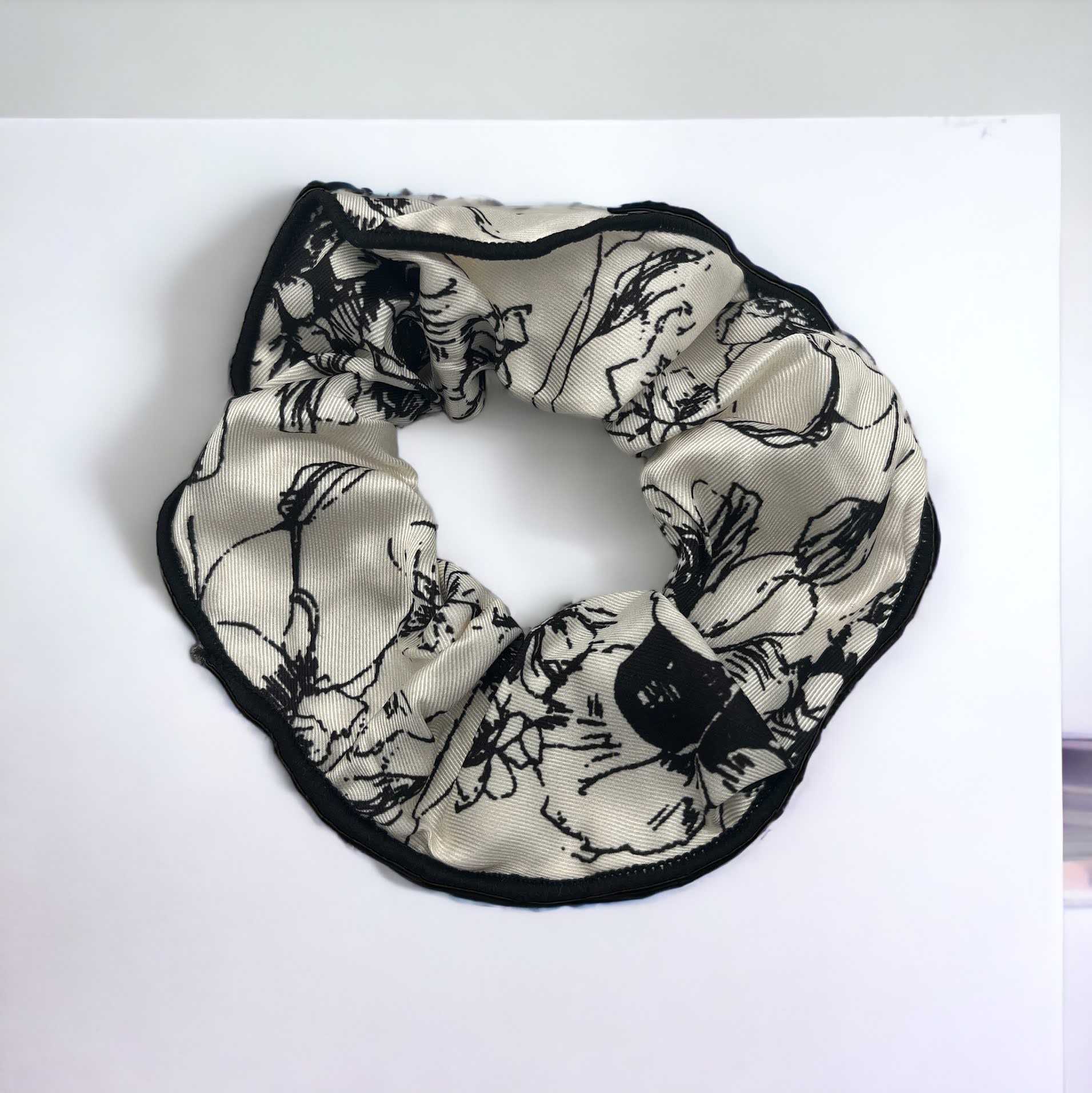Gumka do włosów typu scrunchie w kolorze białym, z motywem w czarne kwiatki.