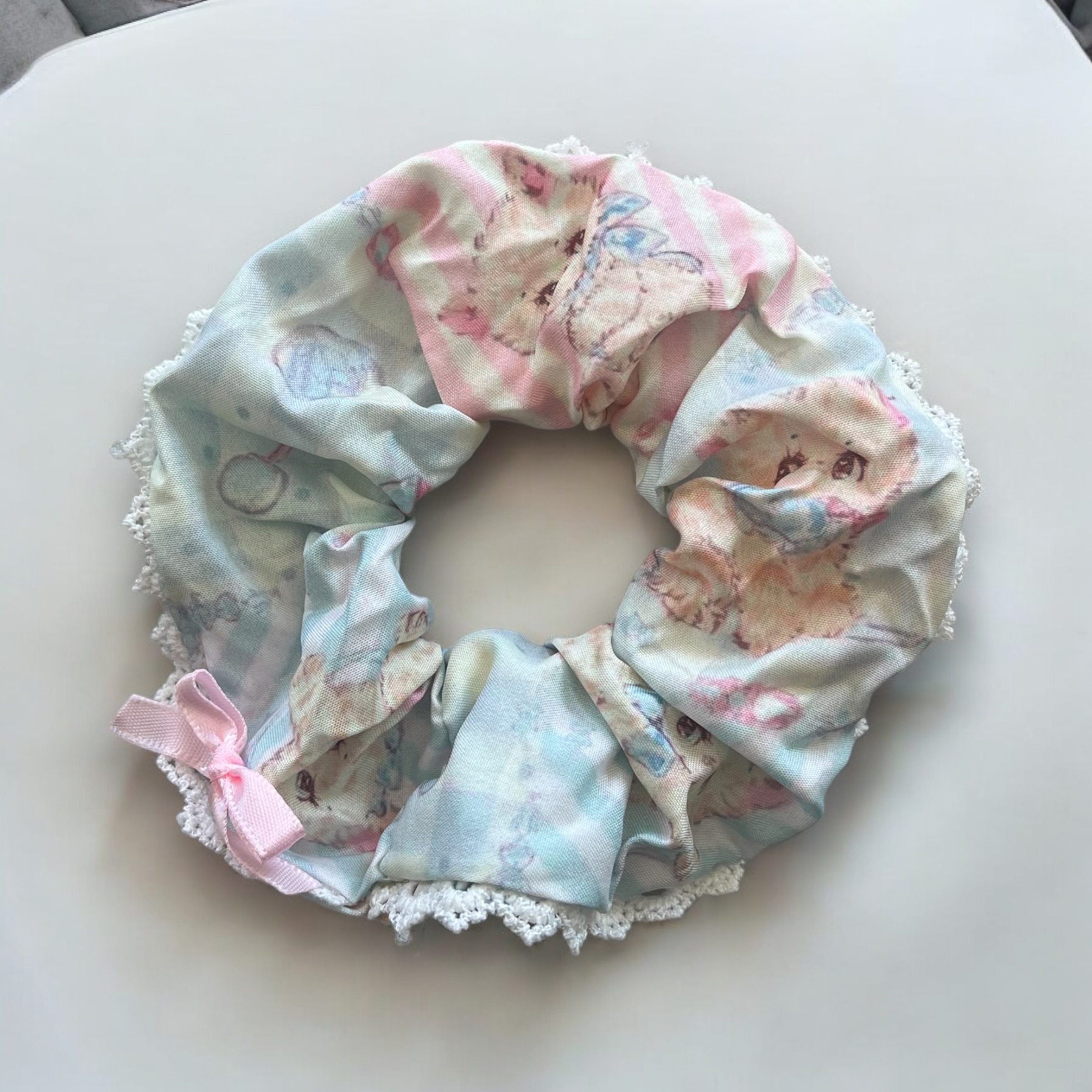 Gumka do włosów SCRUNCHIE niebieska błękitna kotki koronka kokardka