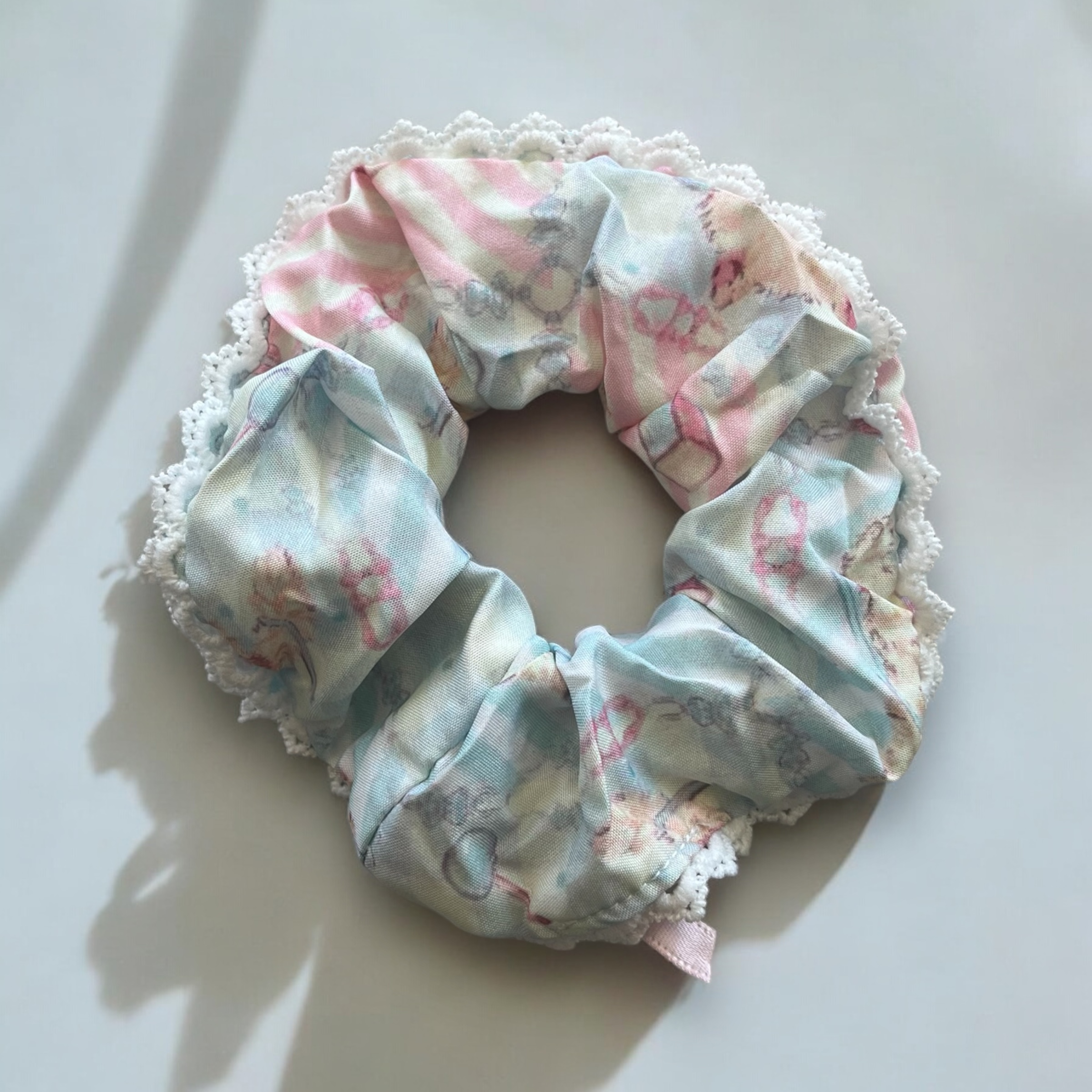 Gumka do włosów typu scrunchie w kolorze błękitnym z motywem w kotki, obszyta koronką.