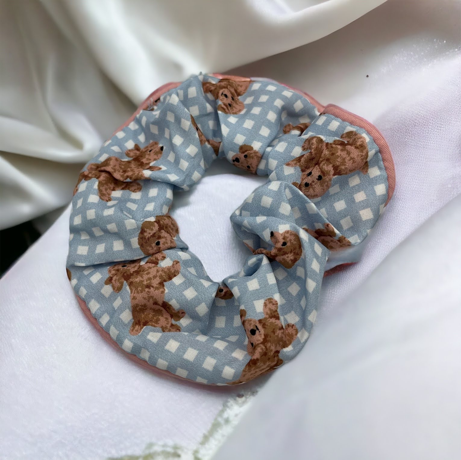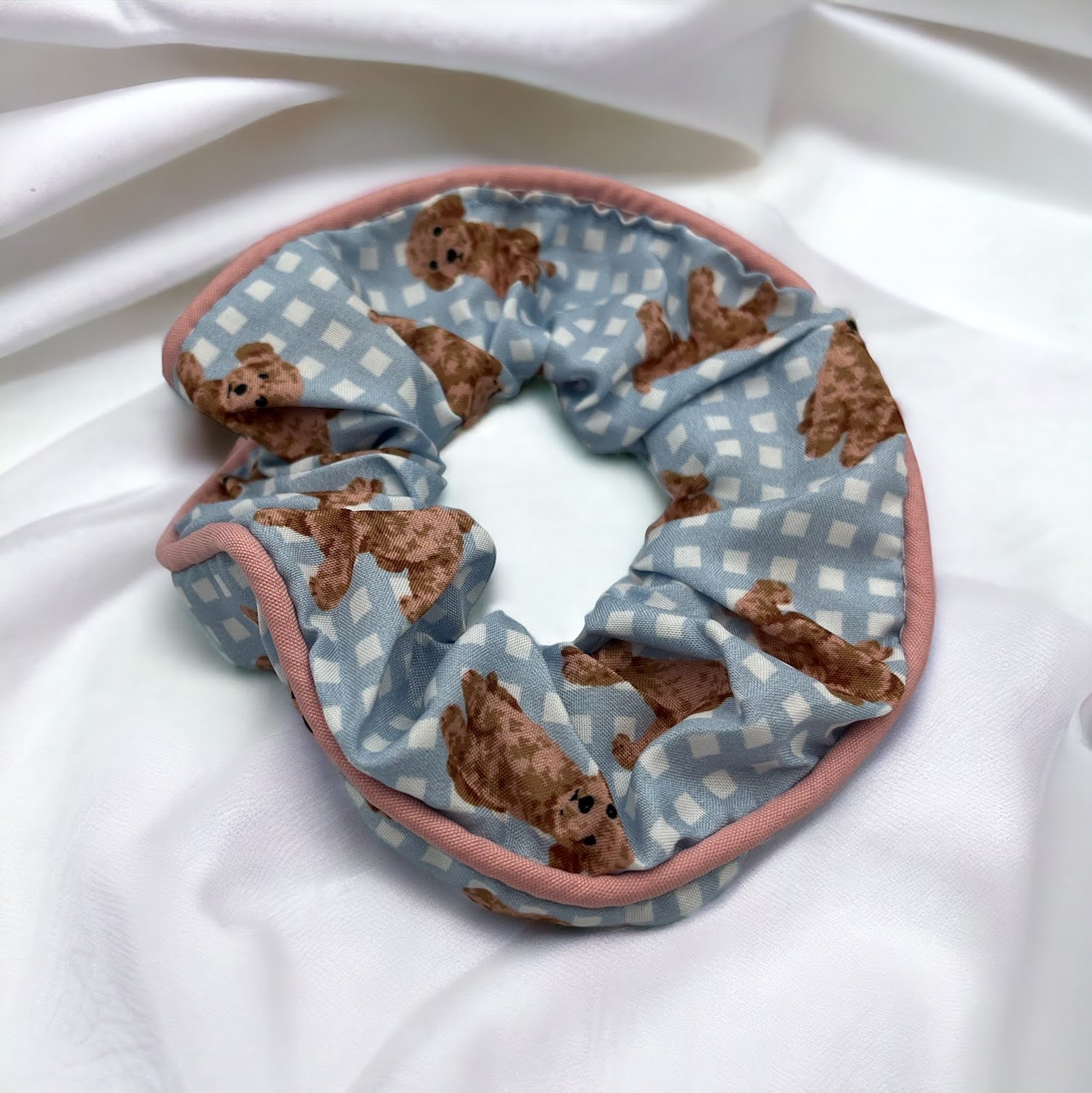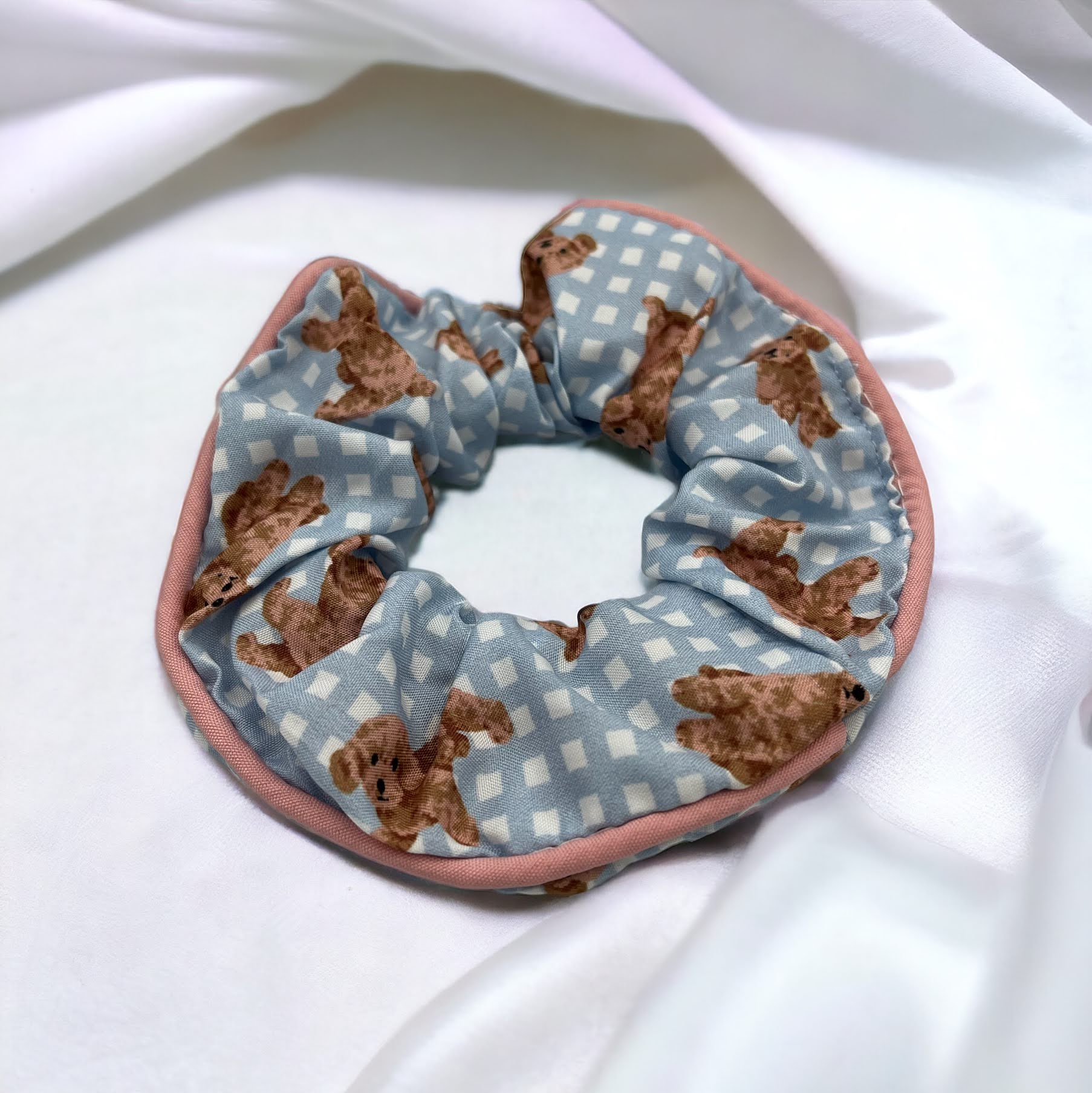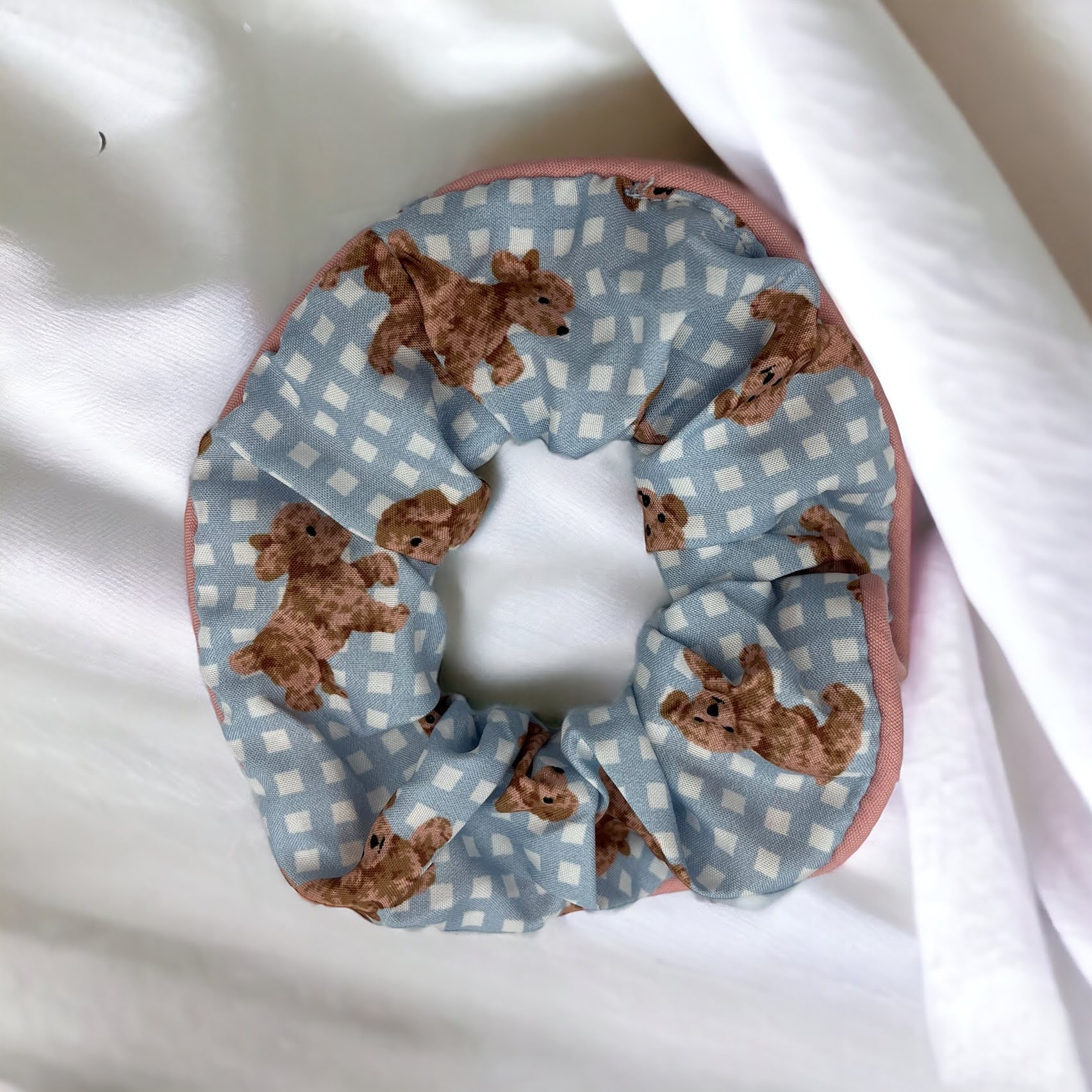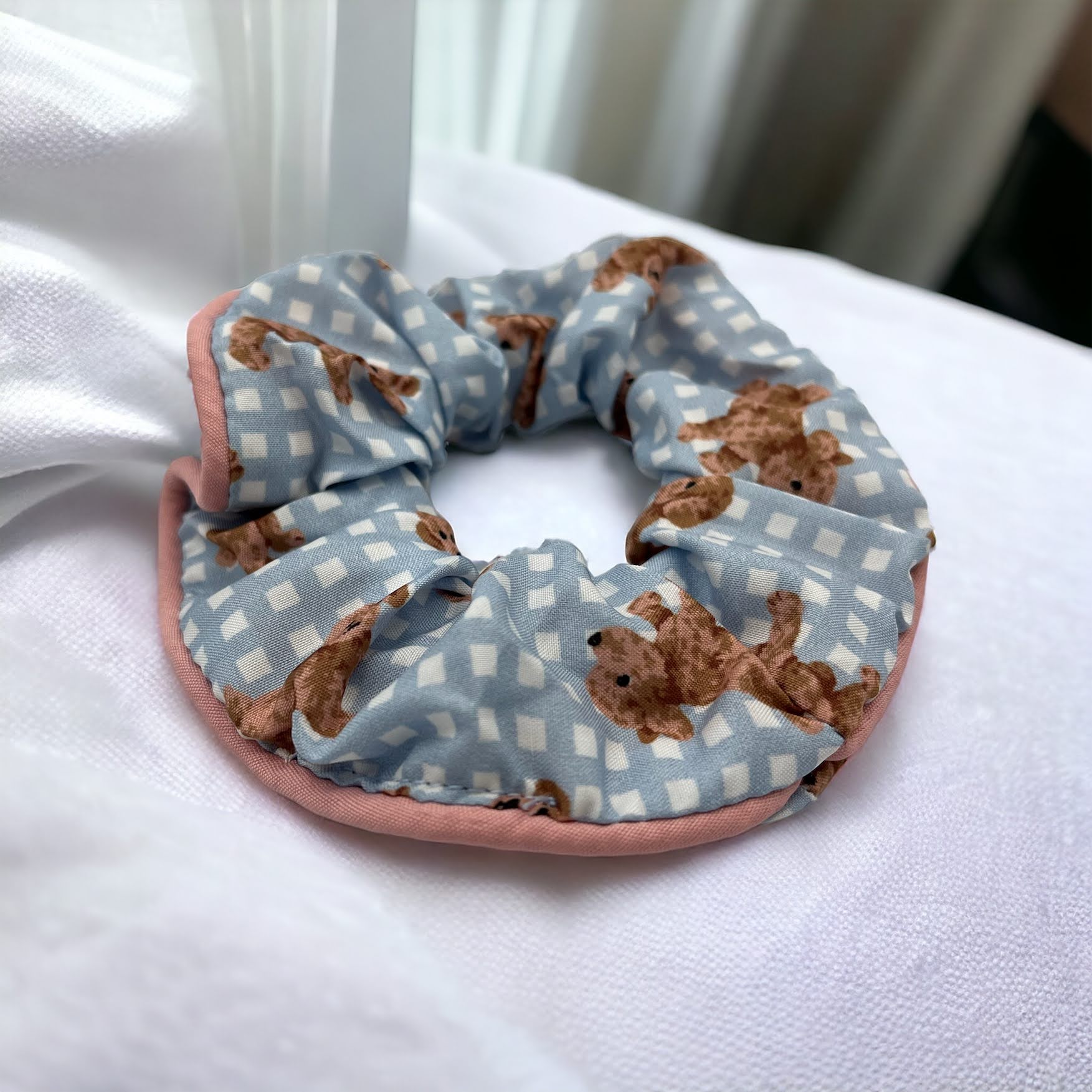 Gumka do włosów SCRUNCHIE frotka tkanina pieski pudel kratka błękit