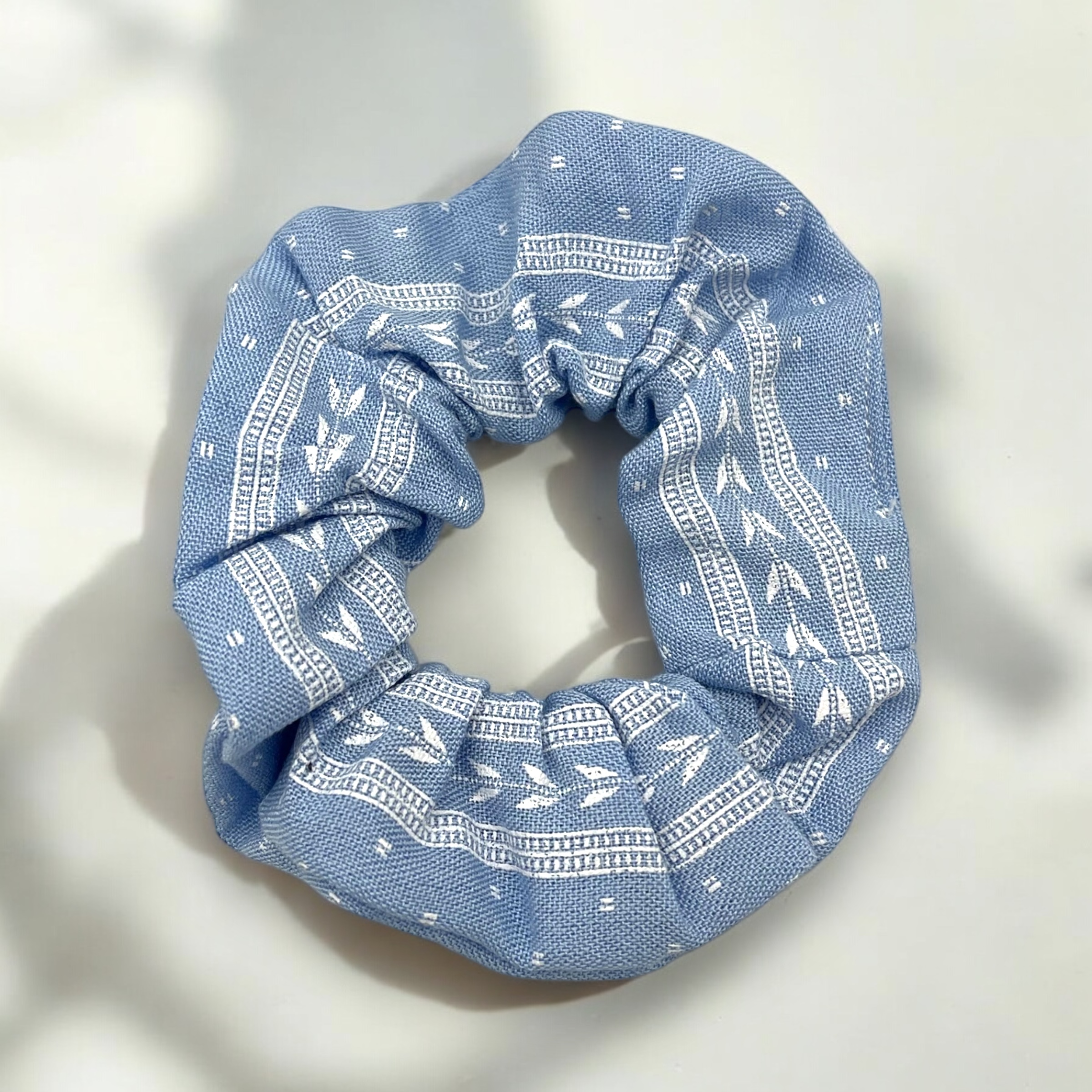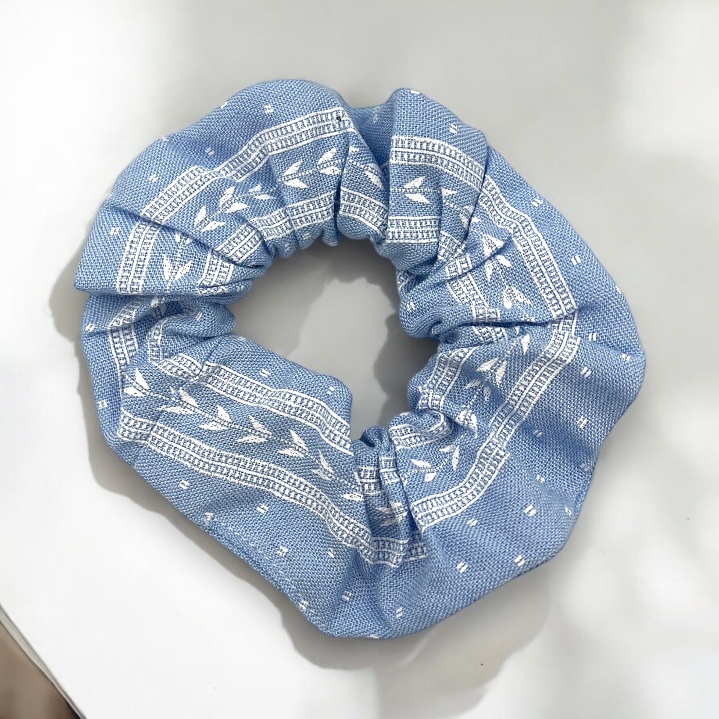 Gumka do włosów typu scrunchie w kolorze błękitnym z wzorkiem.
