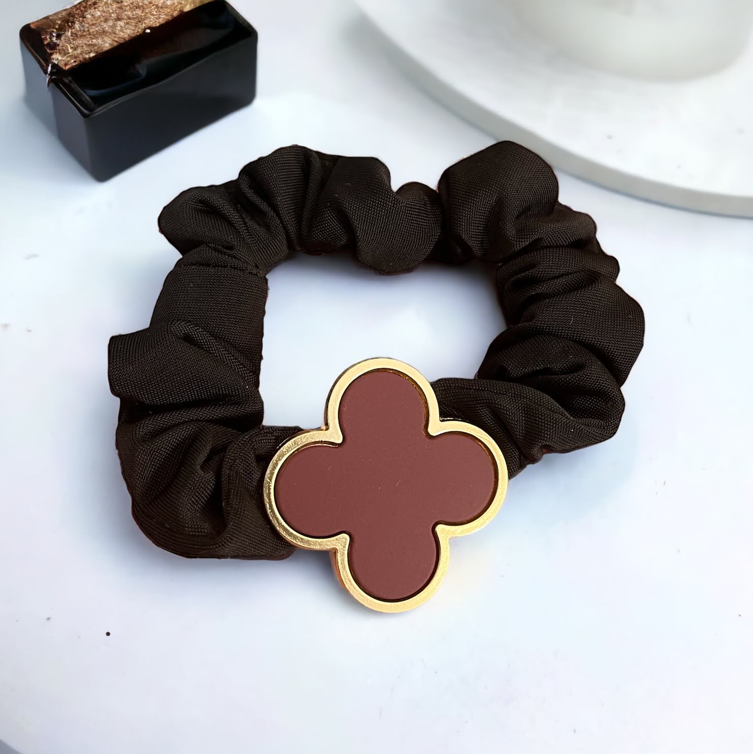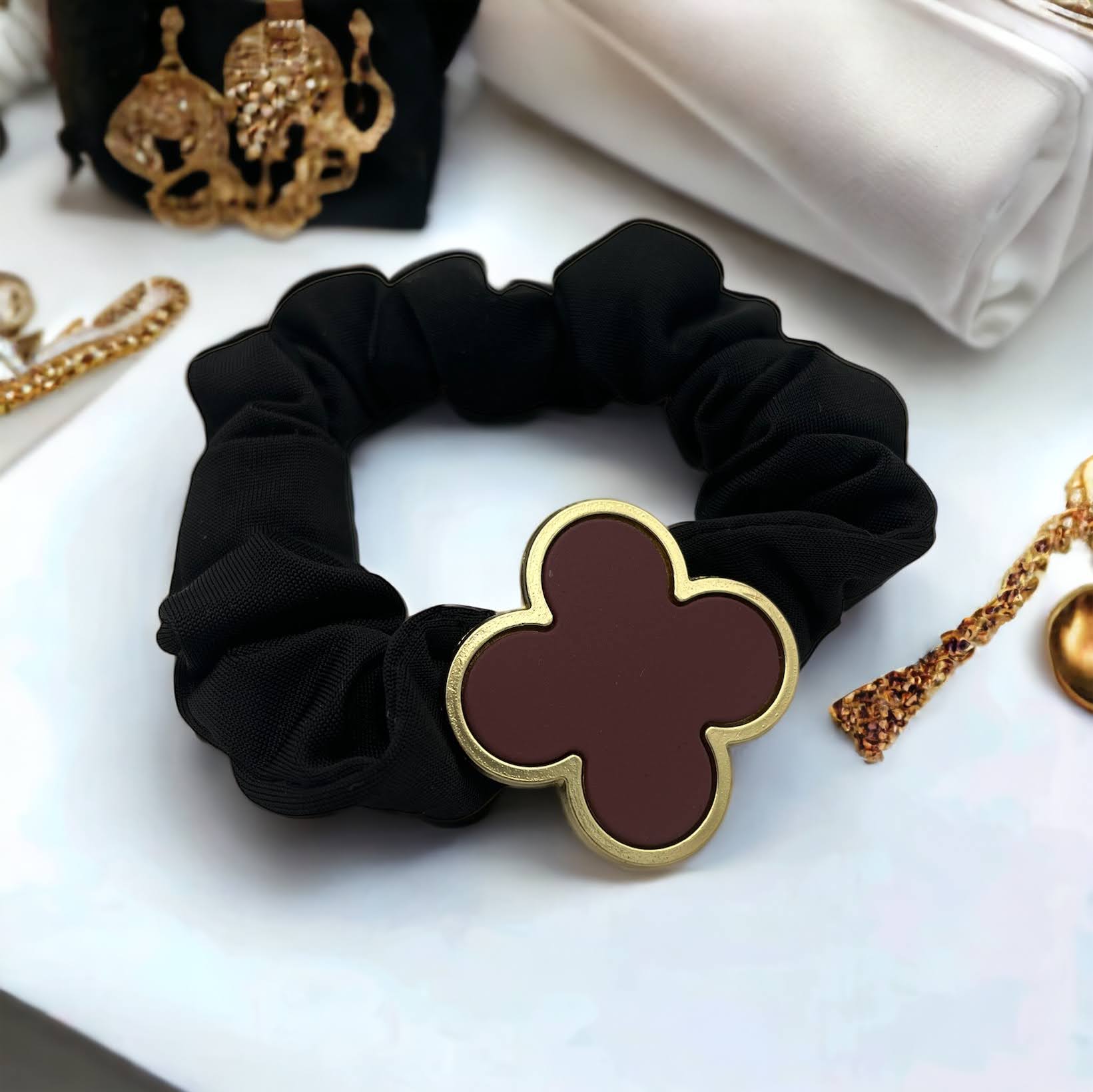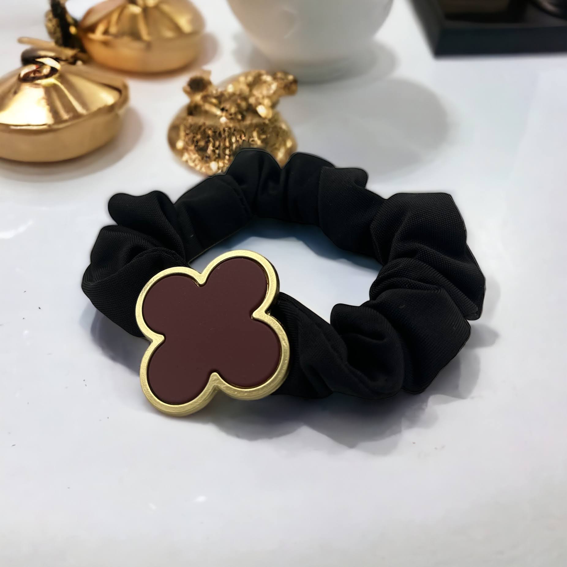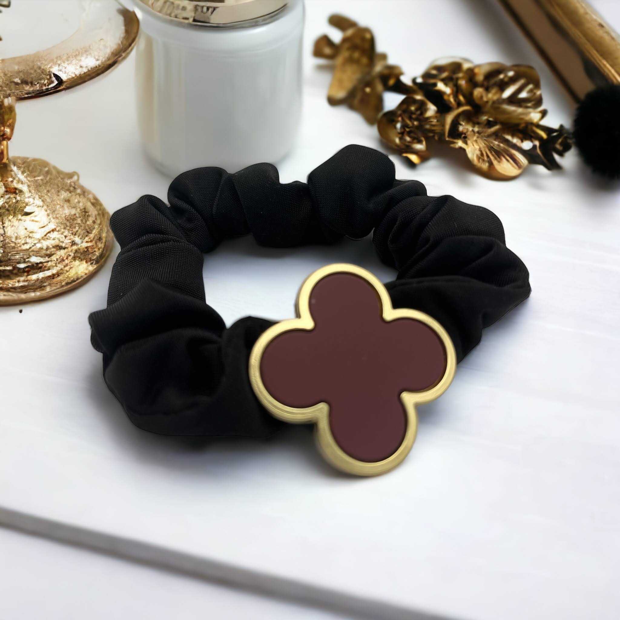 Gumka do włosów typu scrunchie w kolorze bordowym z elementem ozdobnym – koniczynka.