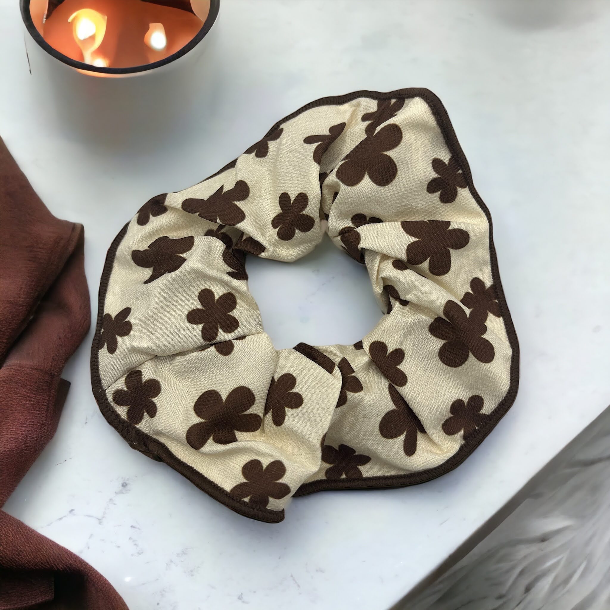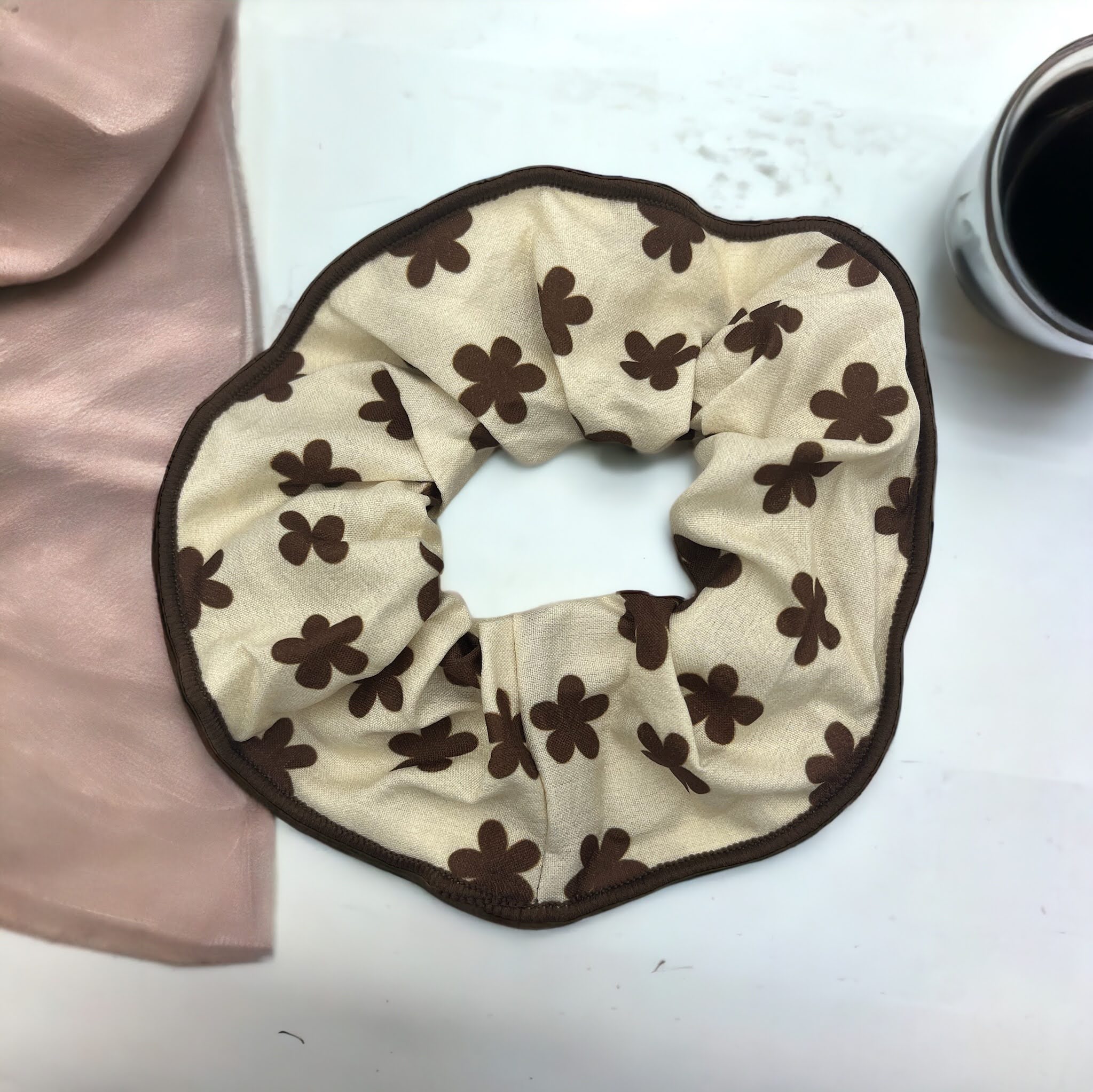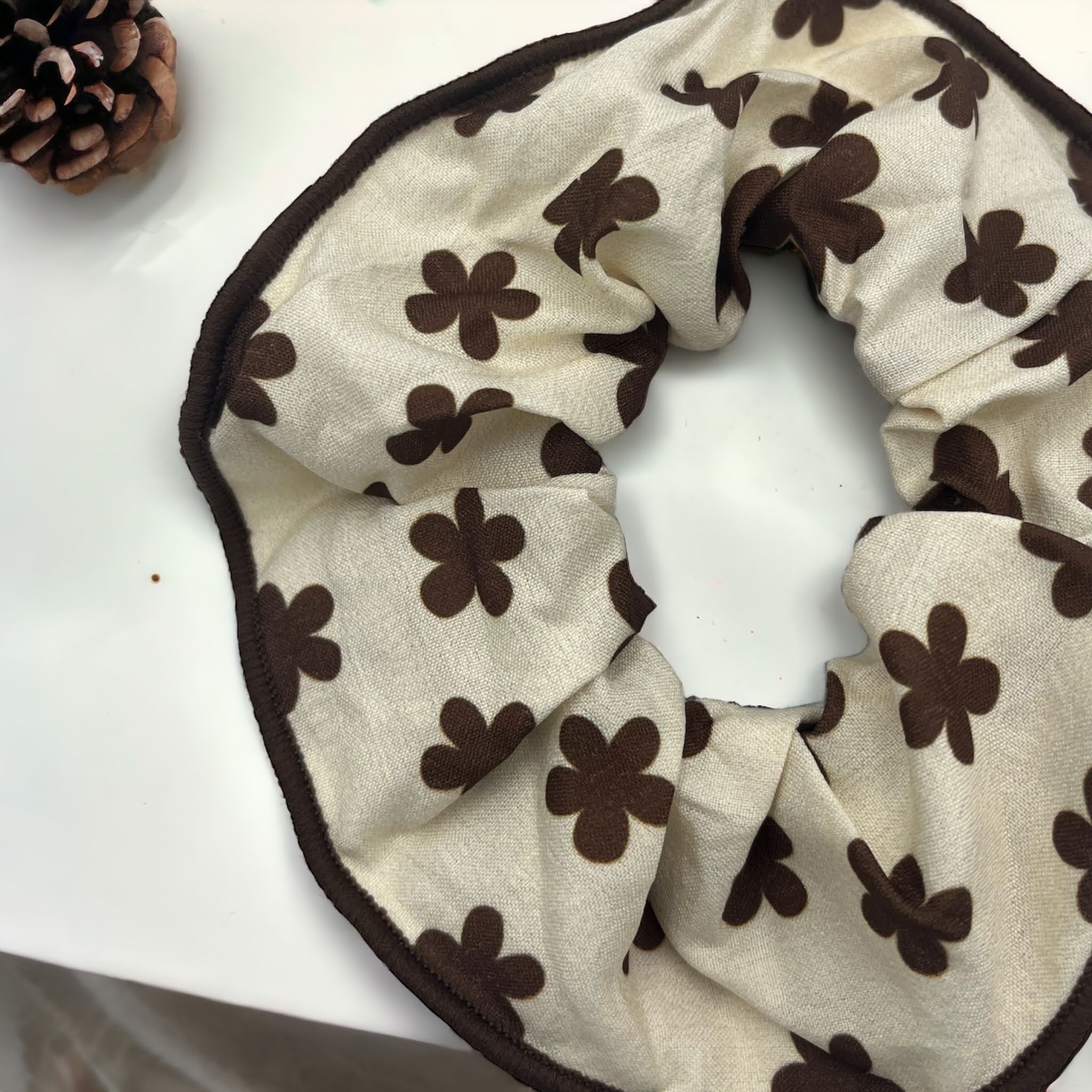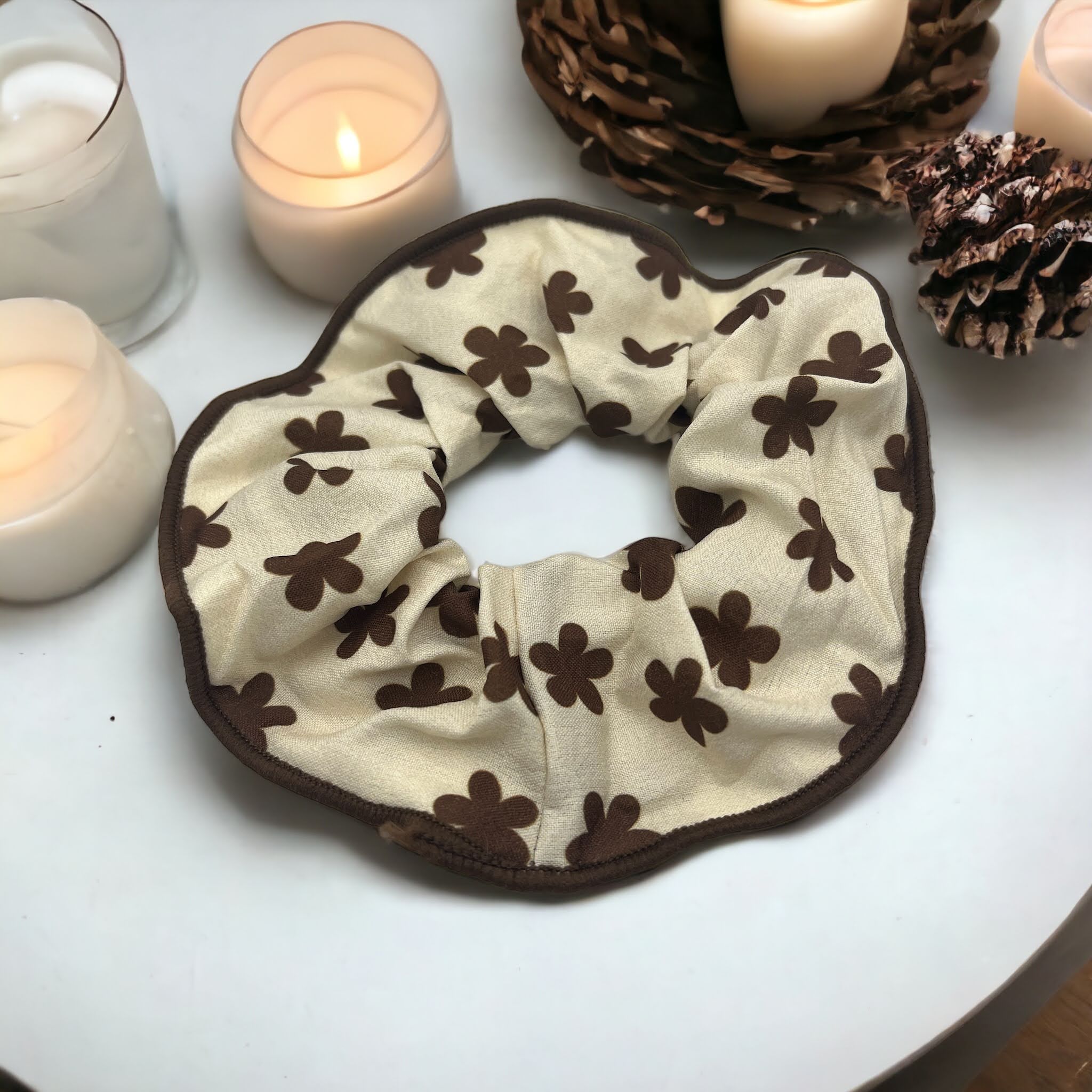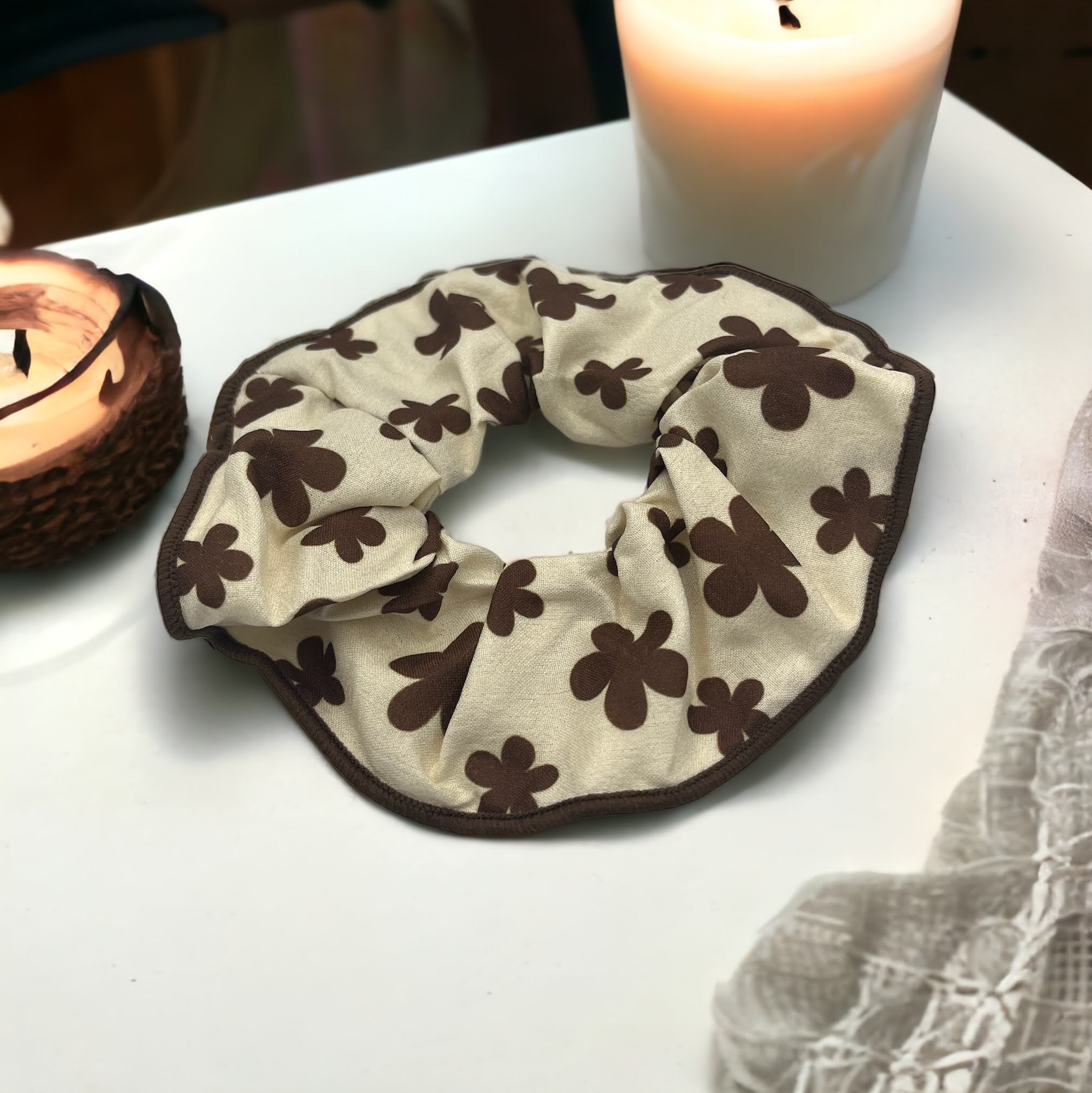 Gumka do włosów SCRUNCHIE frotka tkanina brązowe kwiatki kwiatek beż ecru
