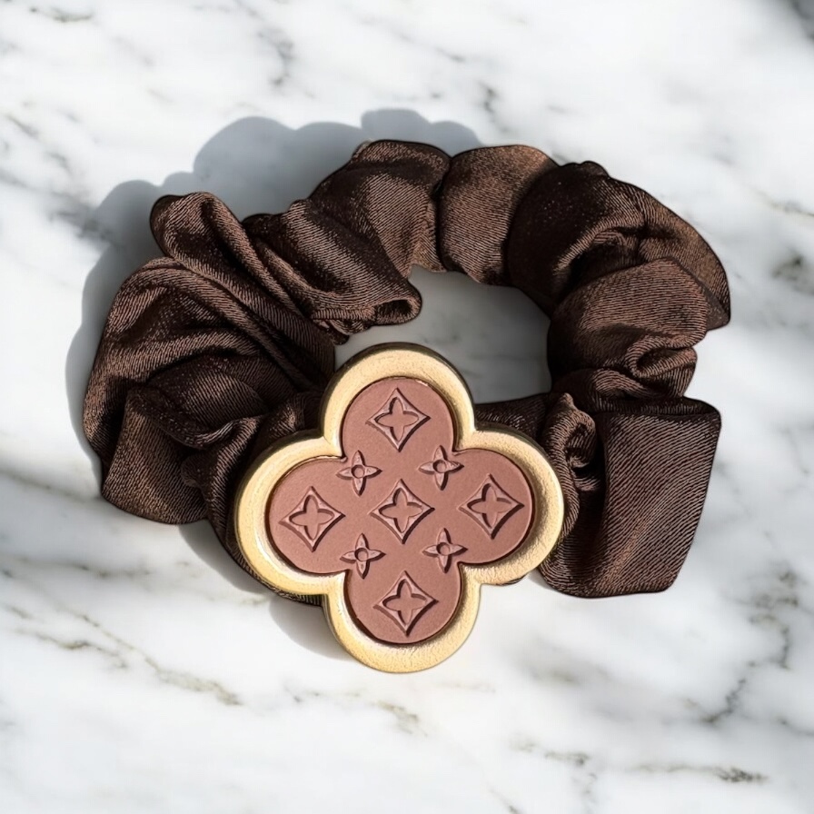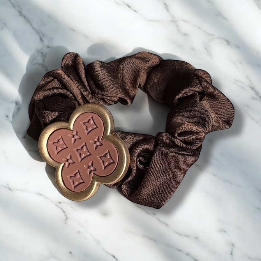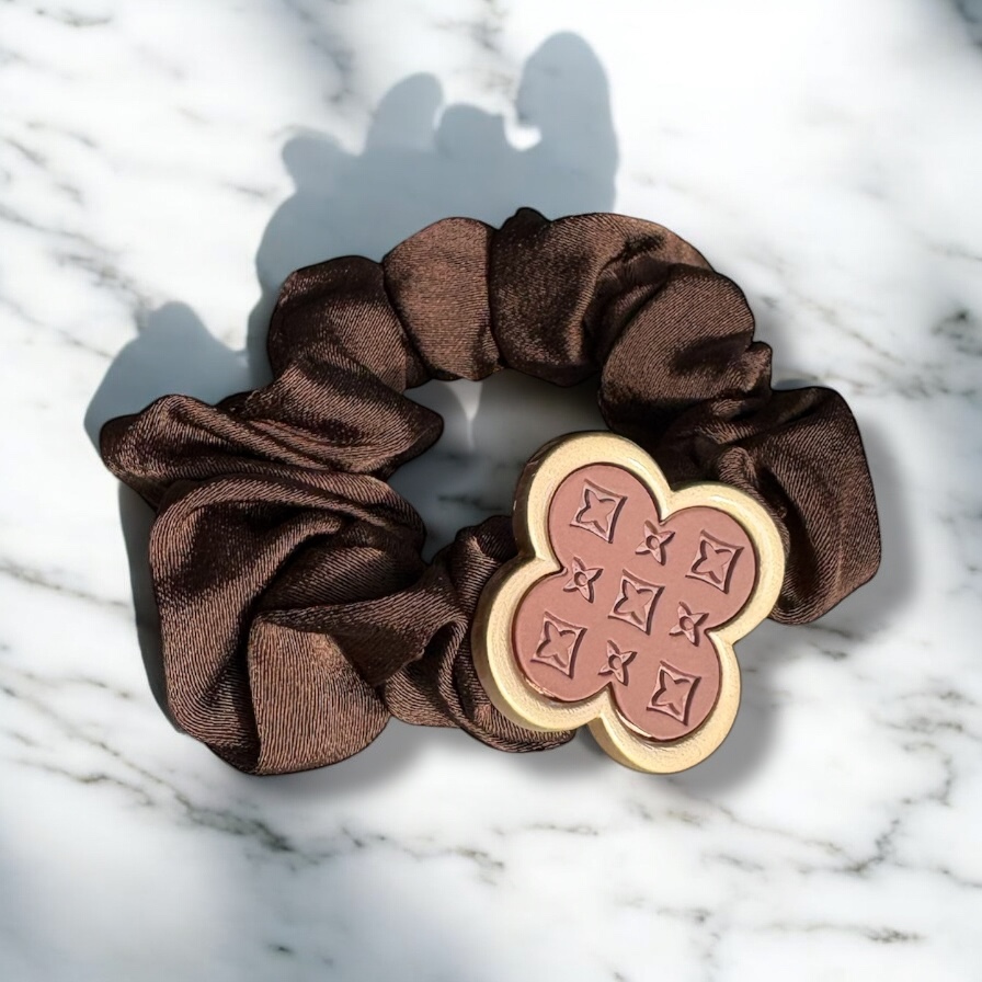 Gumka do włosów typu scrunchie w kolorze brązowym z elementem ozdobnym – koniczynka.