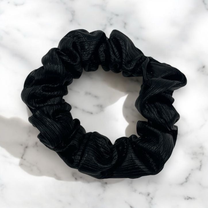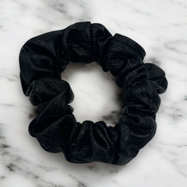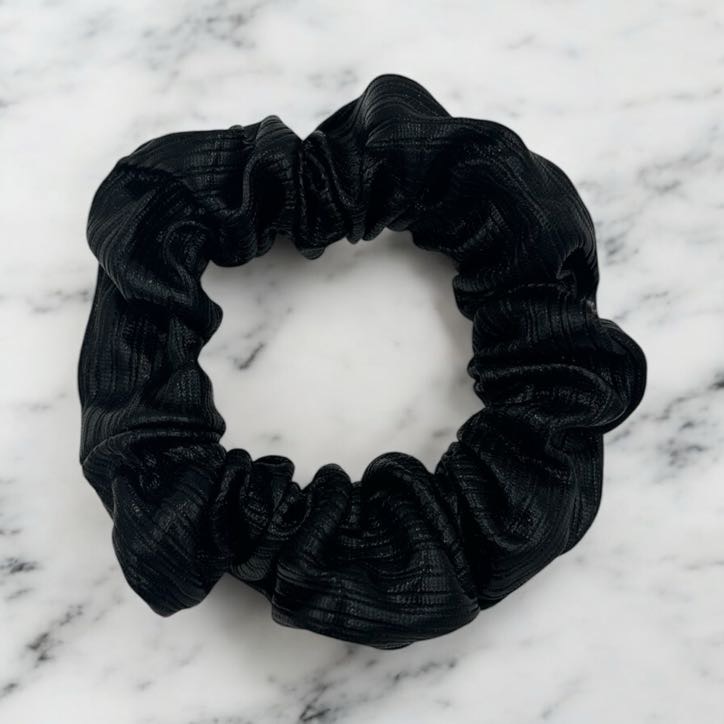 Gumka do włosów typu scrunchie w kolorze czarnym. Błyszcząca, wykonana z grubszego materiału.