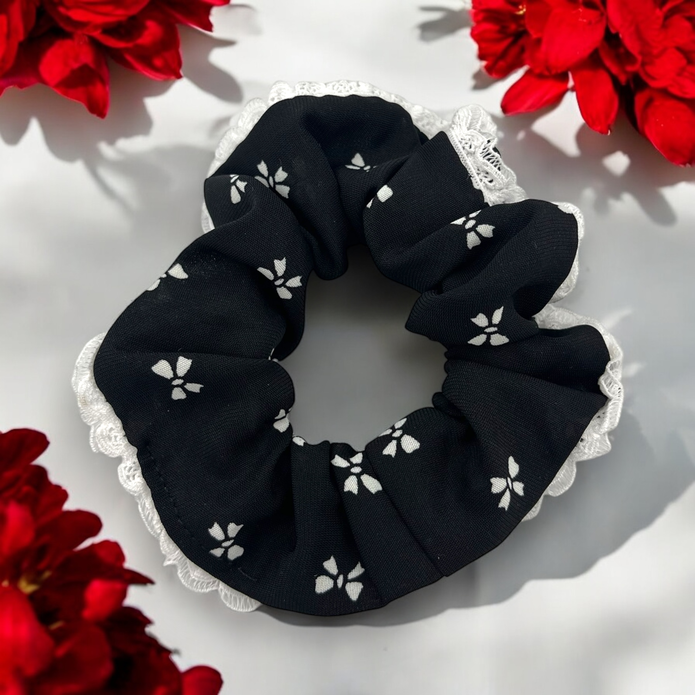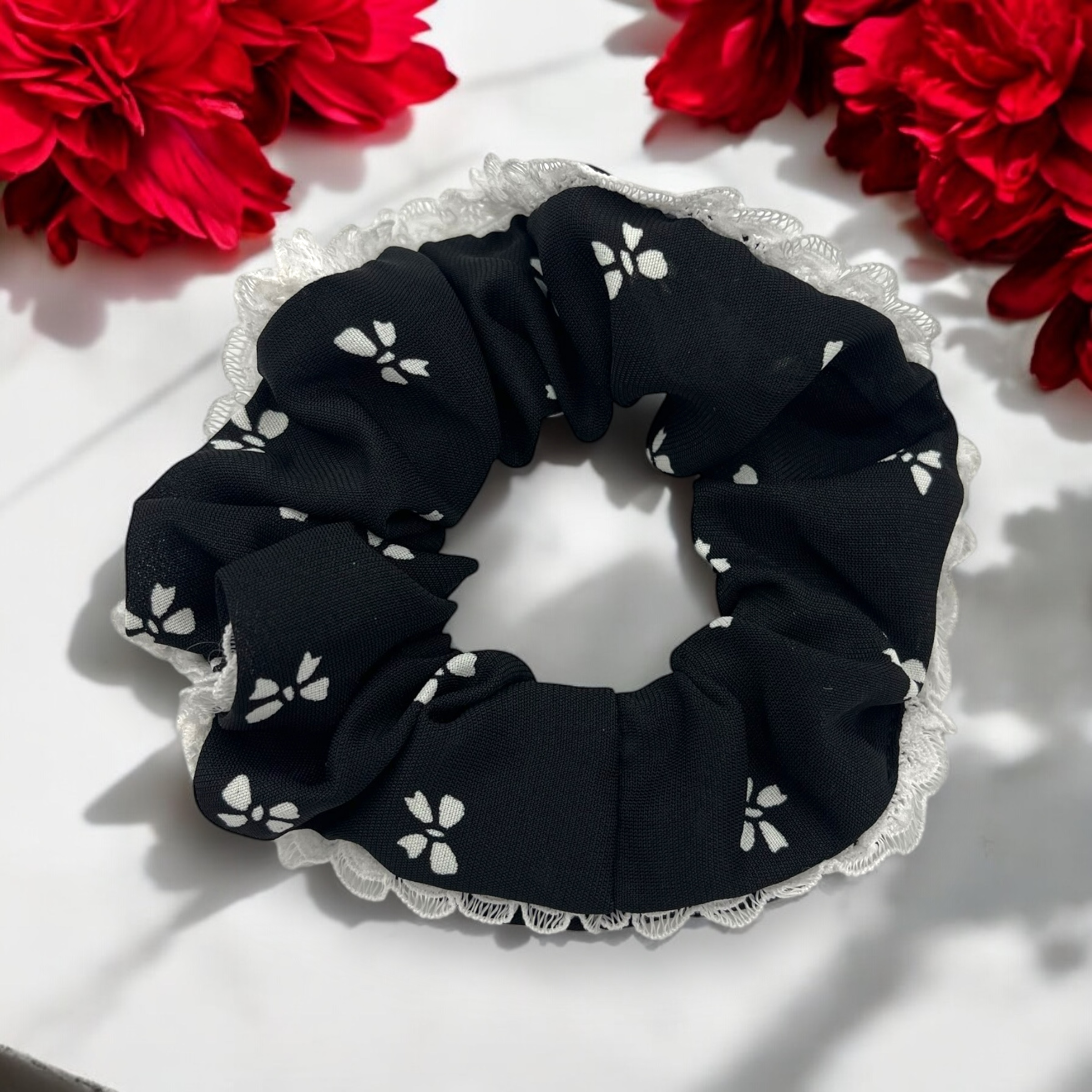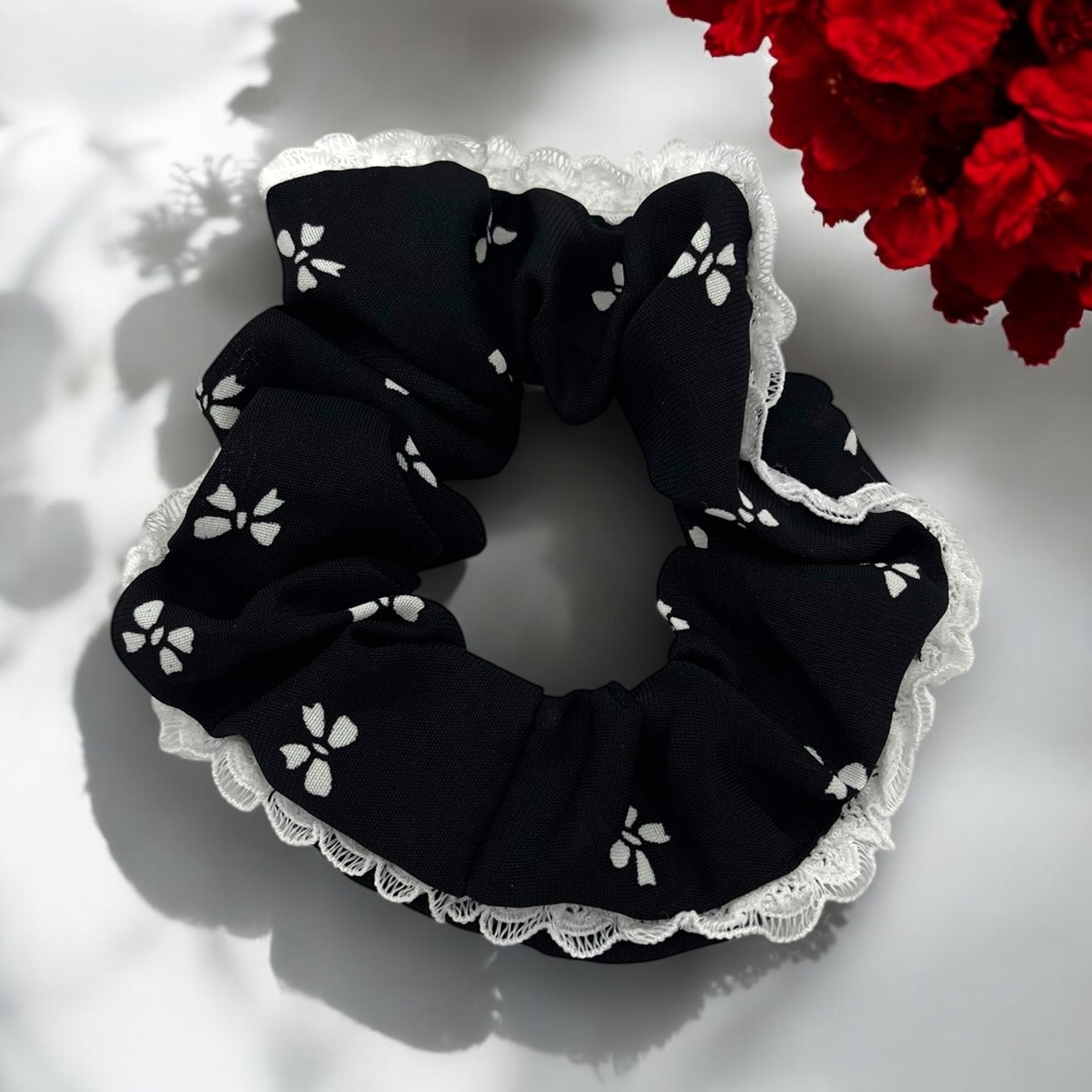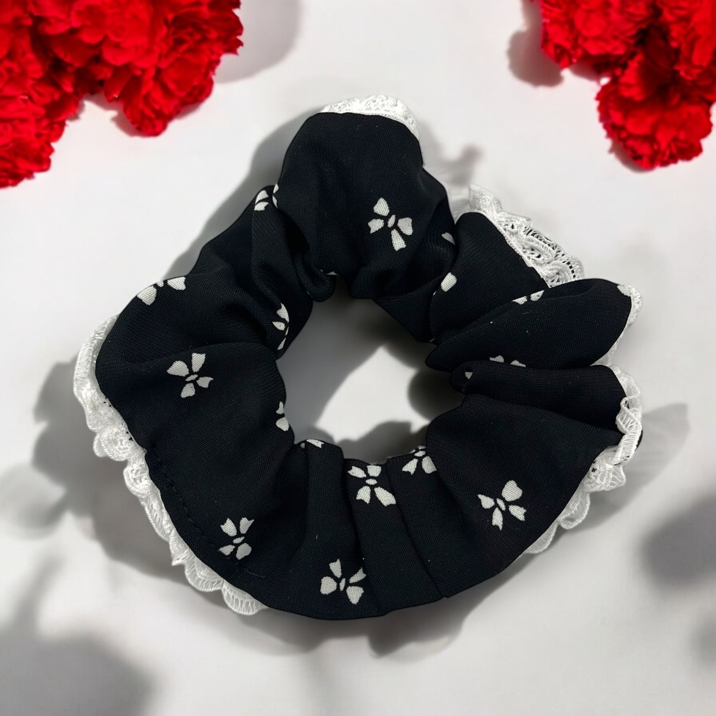 Gumka do włosów typu scrunchie w kolorze czarnym z motywem w kokardki, obszyta koronką.