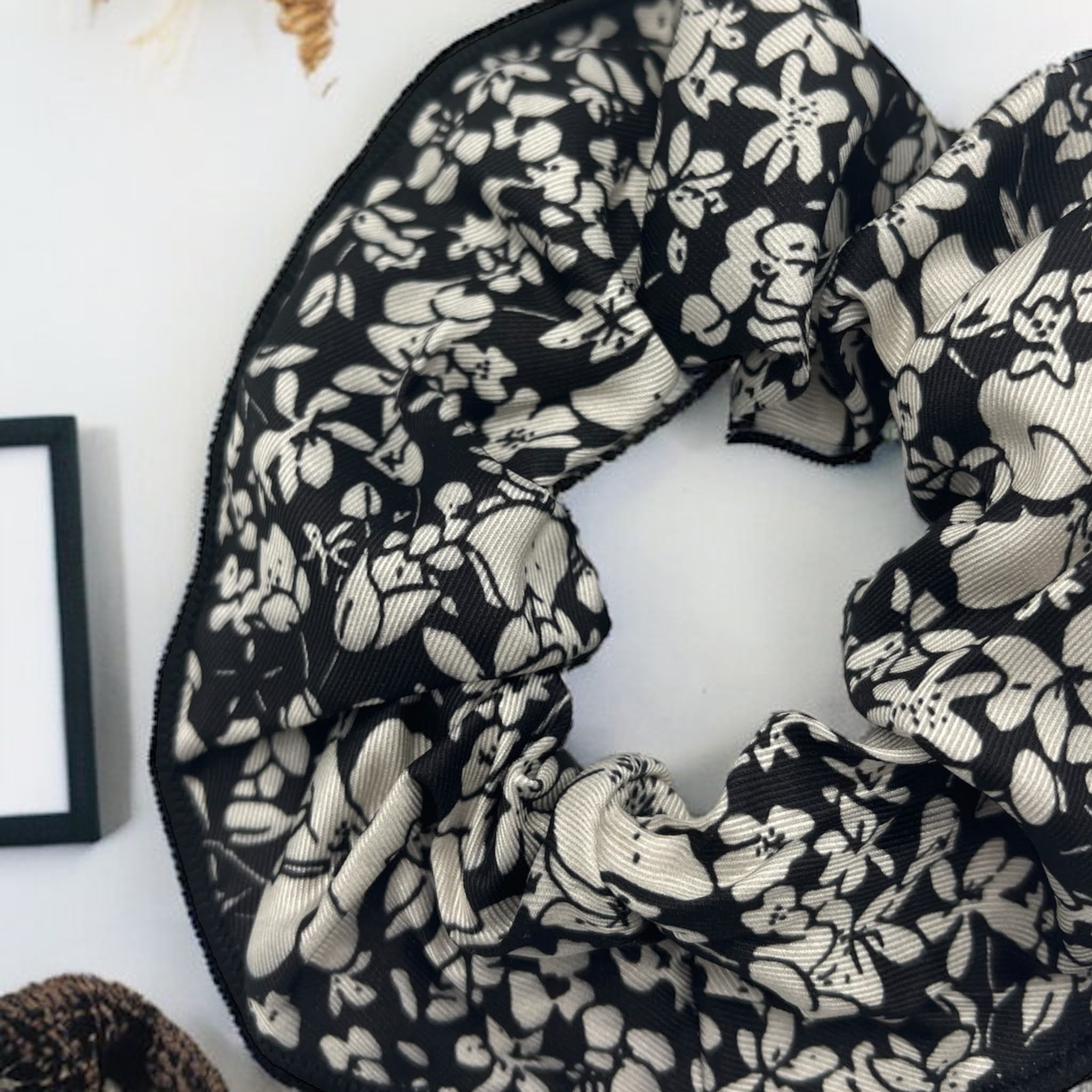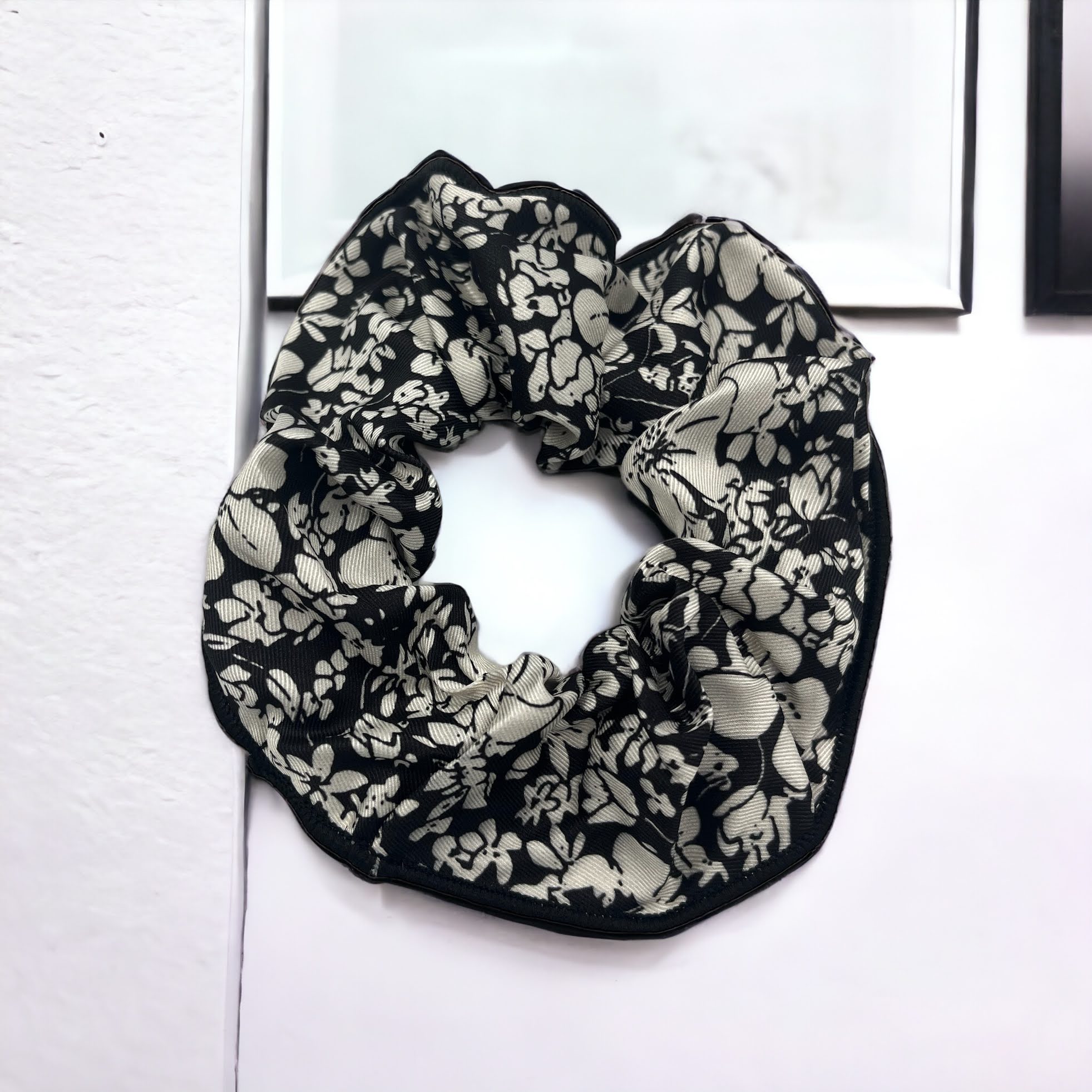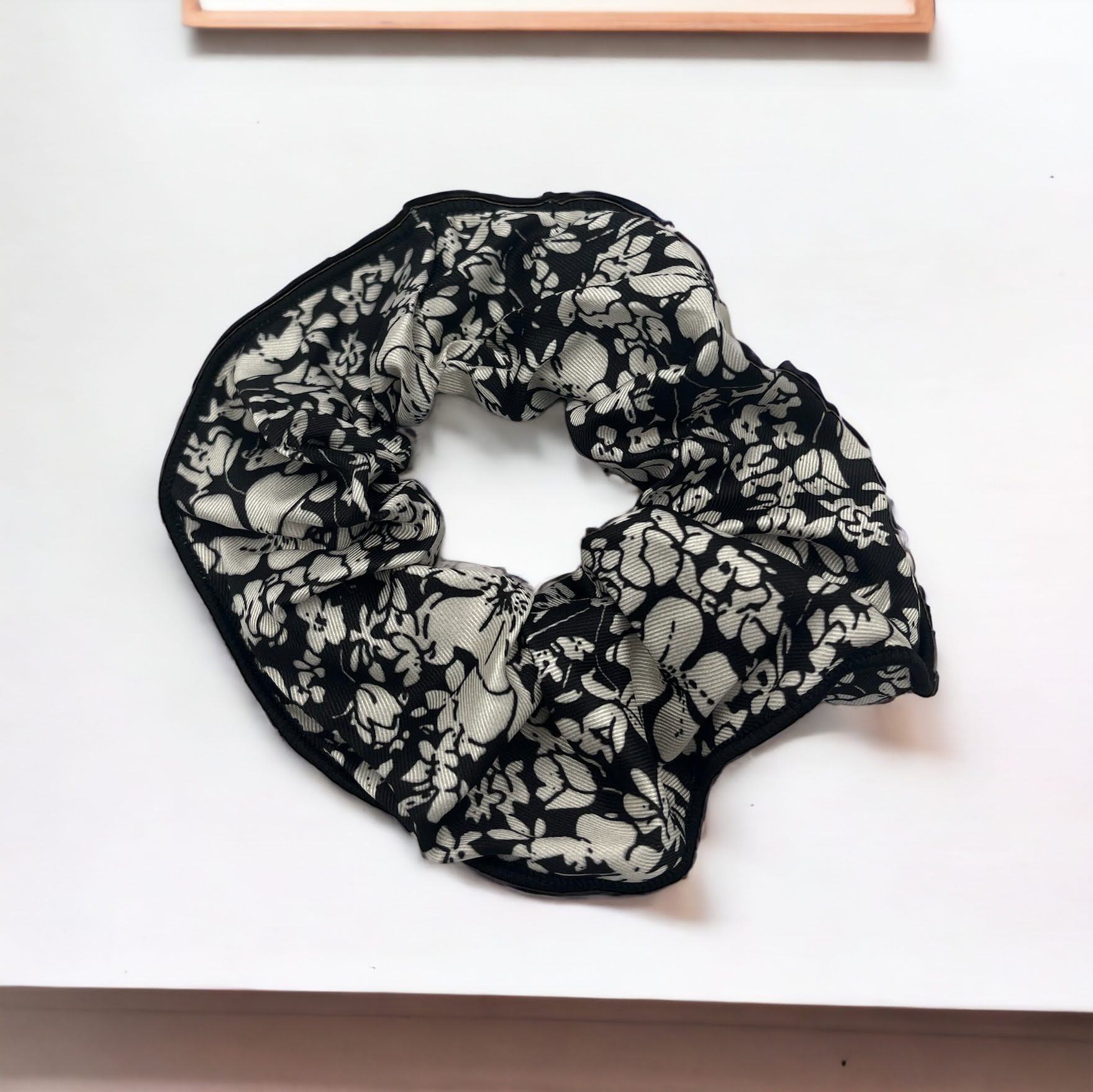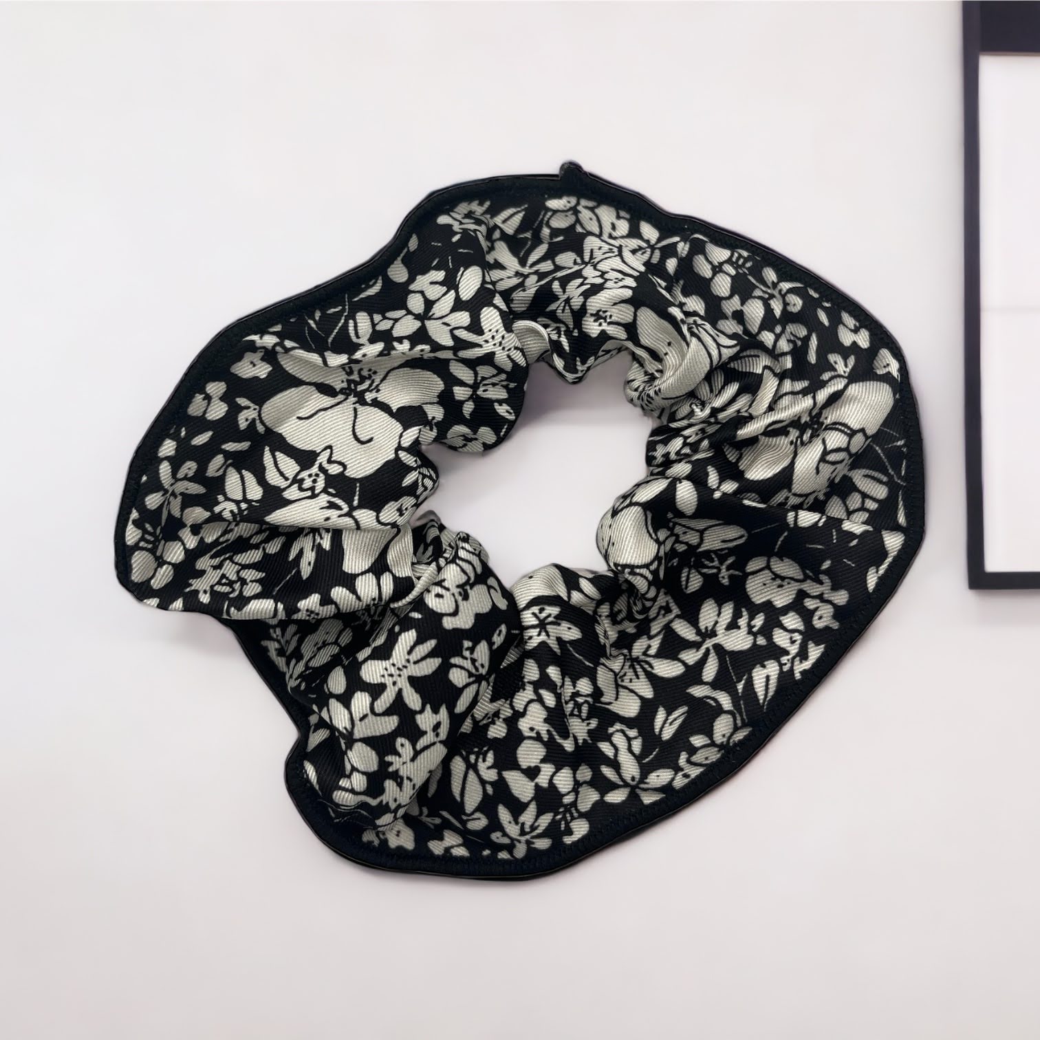 Gumka do włosów typu scrunchie w kolorze czarnym, z motywem w białe kwiatki.