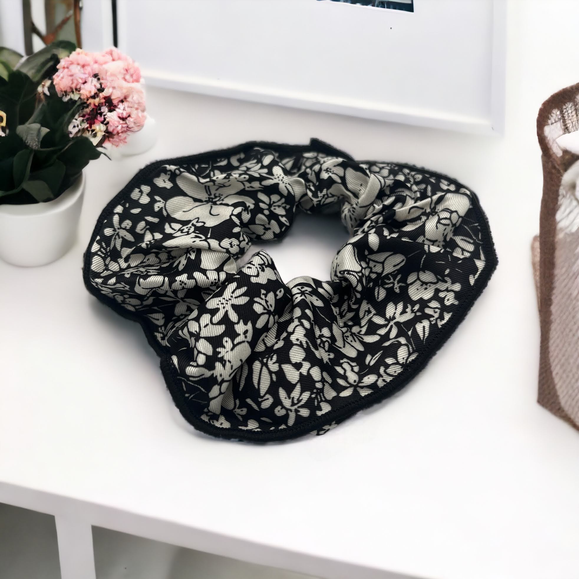 Gumka do włosów SCRUNCHIE frotka tkanina białe kwiatki kwiatek czarna
