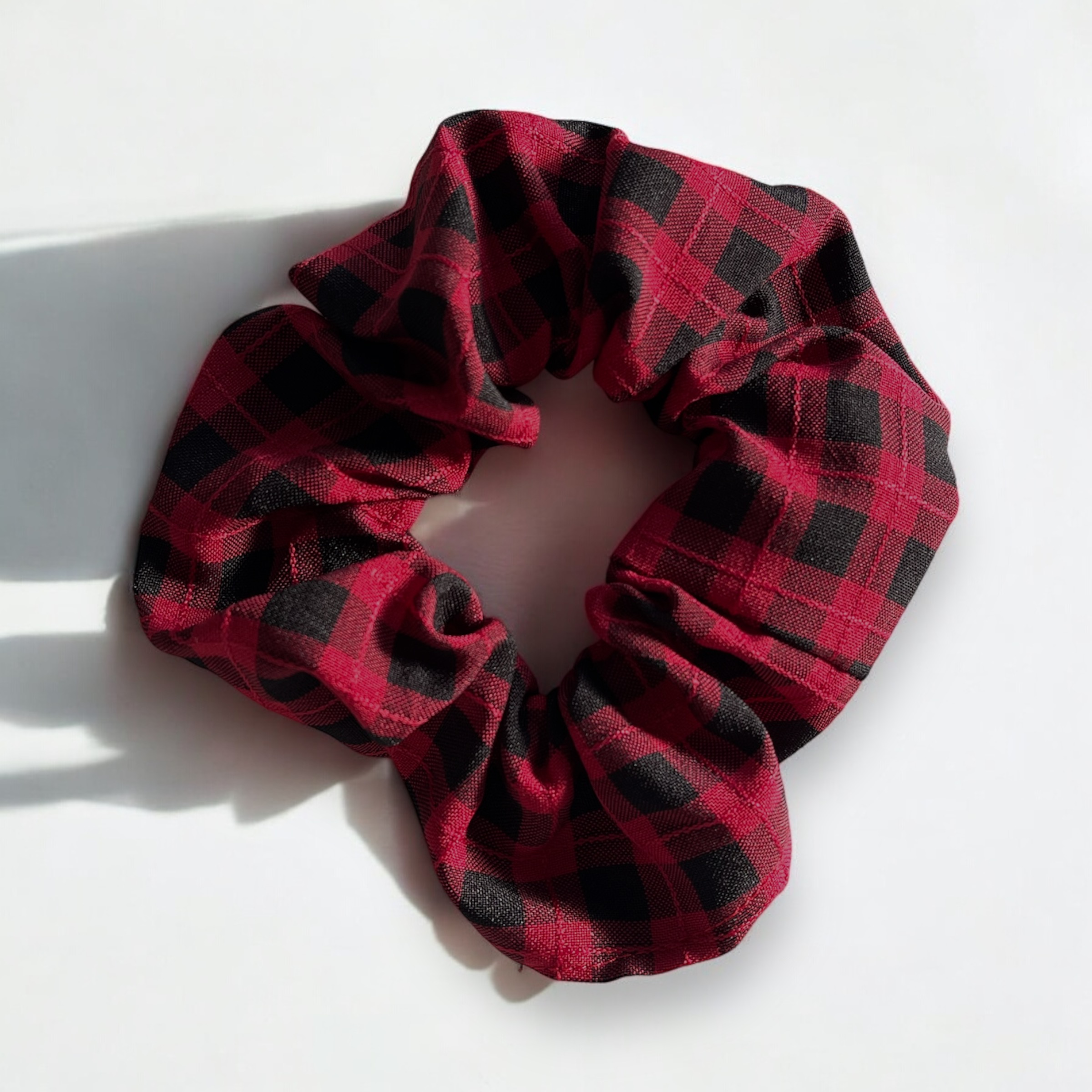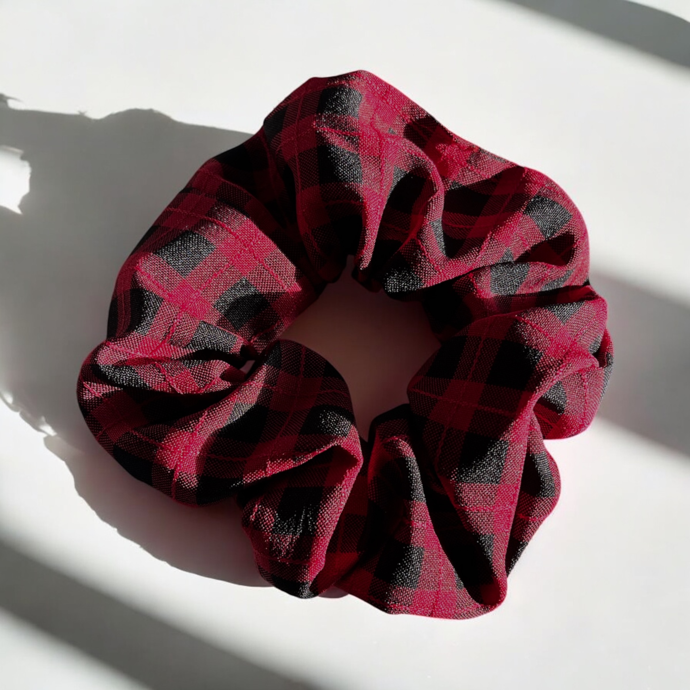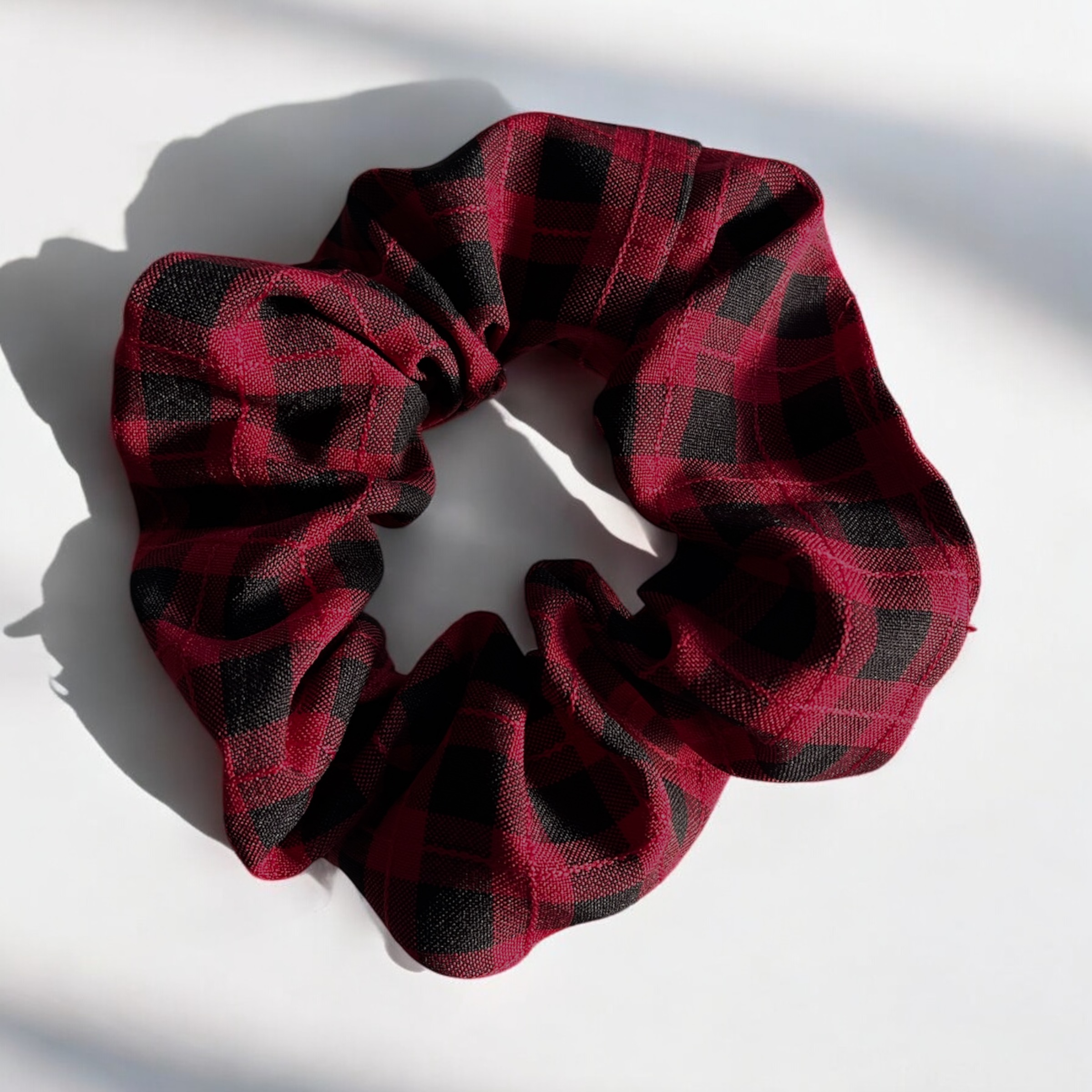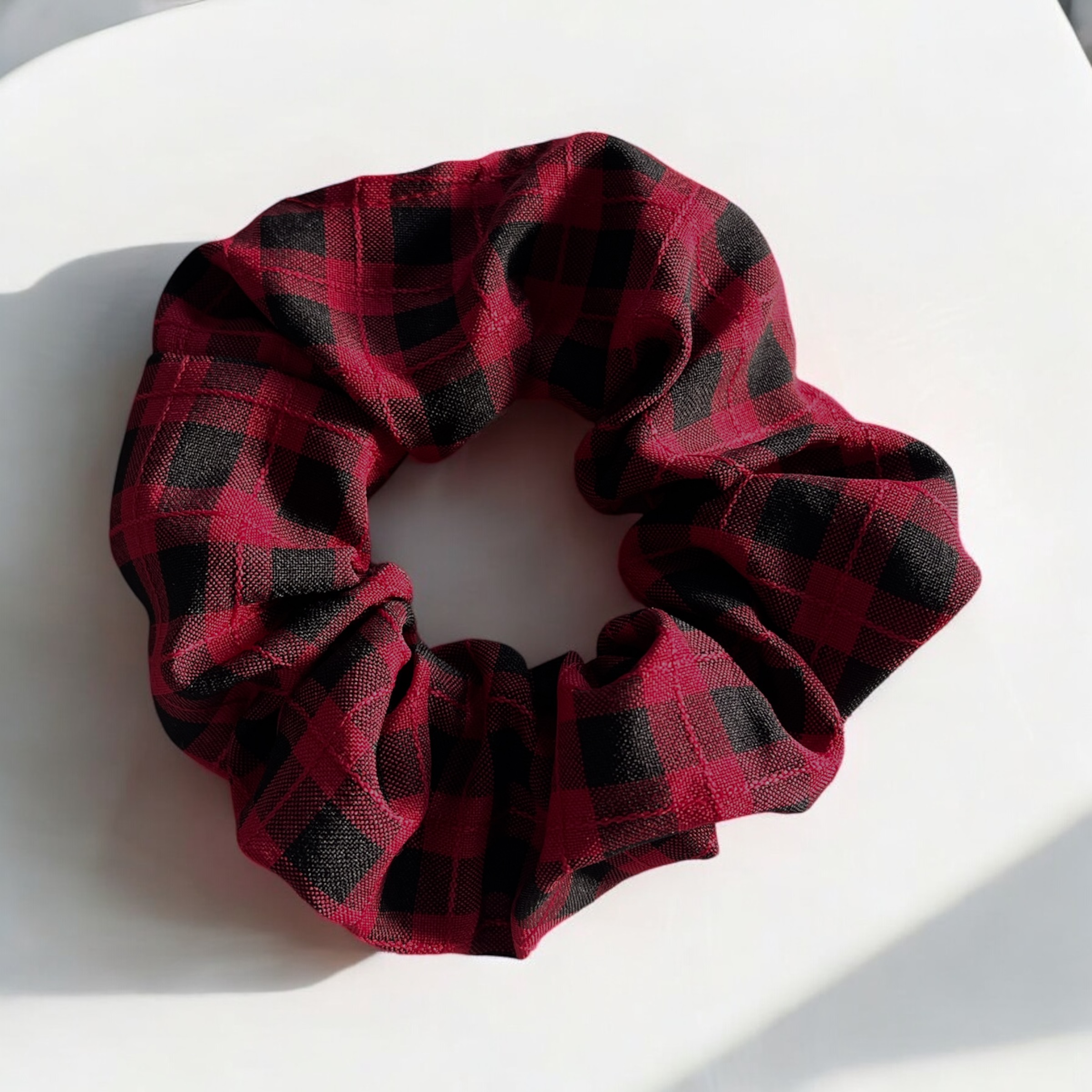 Gumka do włosów typu scrunchie w kolorze bordowo-czarnym w kratkę.