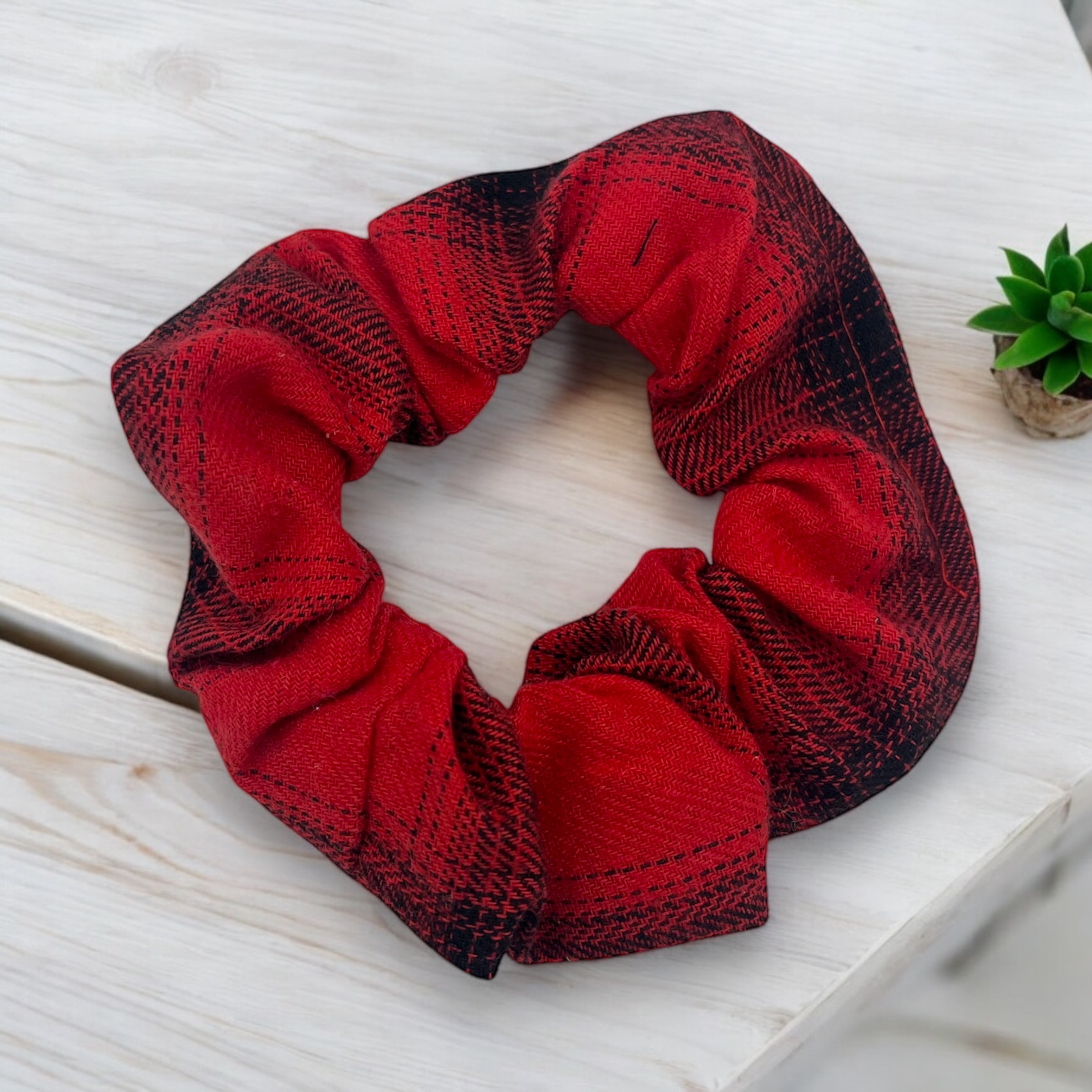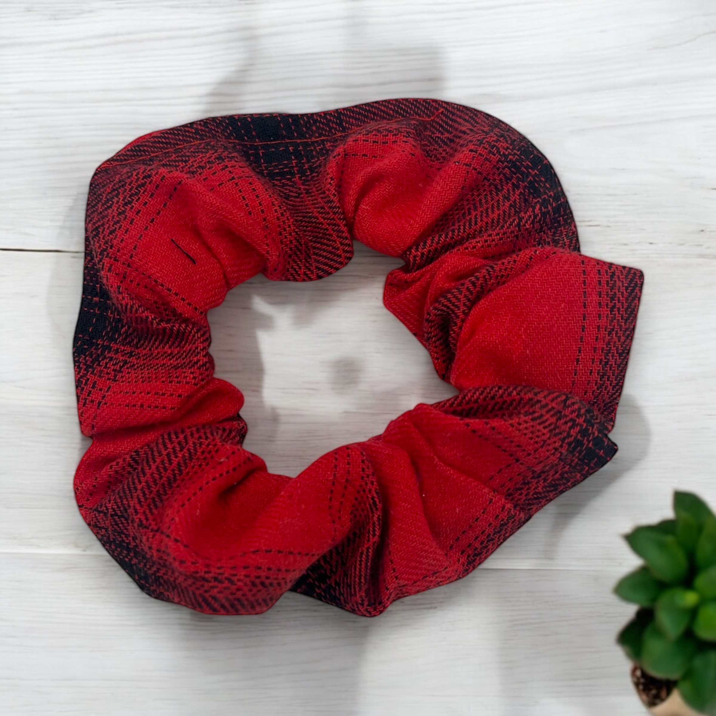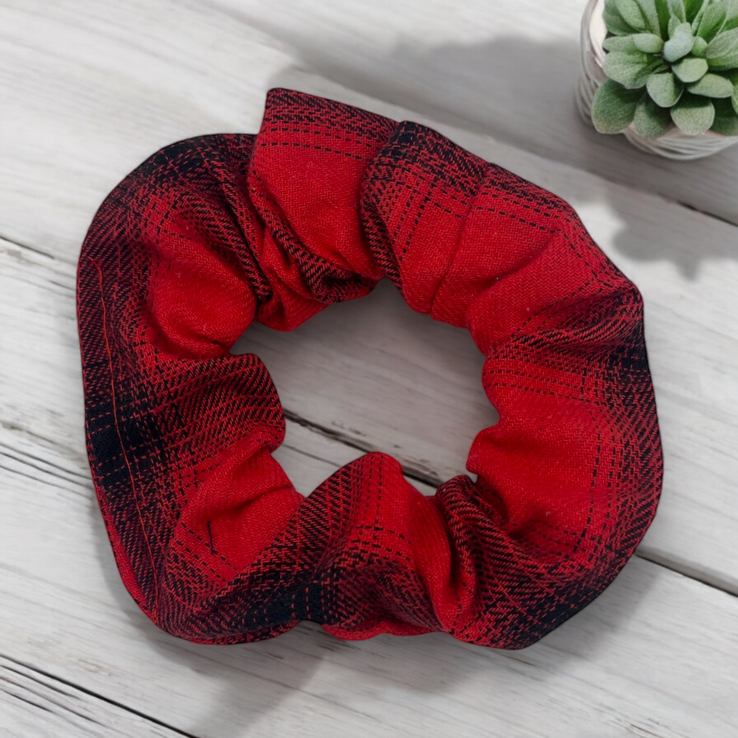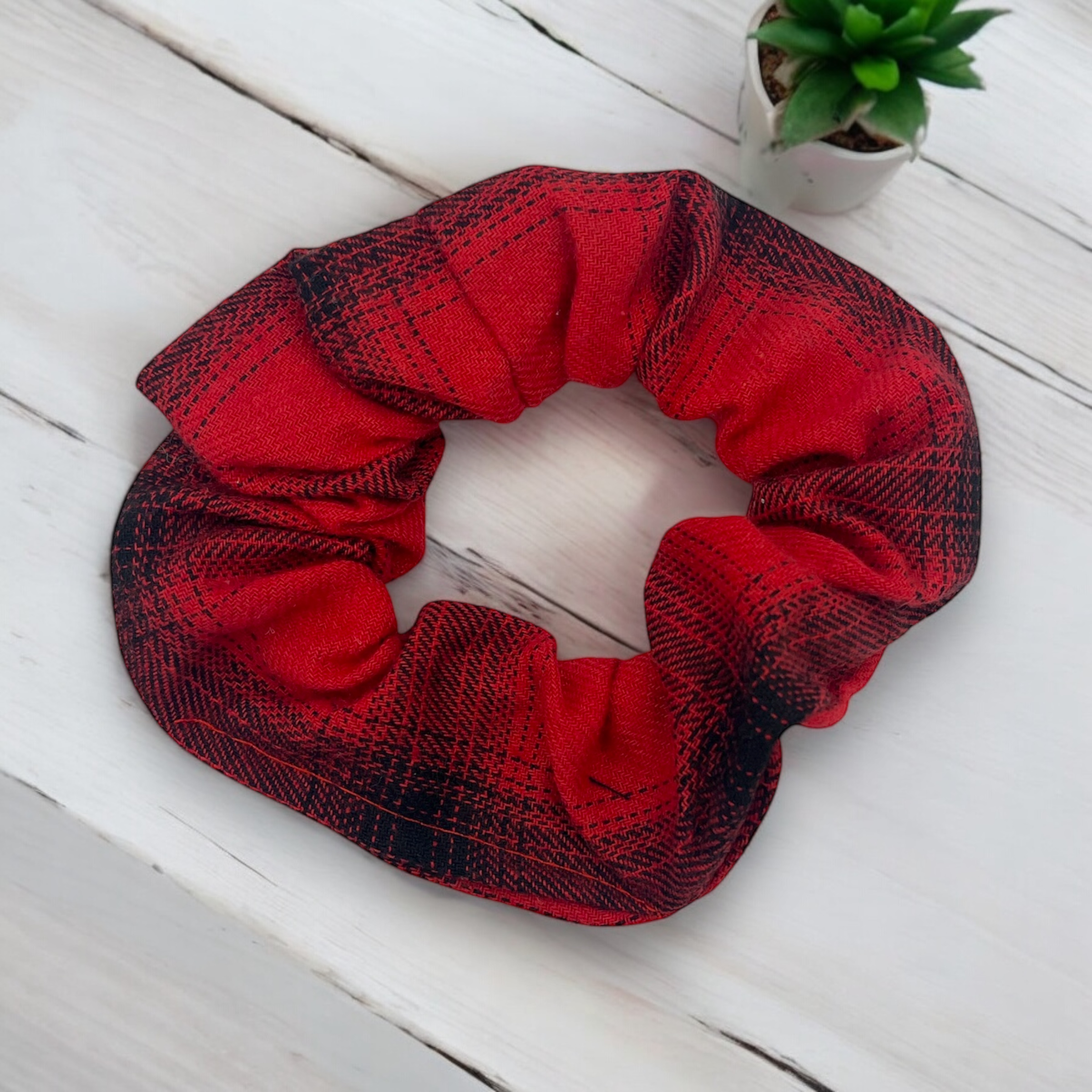 Gumka do włosów typu scrunchie w kolorze czerwono–czarnym w kratkę, grubsza tkanina.