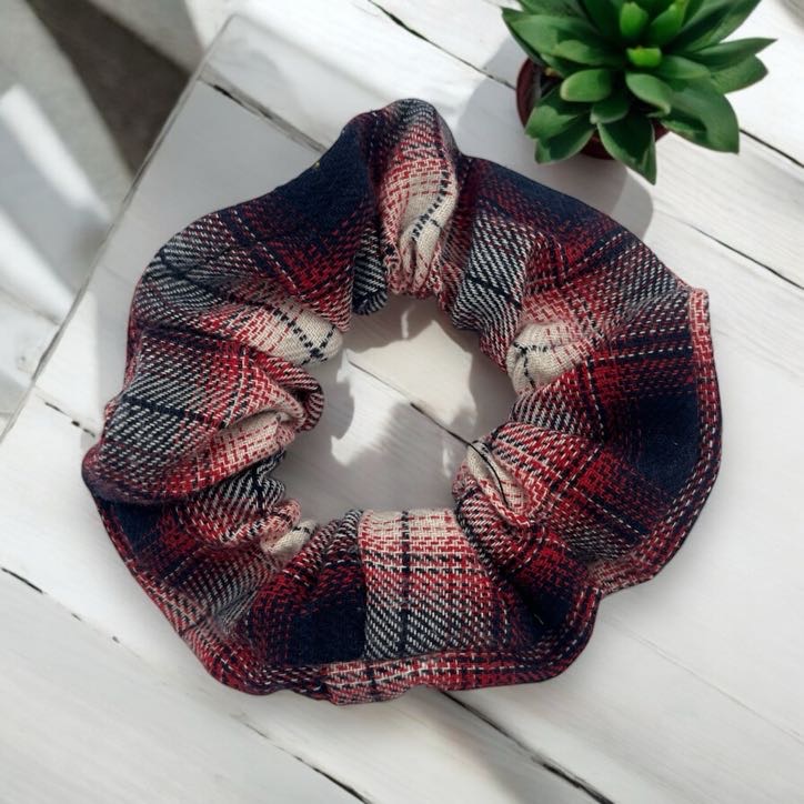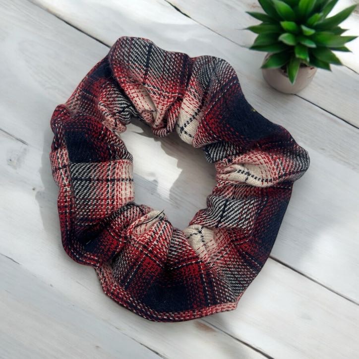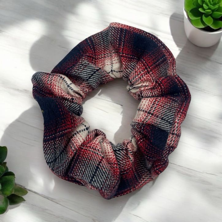 Gumka do włosów typu scrunchie w kolorze czerwono–granatowym w kratkę, grubsza tkanina.