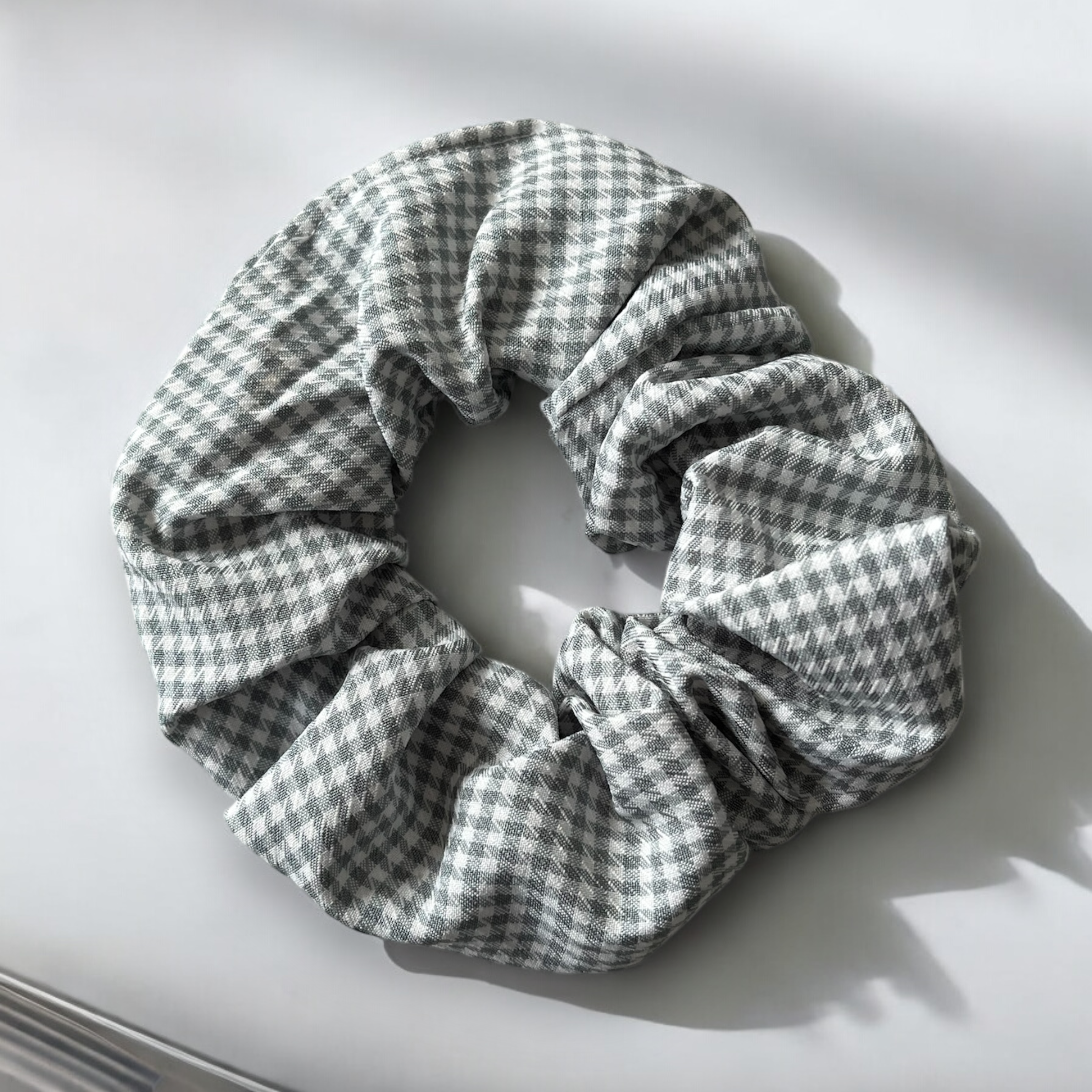Gumka do włosów typu scrunchie w pepitkę w kolorze szarym.