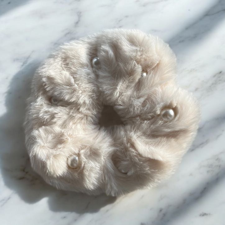 Puszysta gumka do włosów typu scrunchie w kolorze ecru z perełkami.