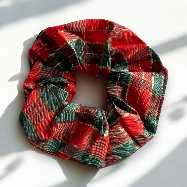 Gumka do włosów scrunchie w kolorze czerwono–zielonym w kratkę.
