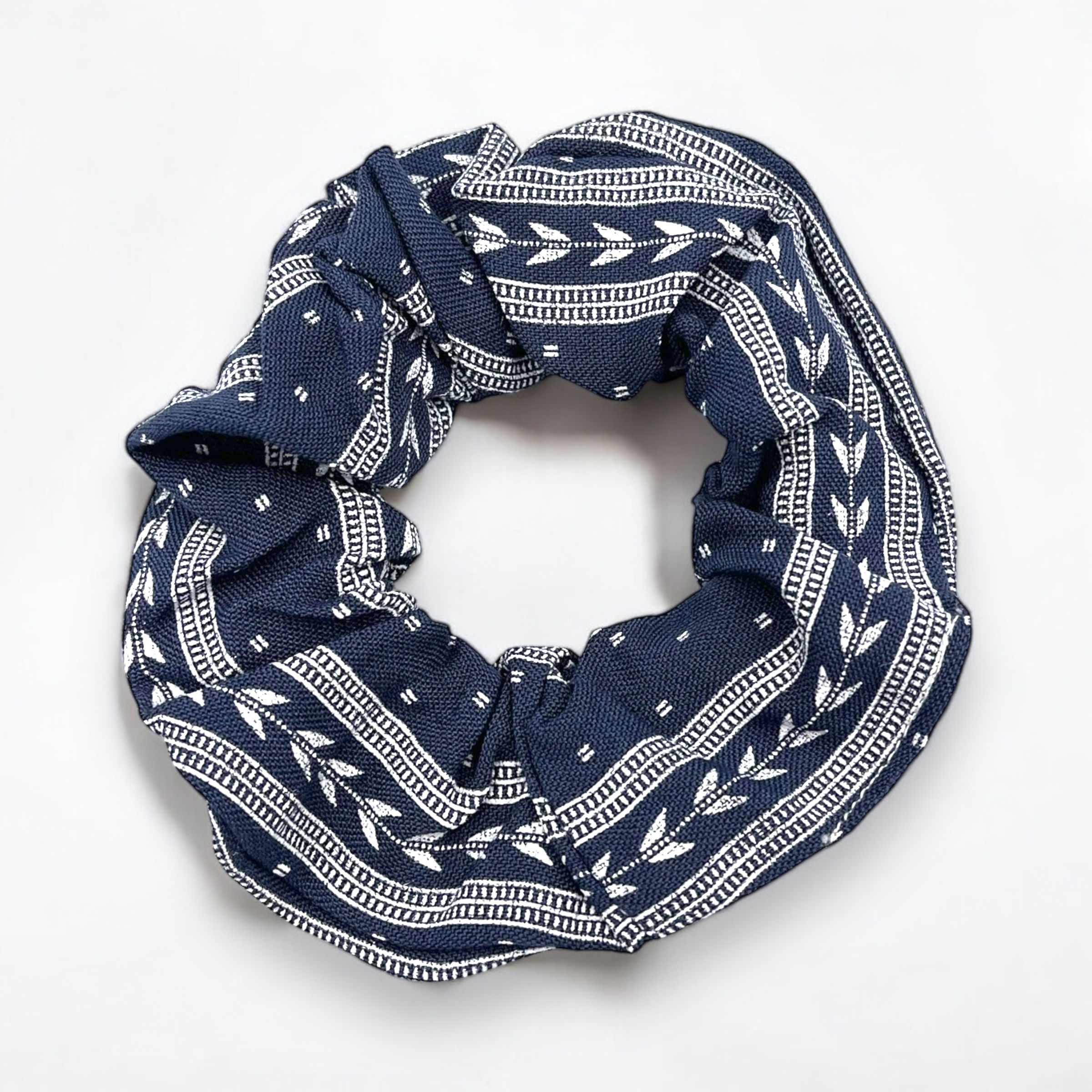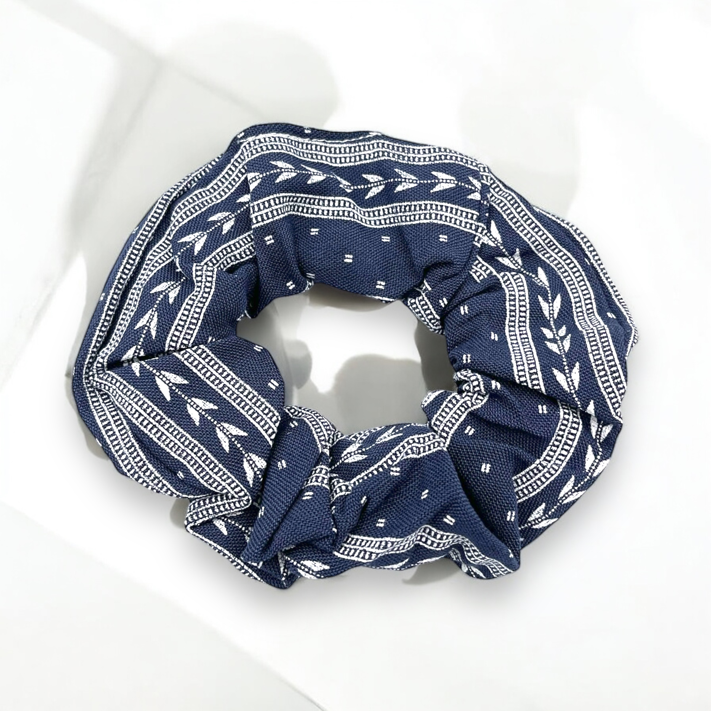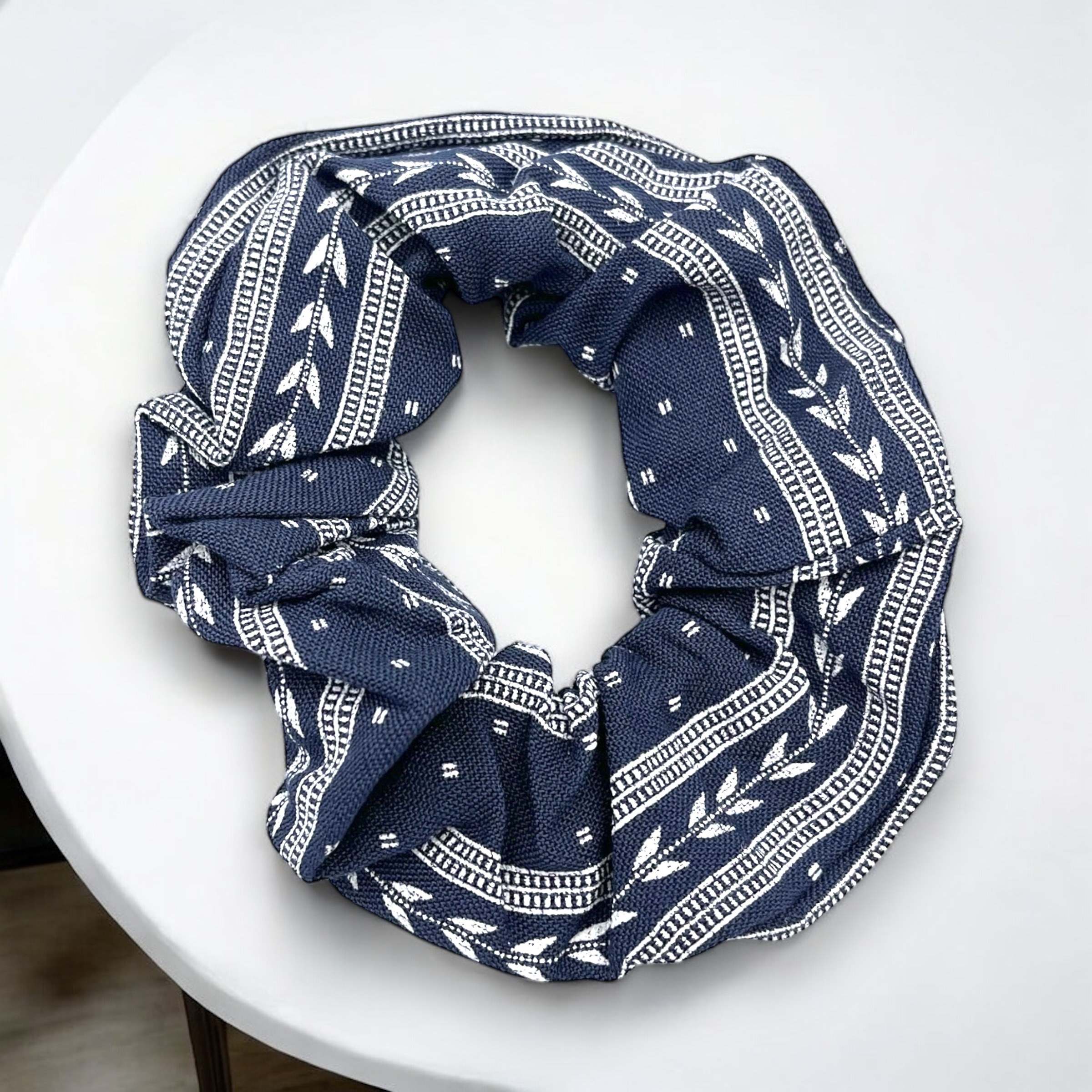 Gumka do włosów typu scrunchie w kolorze granatowym z wzorkiem.