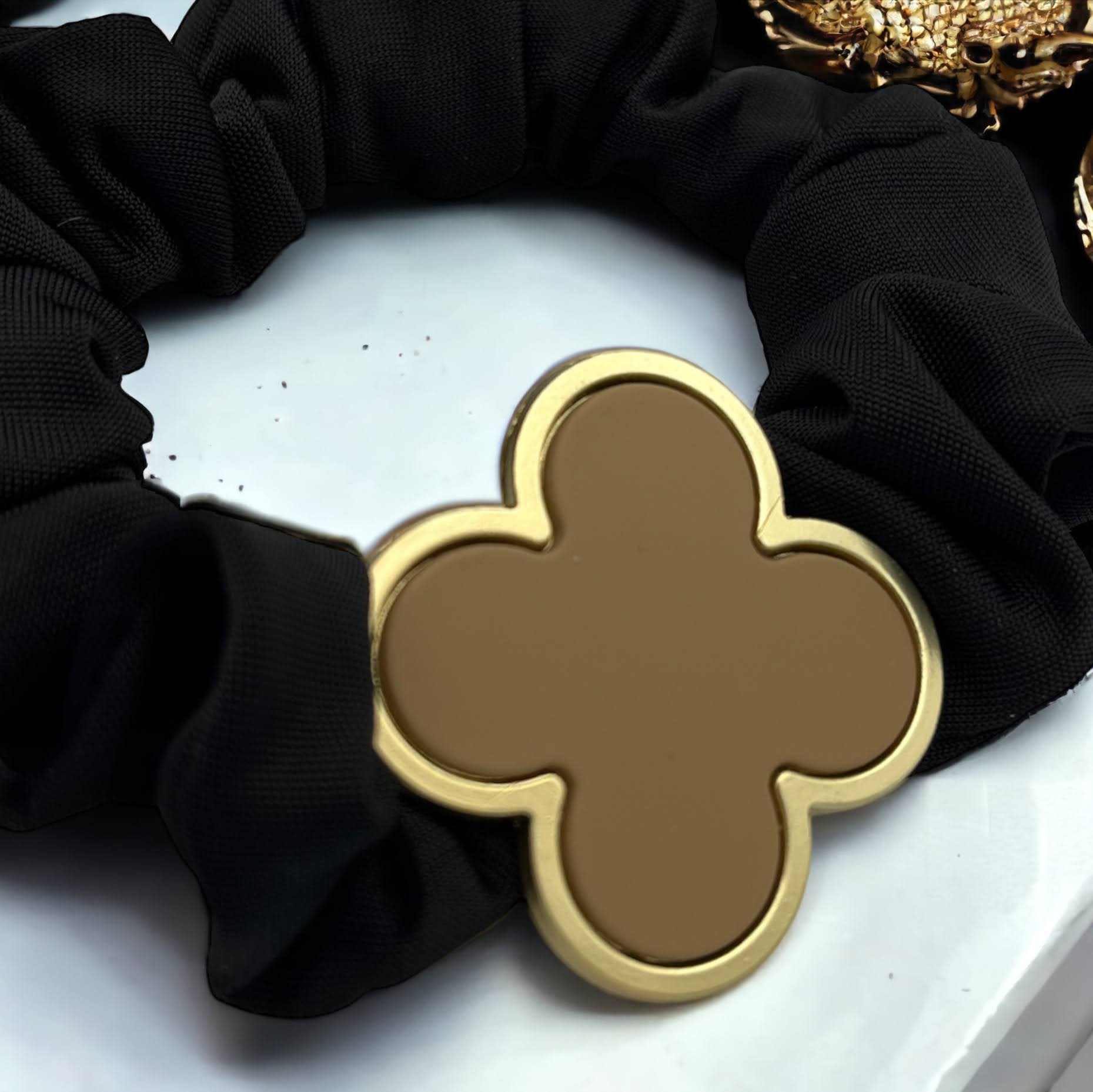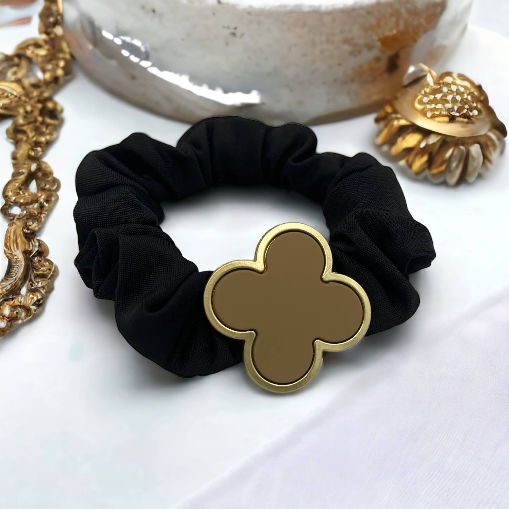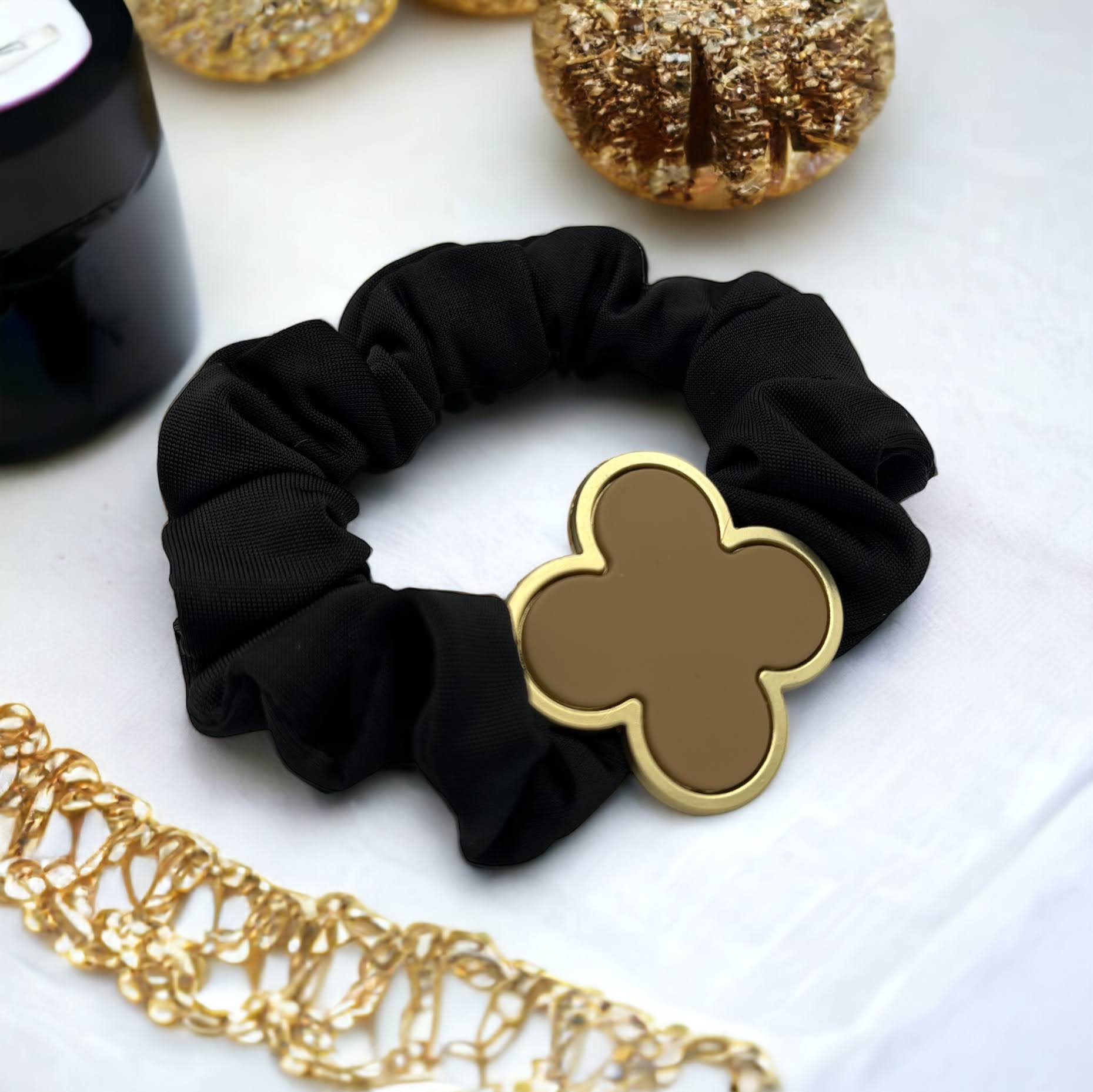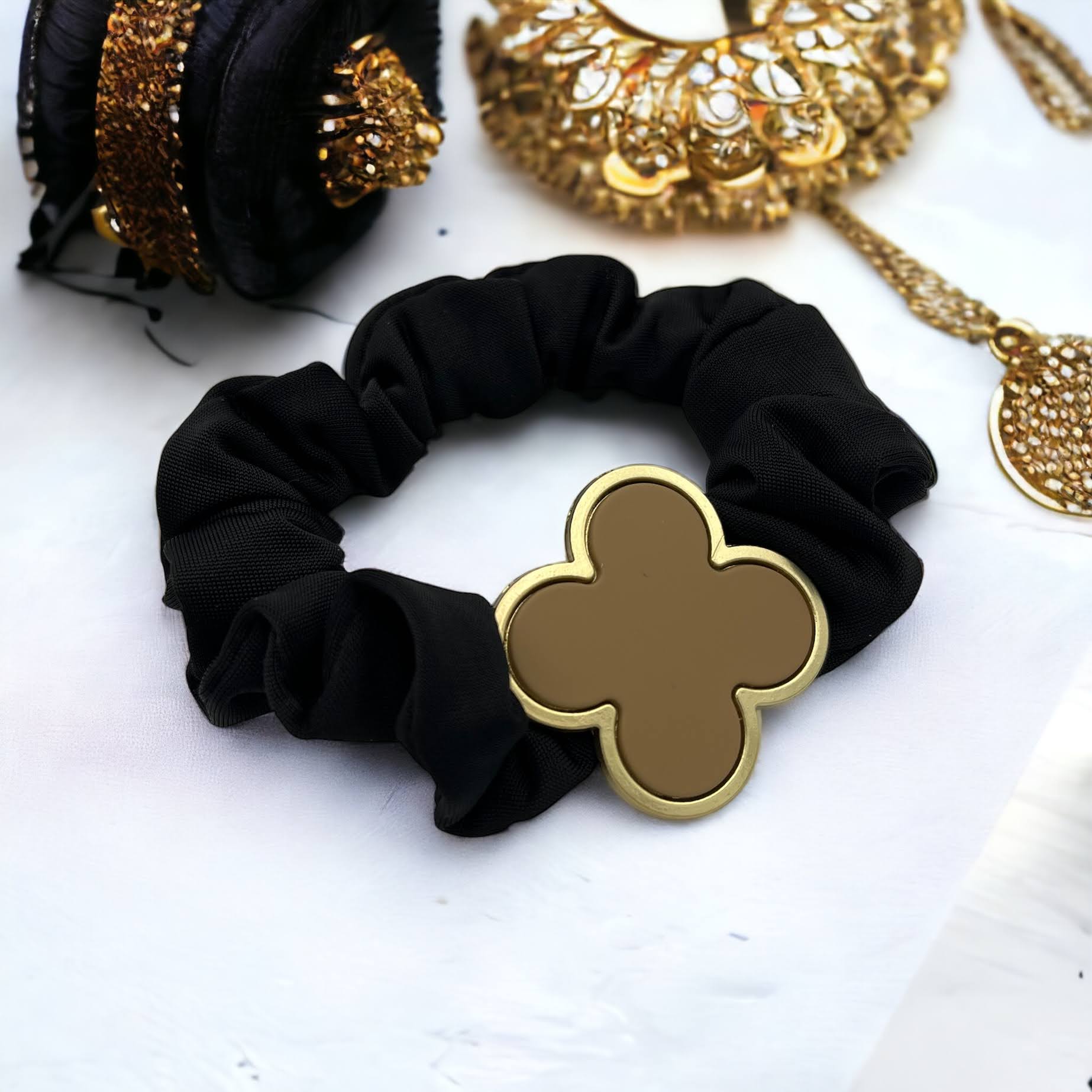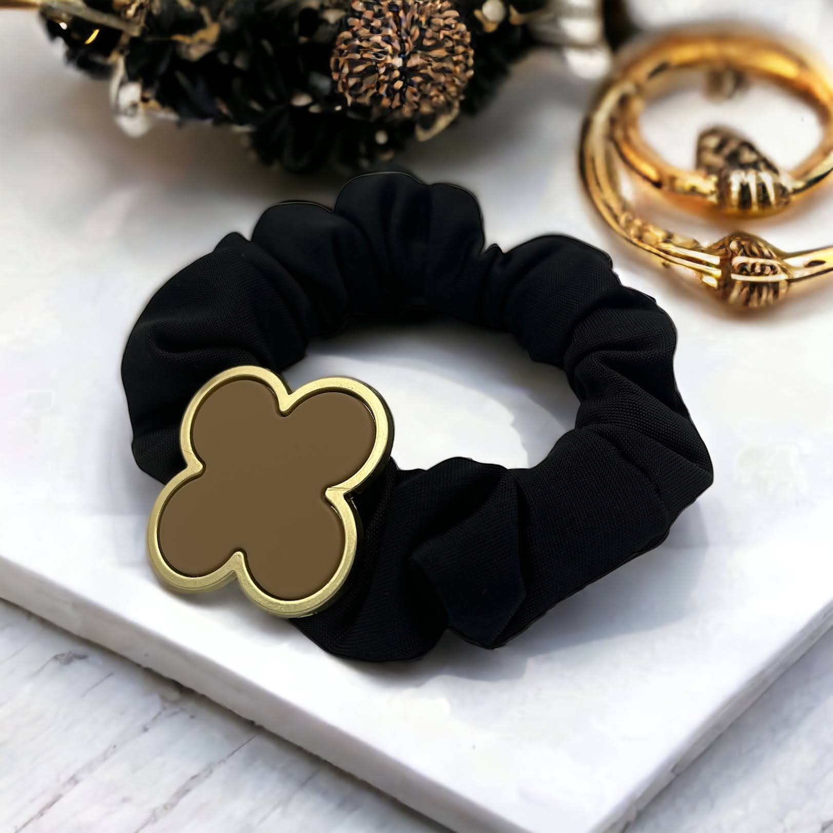 Ozdobna gumka do włosów w kolorze czarnym z elementem ozdobnym – kwiatek, koniczynka.