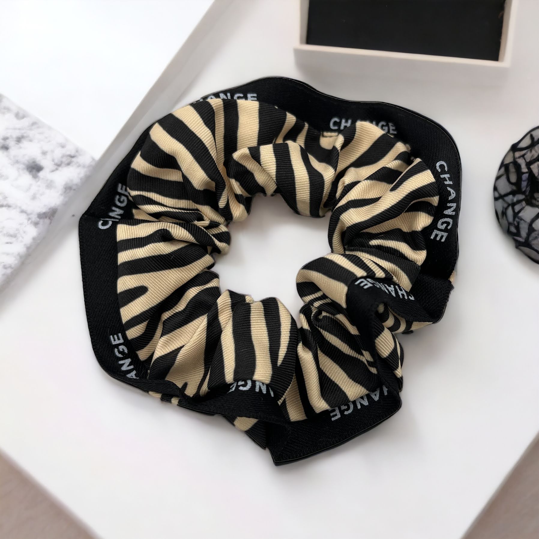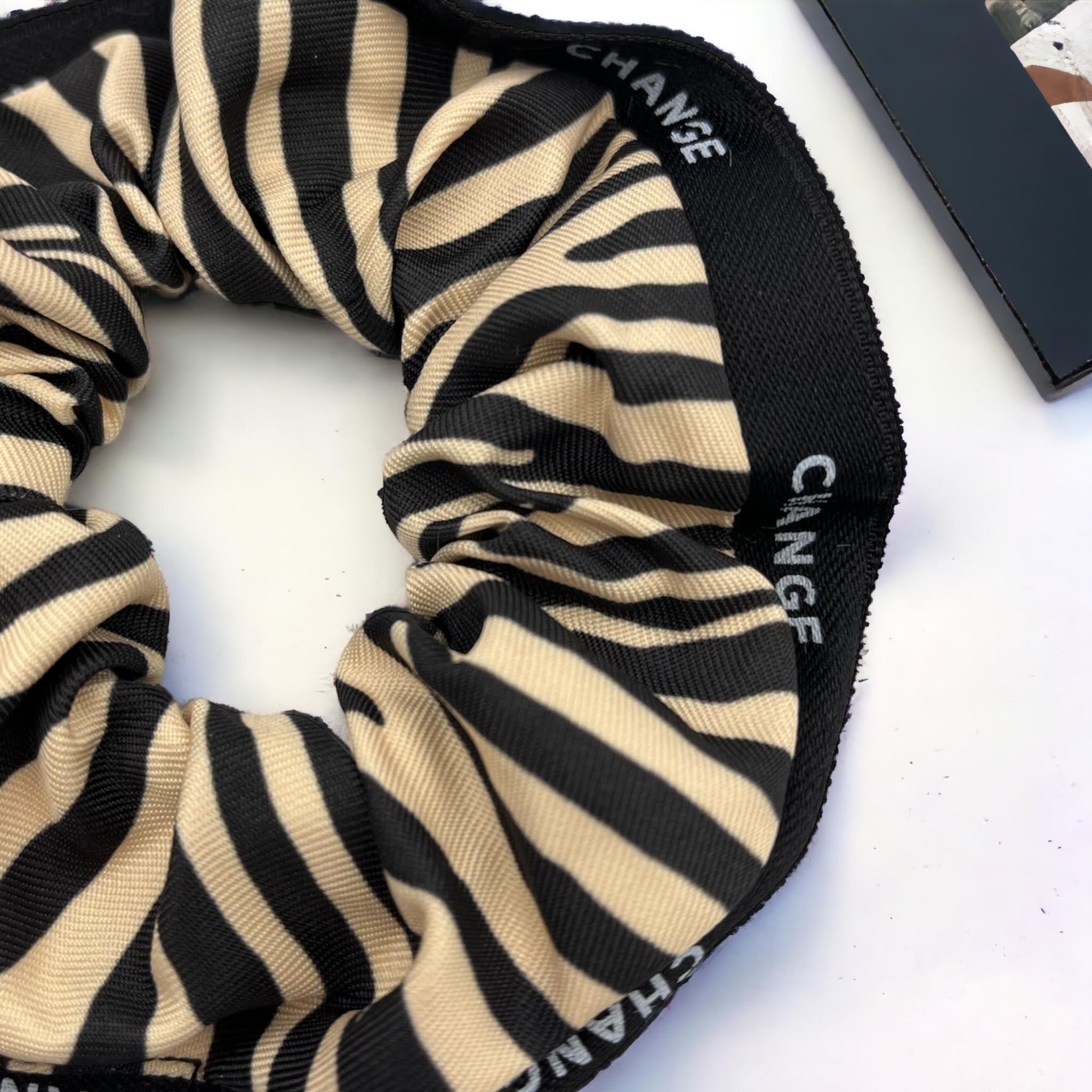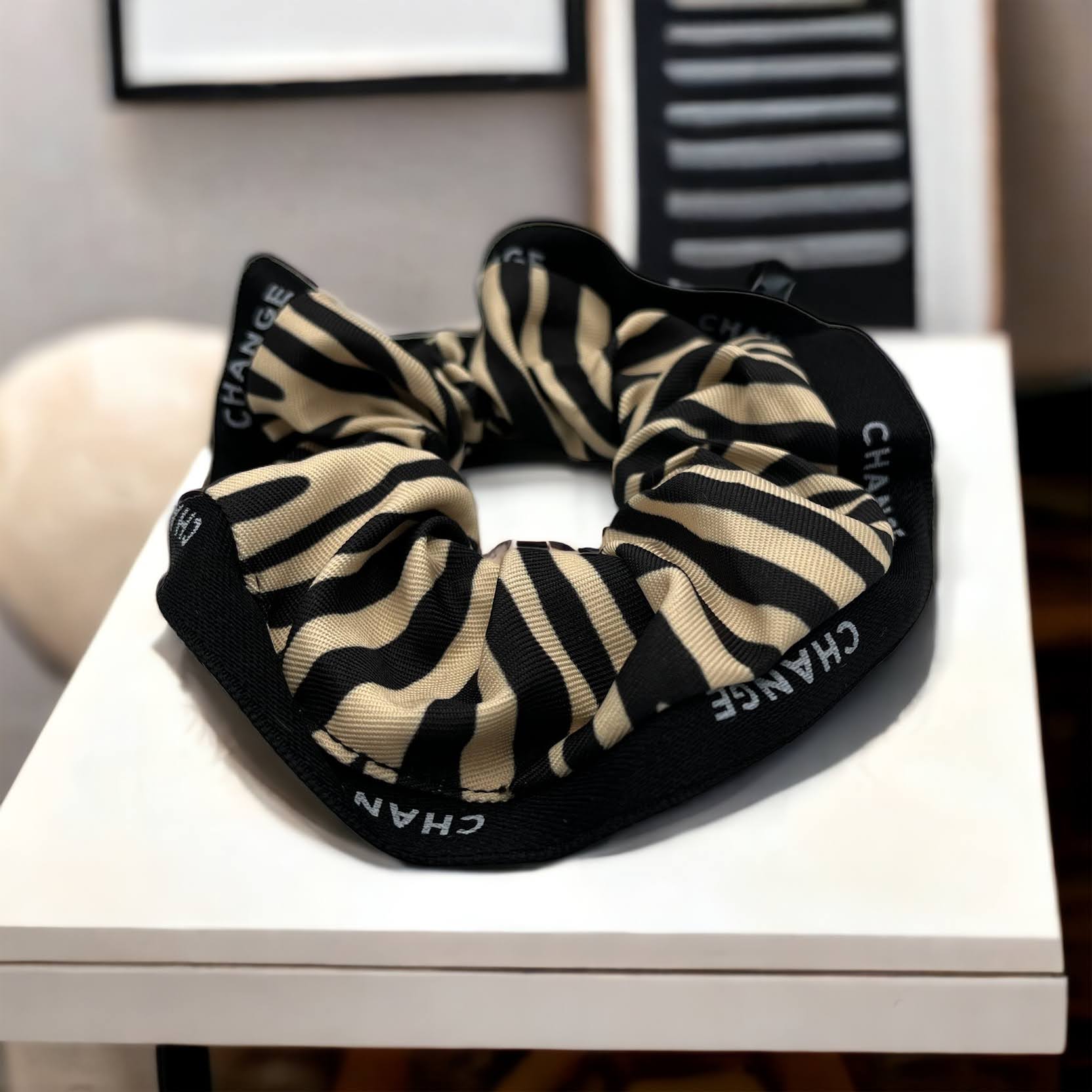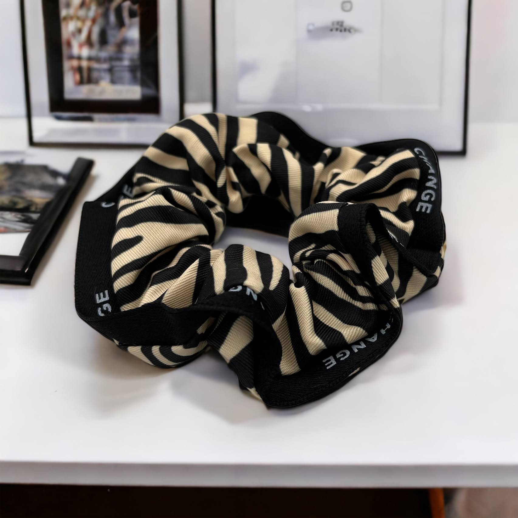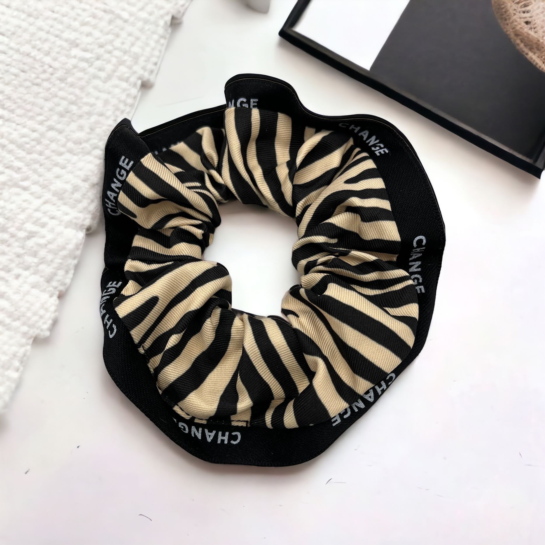 Gumka do włosów typu scrunchie w kolorze czarno-beżowym, z motywem w zebrę/prążki.