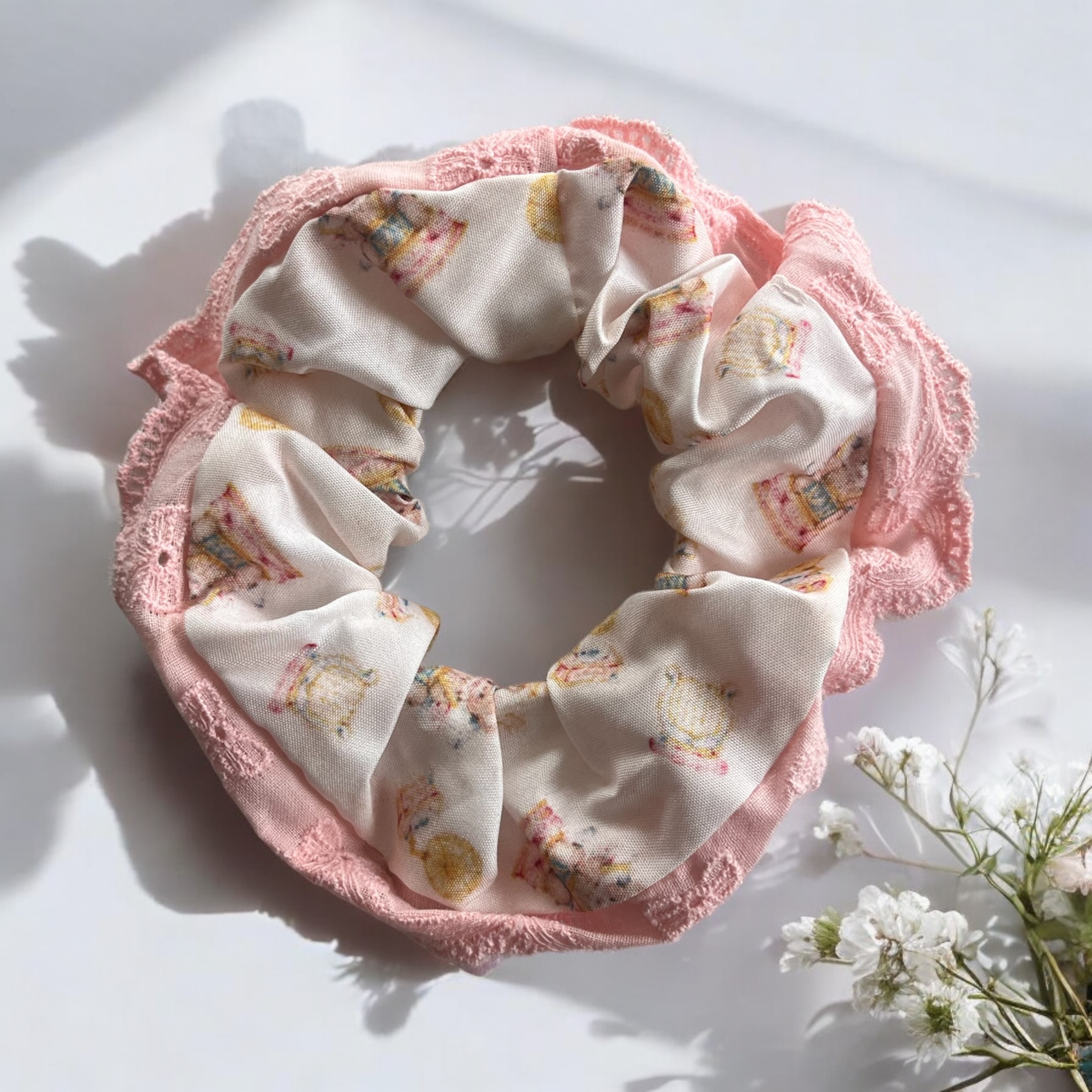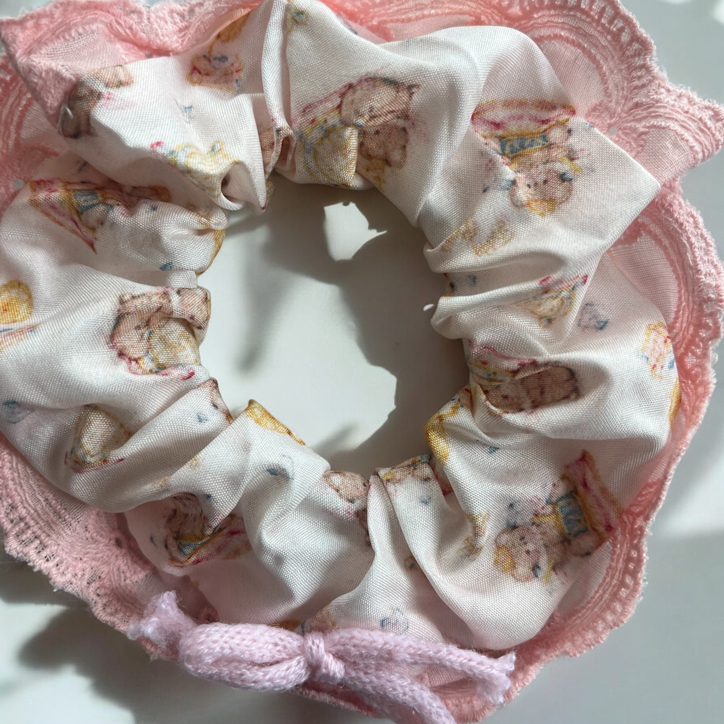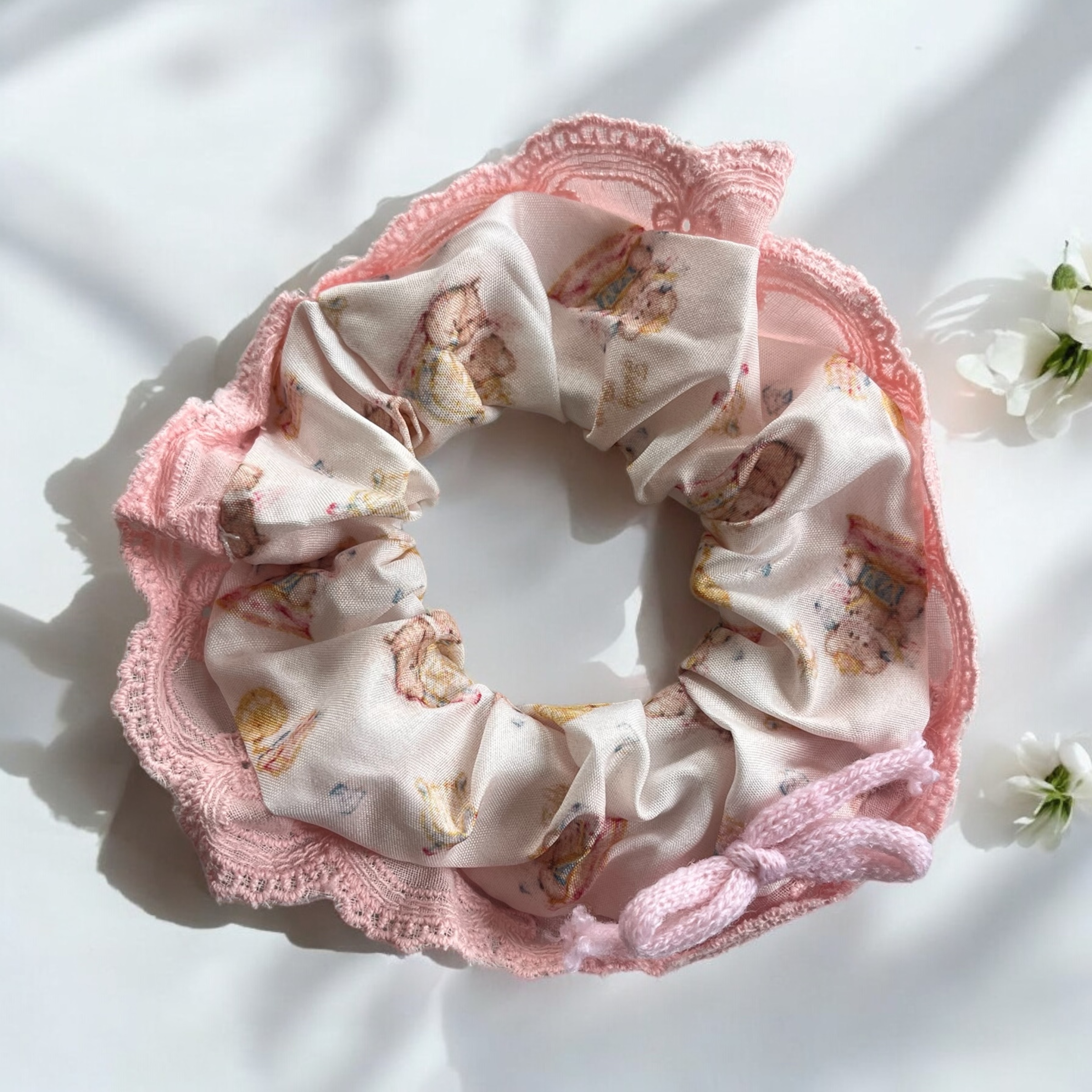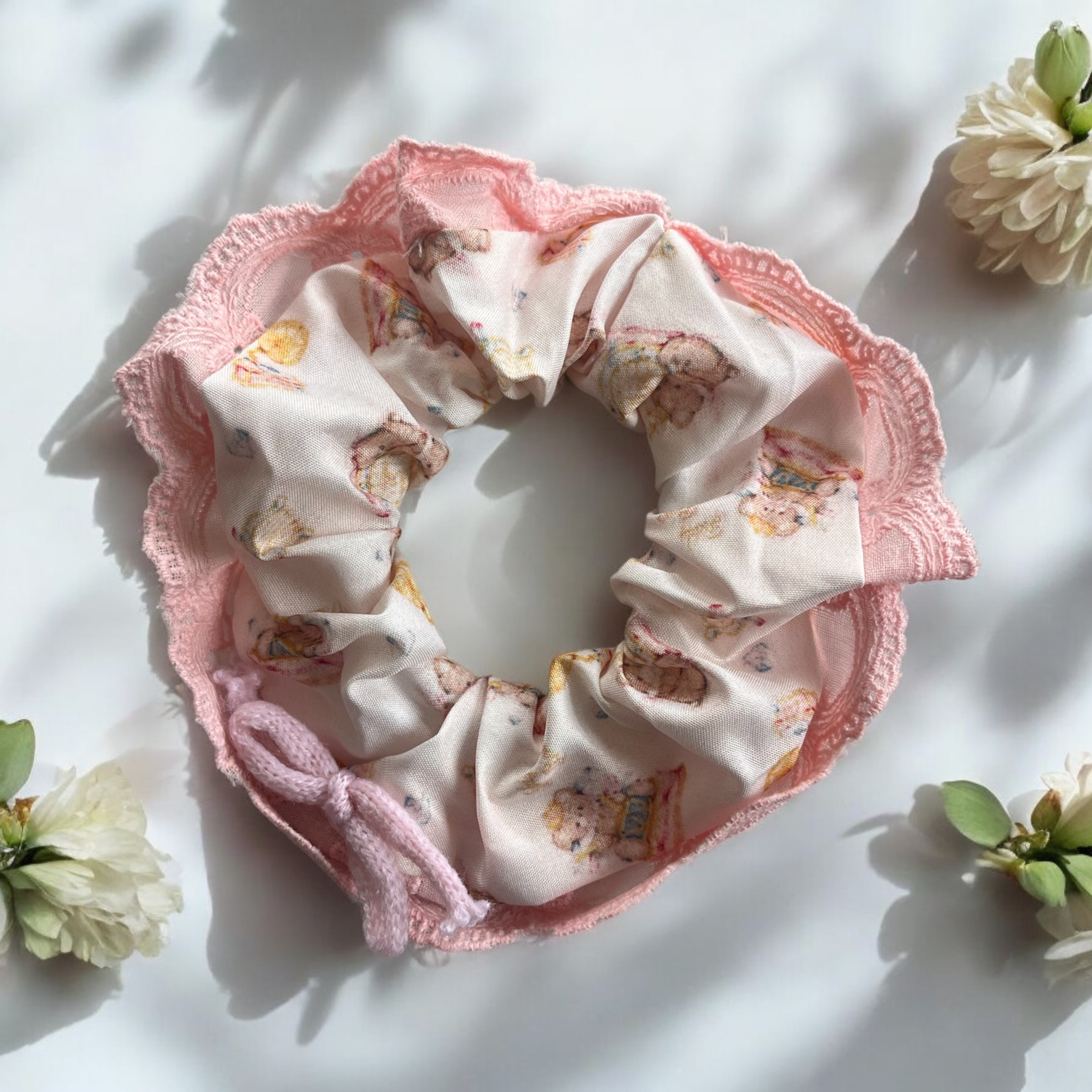 Gumka do włosów typu scrunchie w kolorze różowym z motywem w misie obszyta koronką.