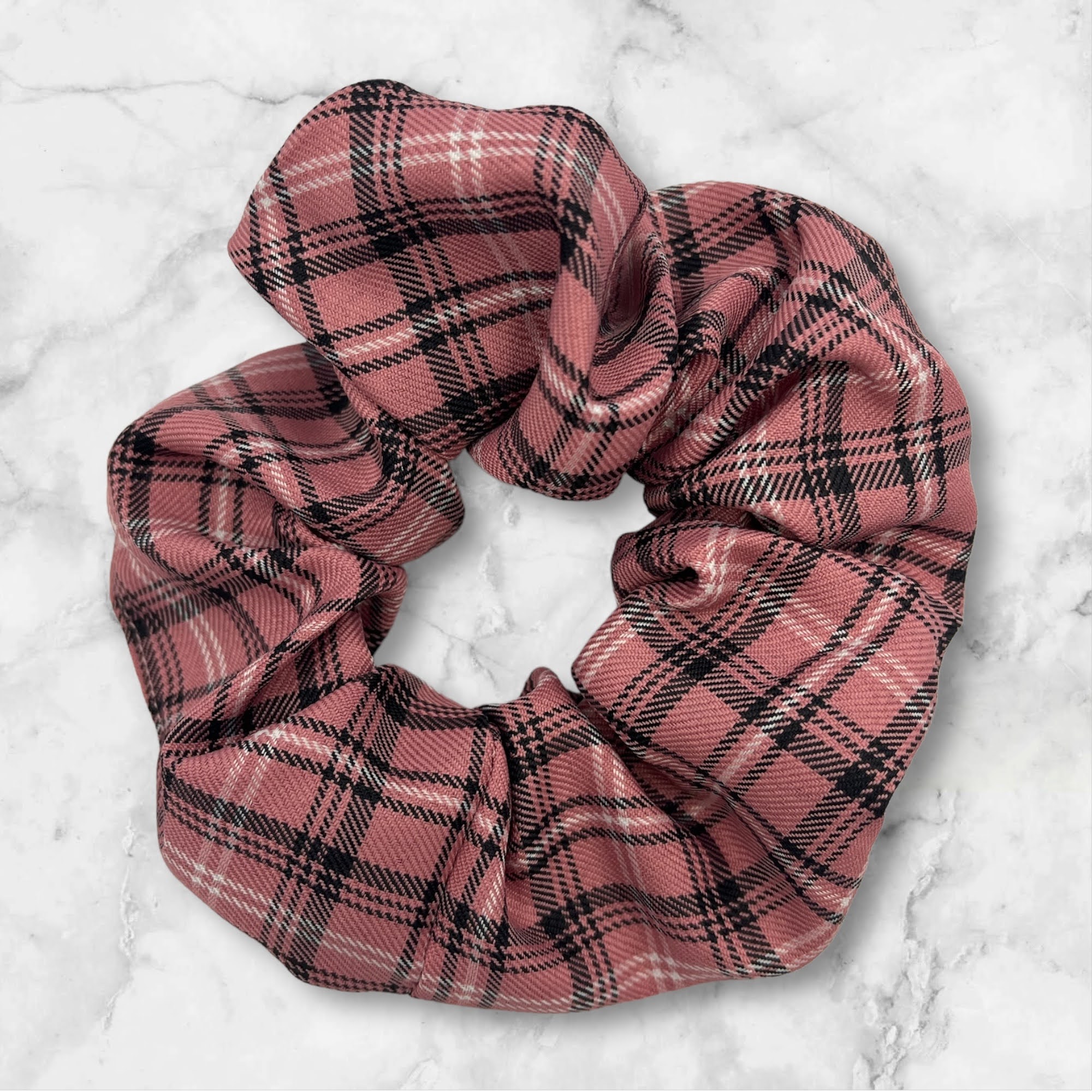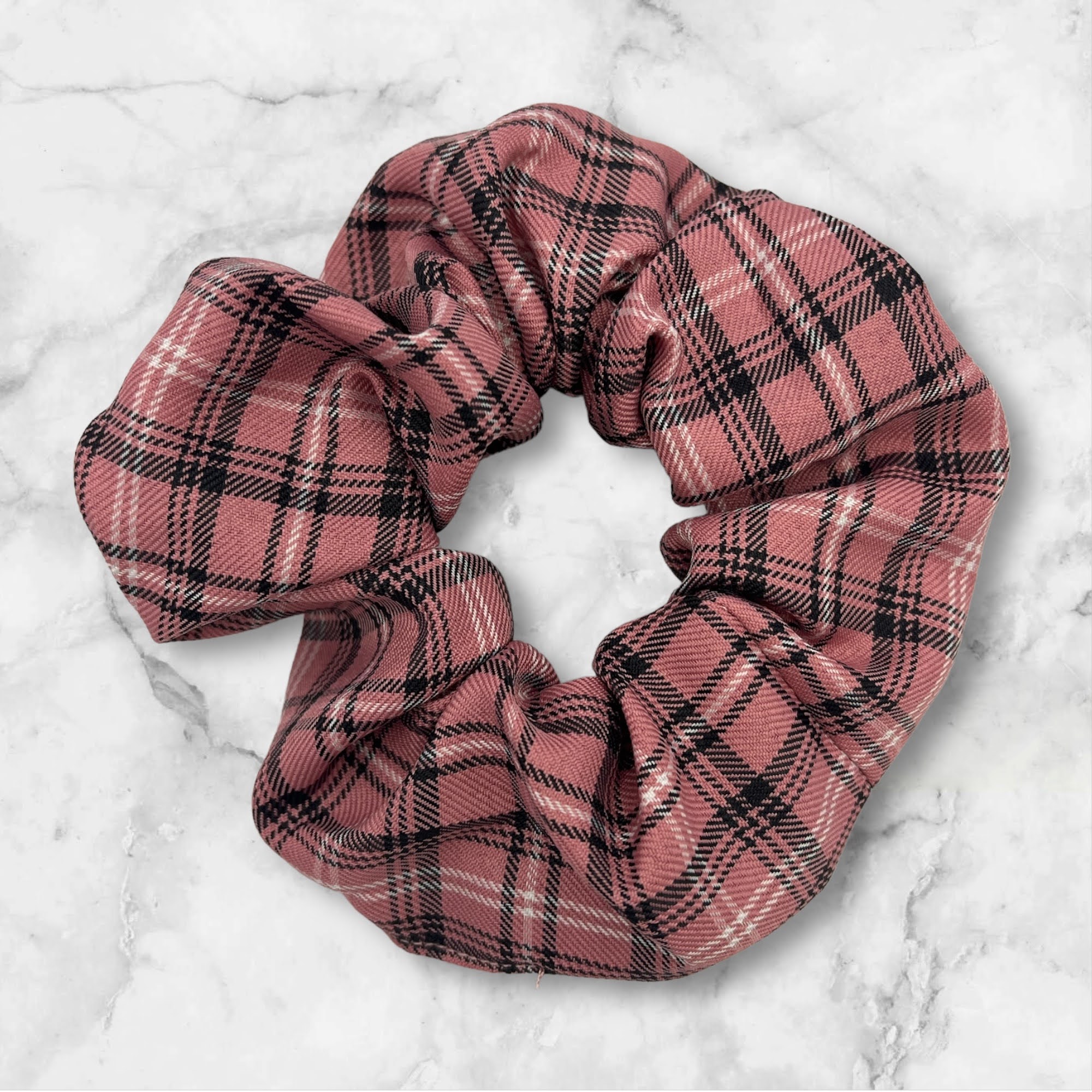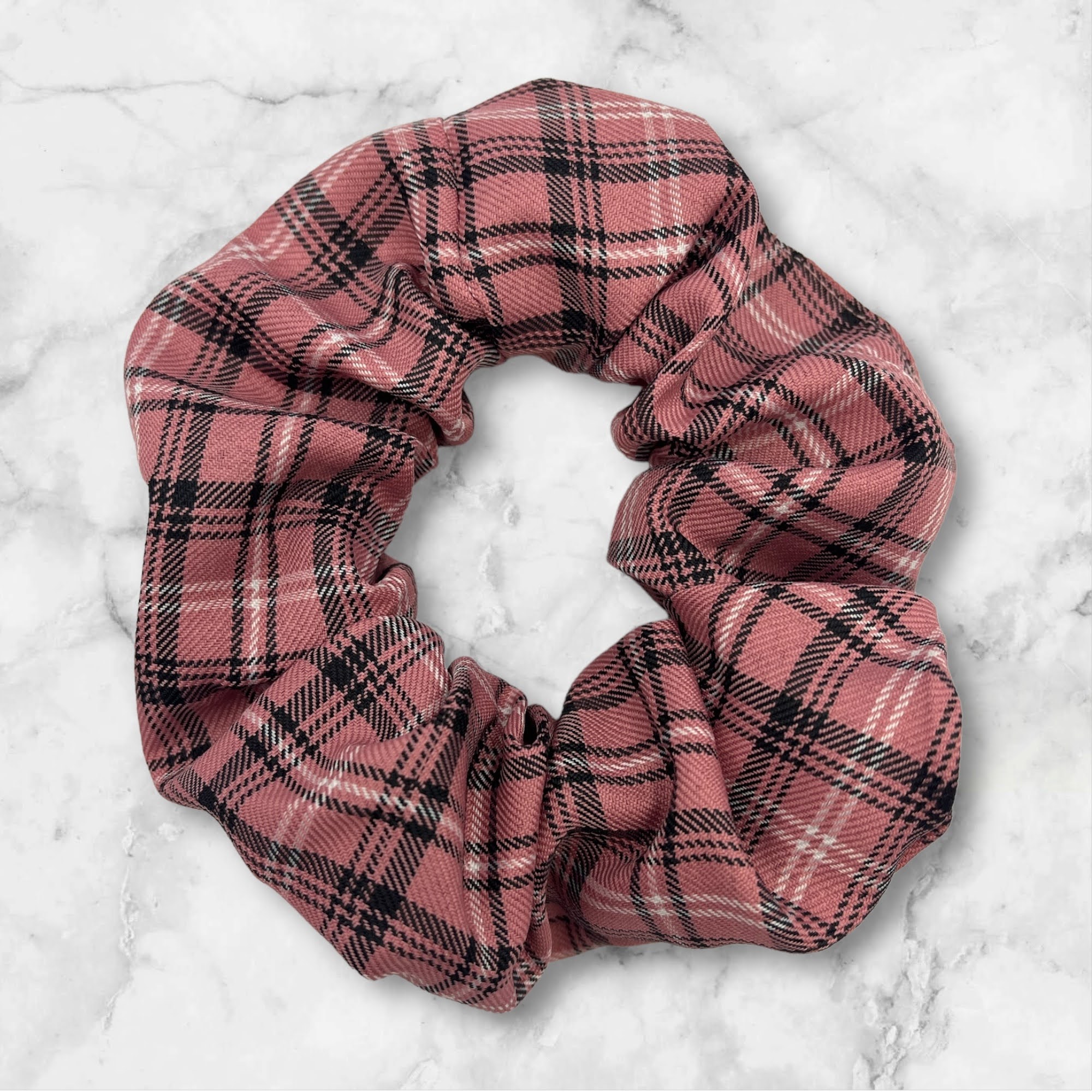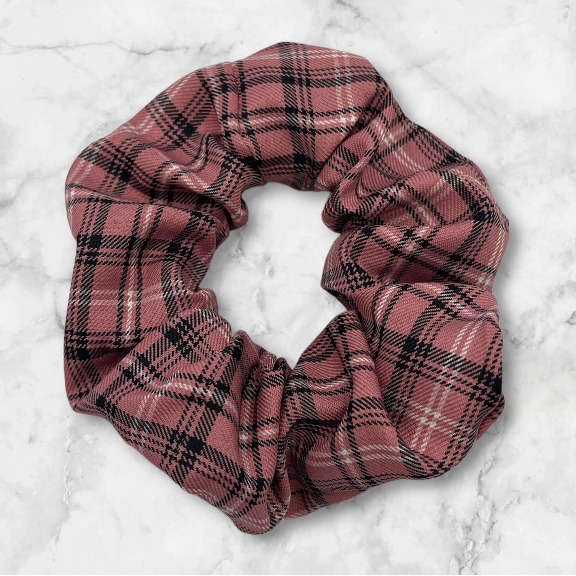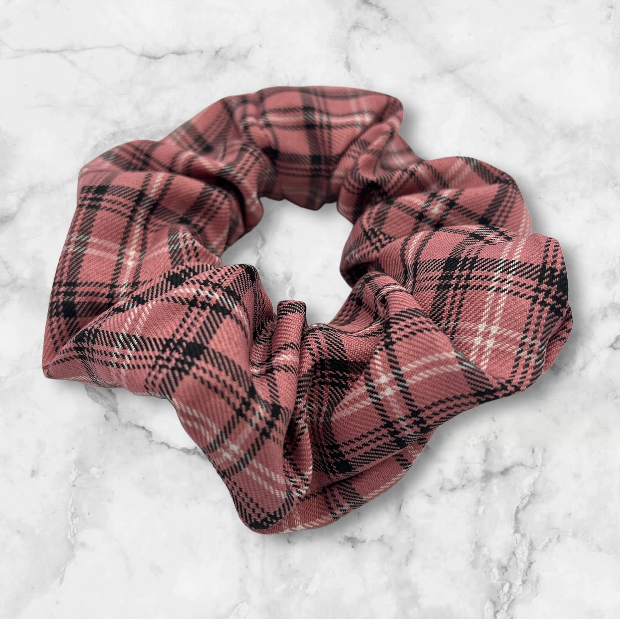 Gumka do włosów typu scrunchie w kolorze różowym, w kratkę.