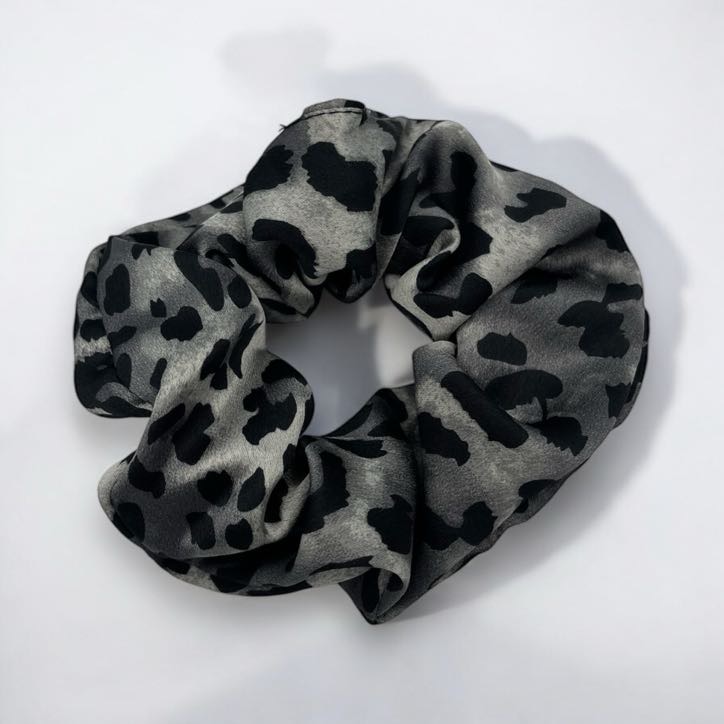 Gumka do włosów typu scrunchie w kolorze szarym z motywem w panterkę, satynowa.