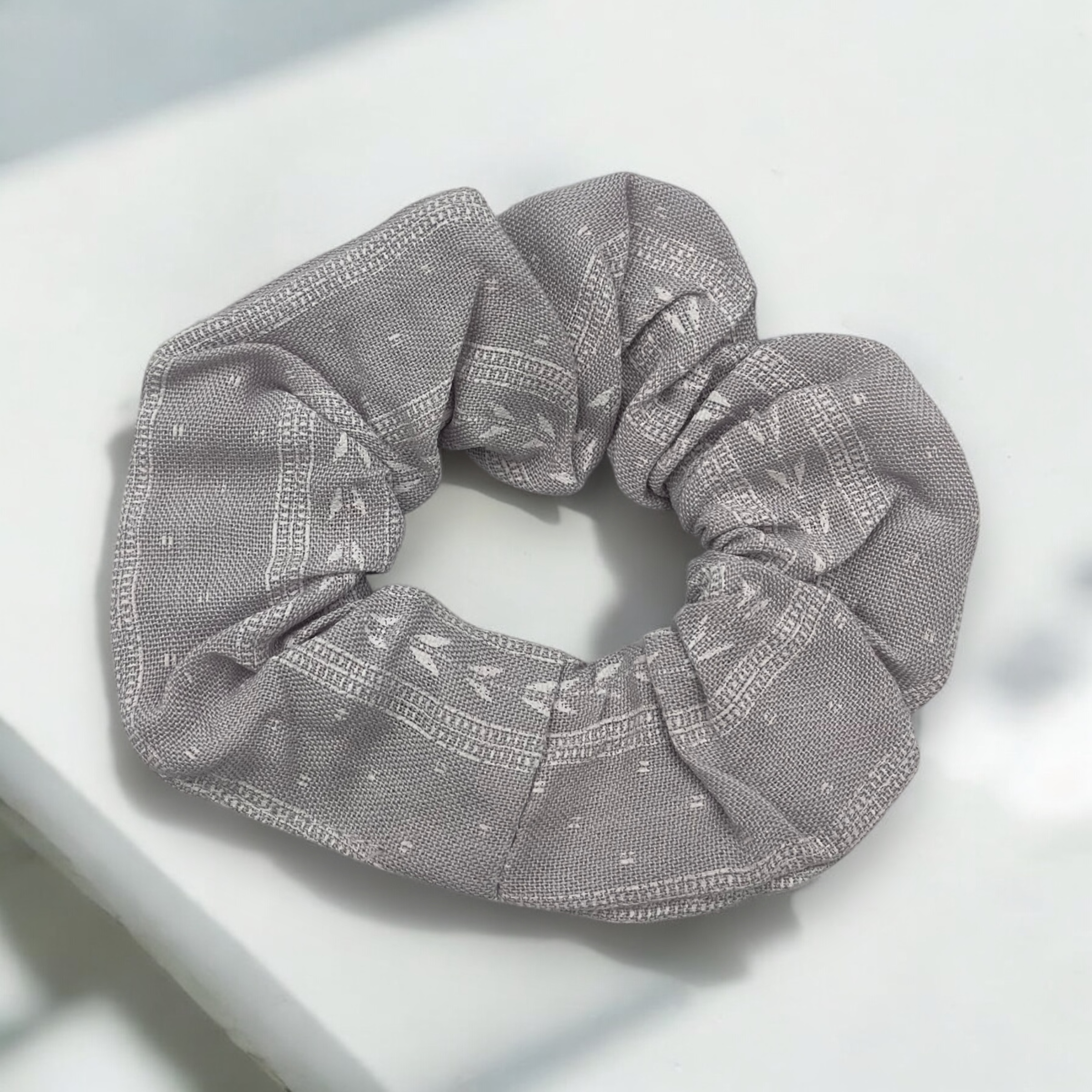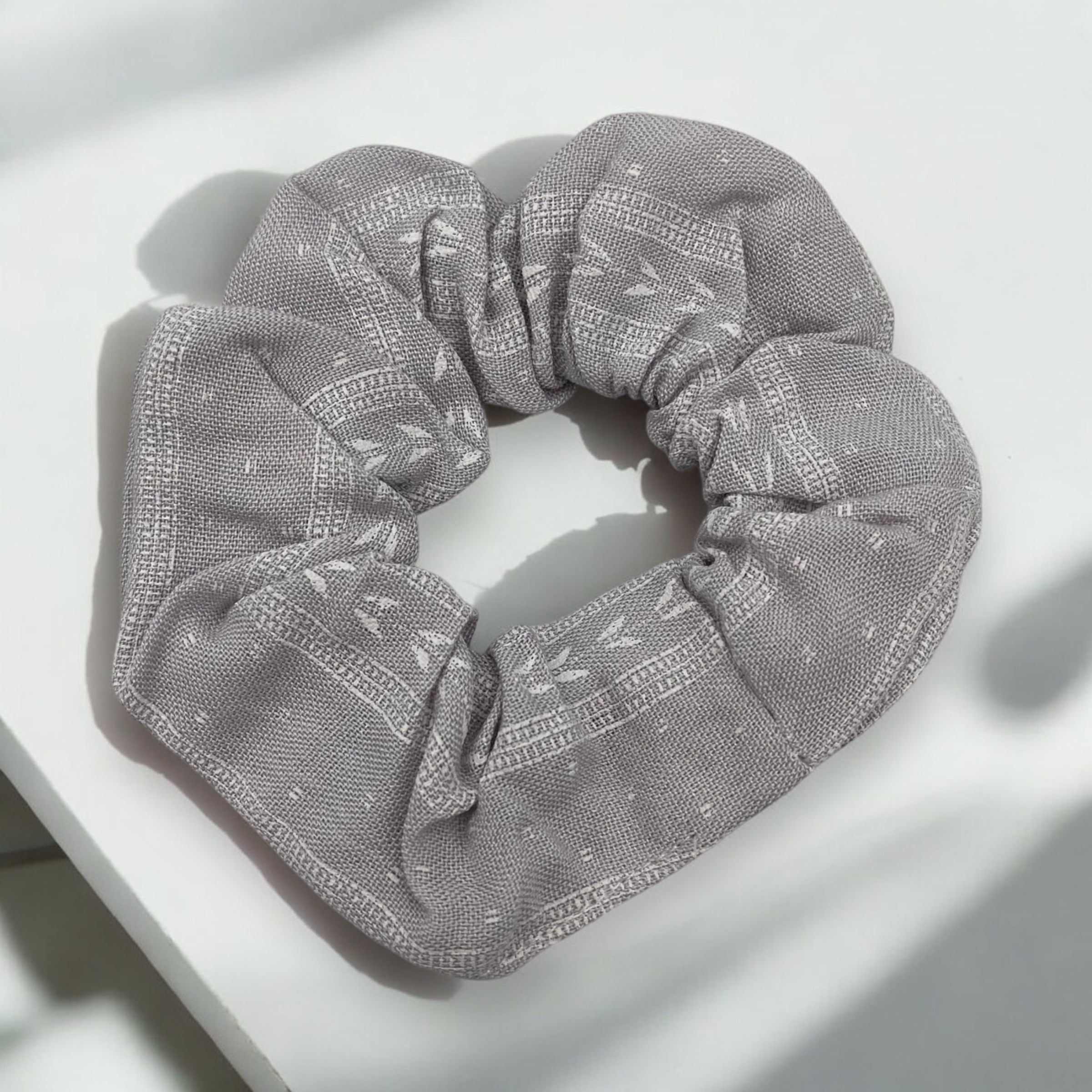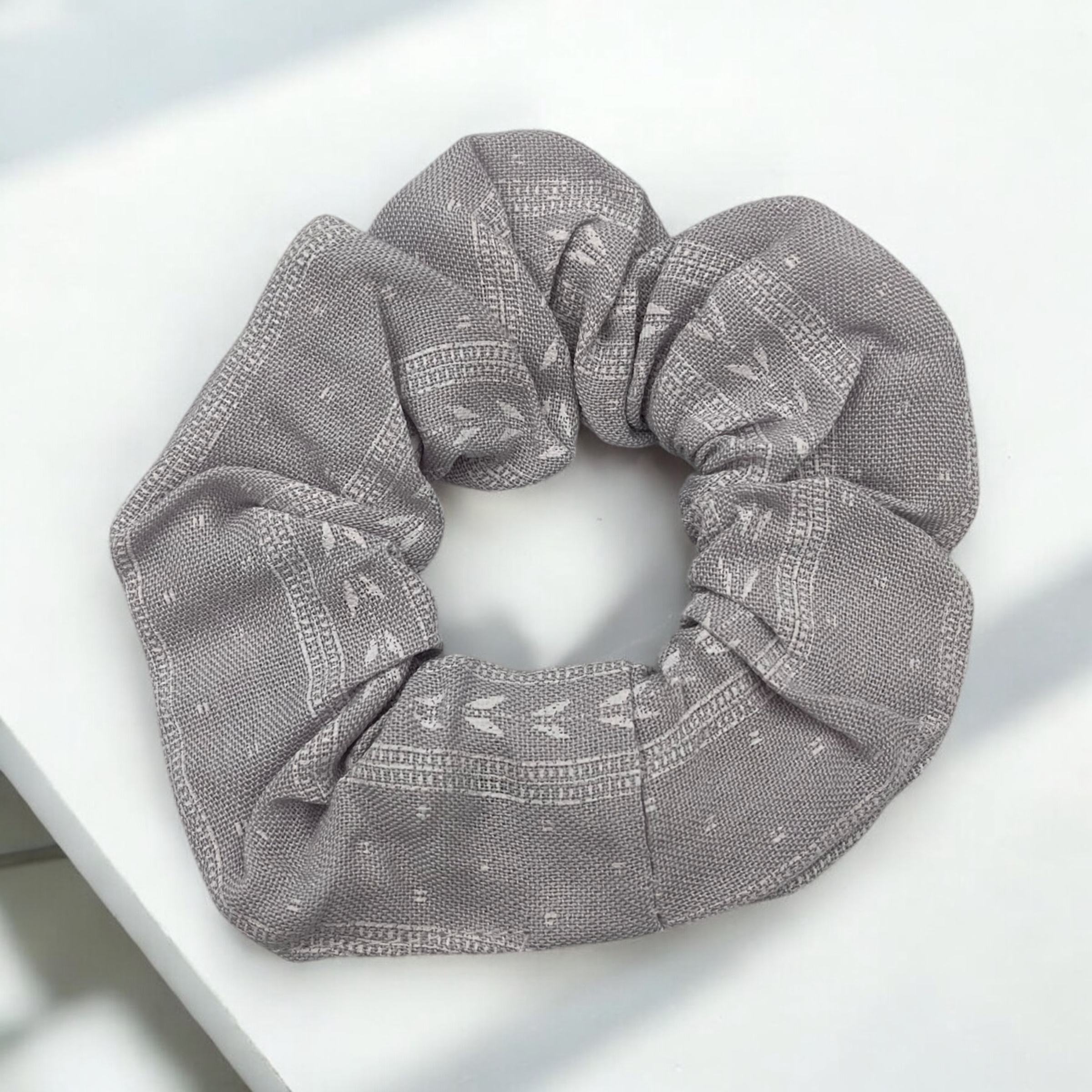 Gumka do włosów typu scrunchie w kolorze szarym z wzorkiem.