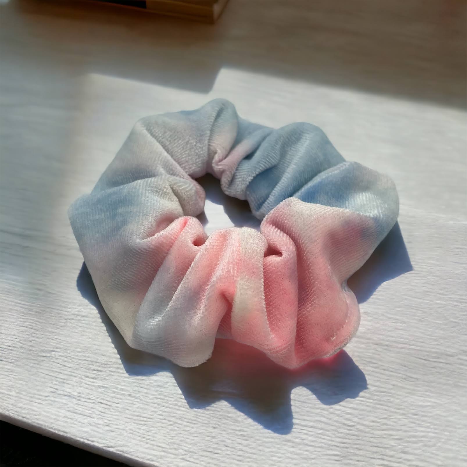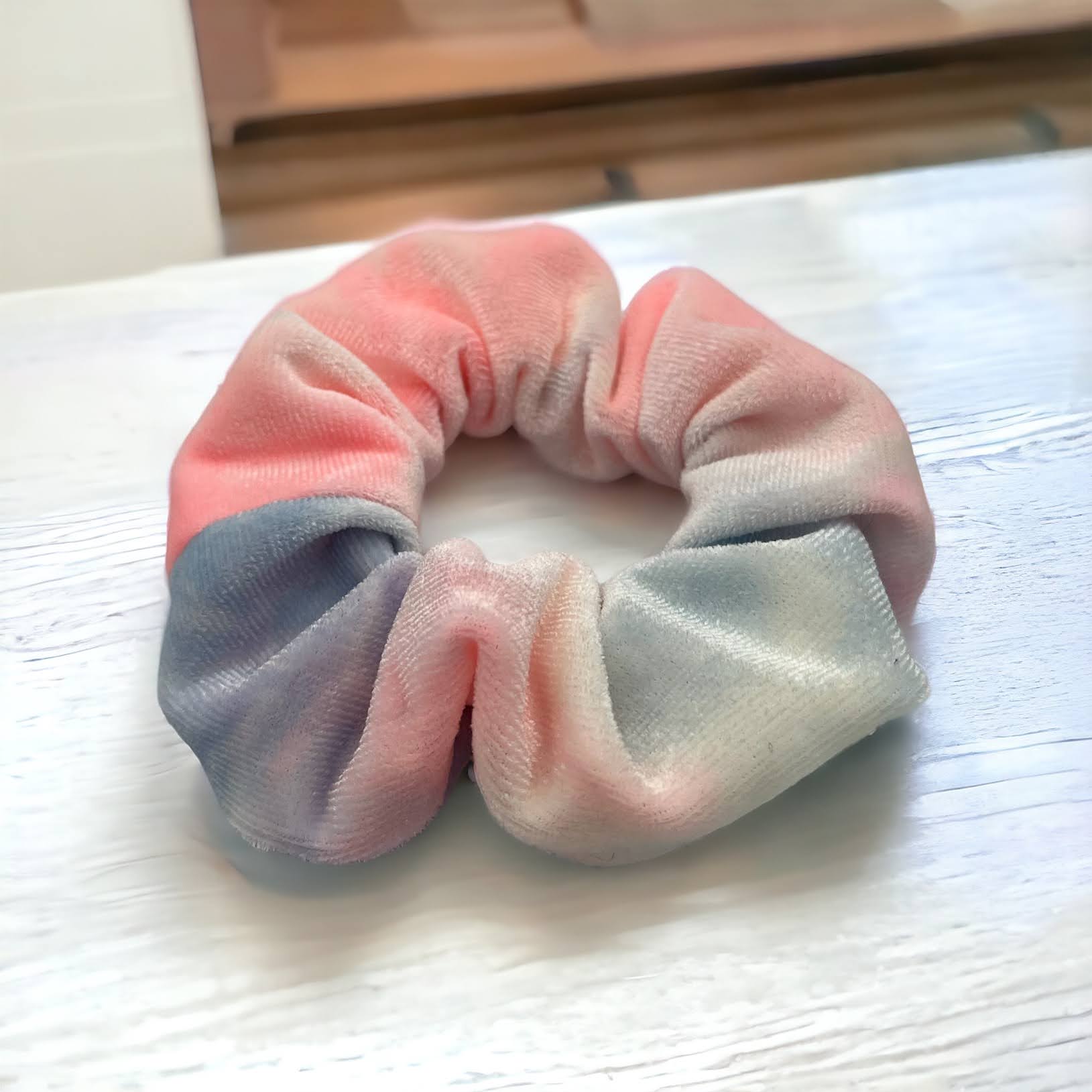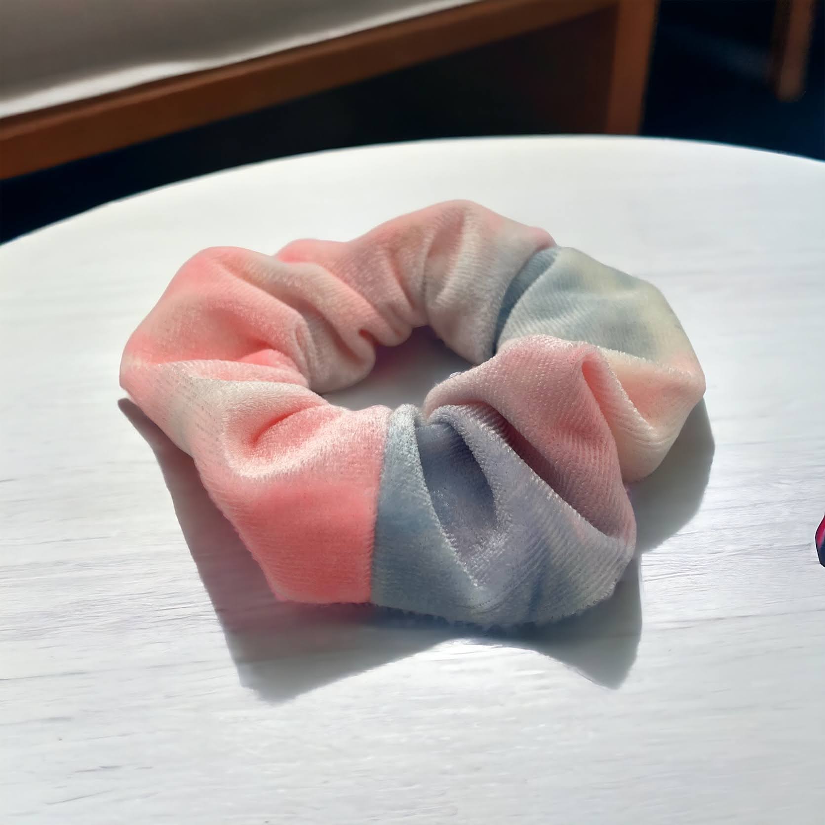 Gumka do włosów typu scrunchie w kolorze niebiesko-różowym – ombre, welurowa.