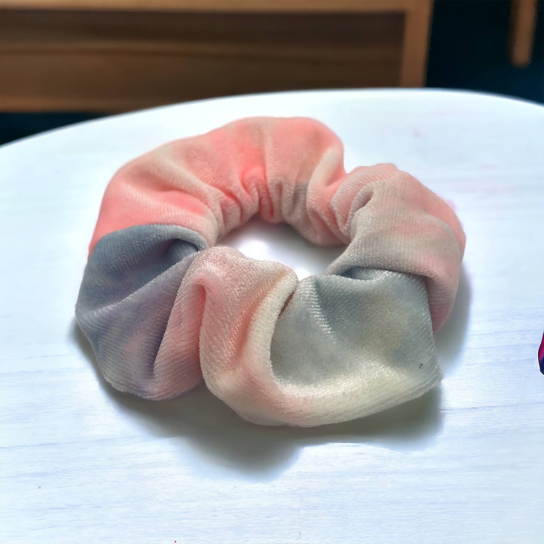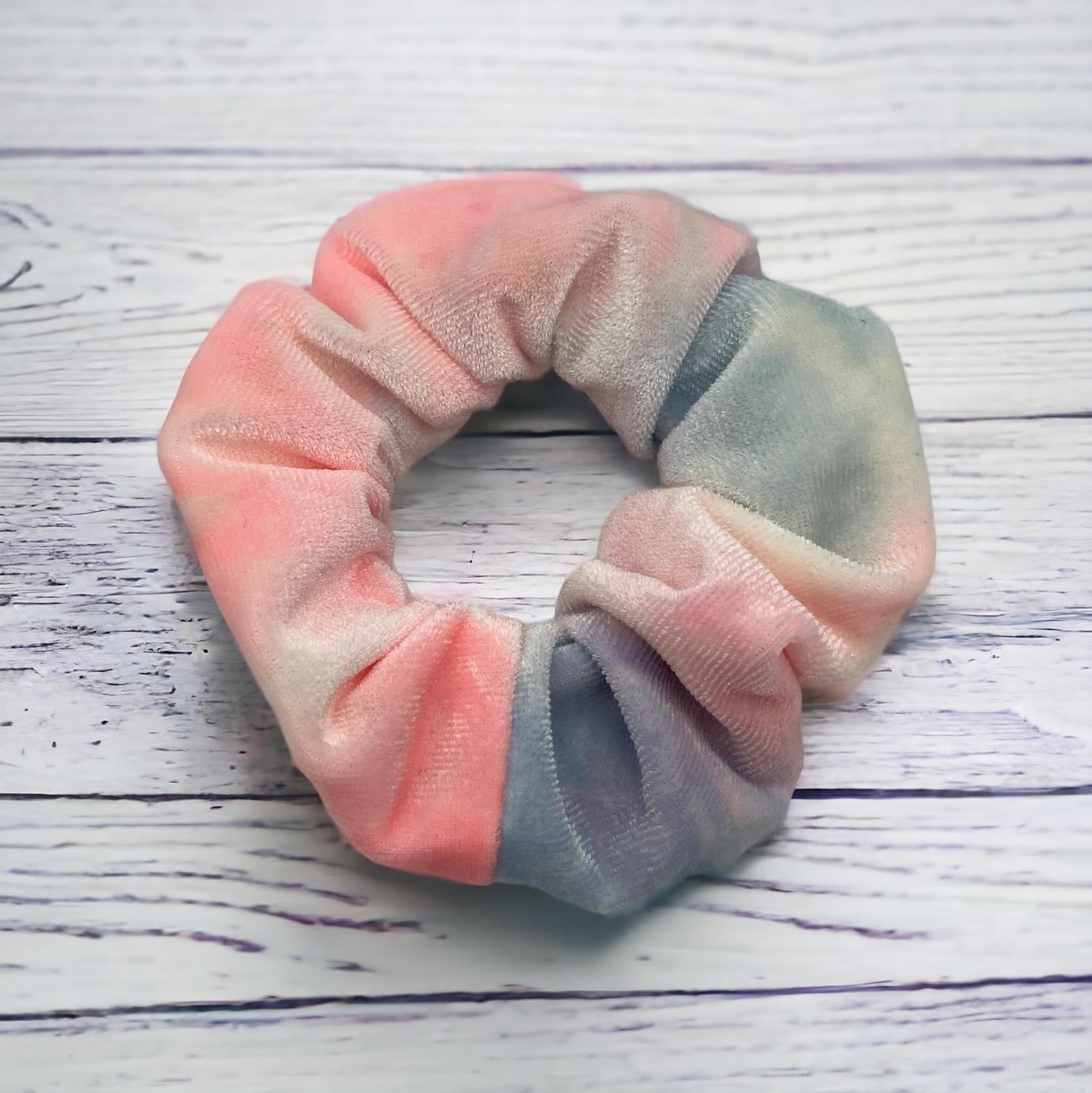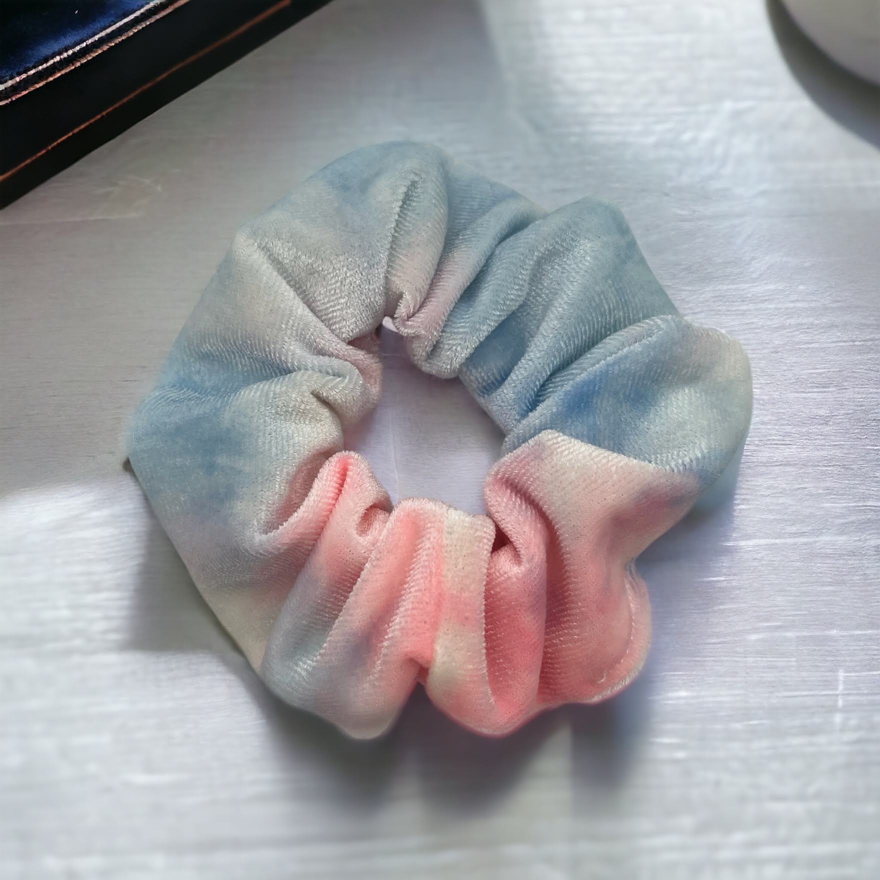 Gumka do włosów typu scrunchie w kolorze niebiesko-różowym – ombre, welurowa.
