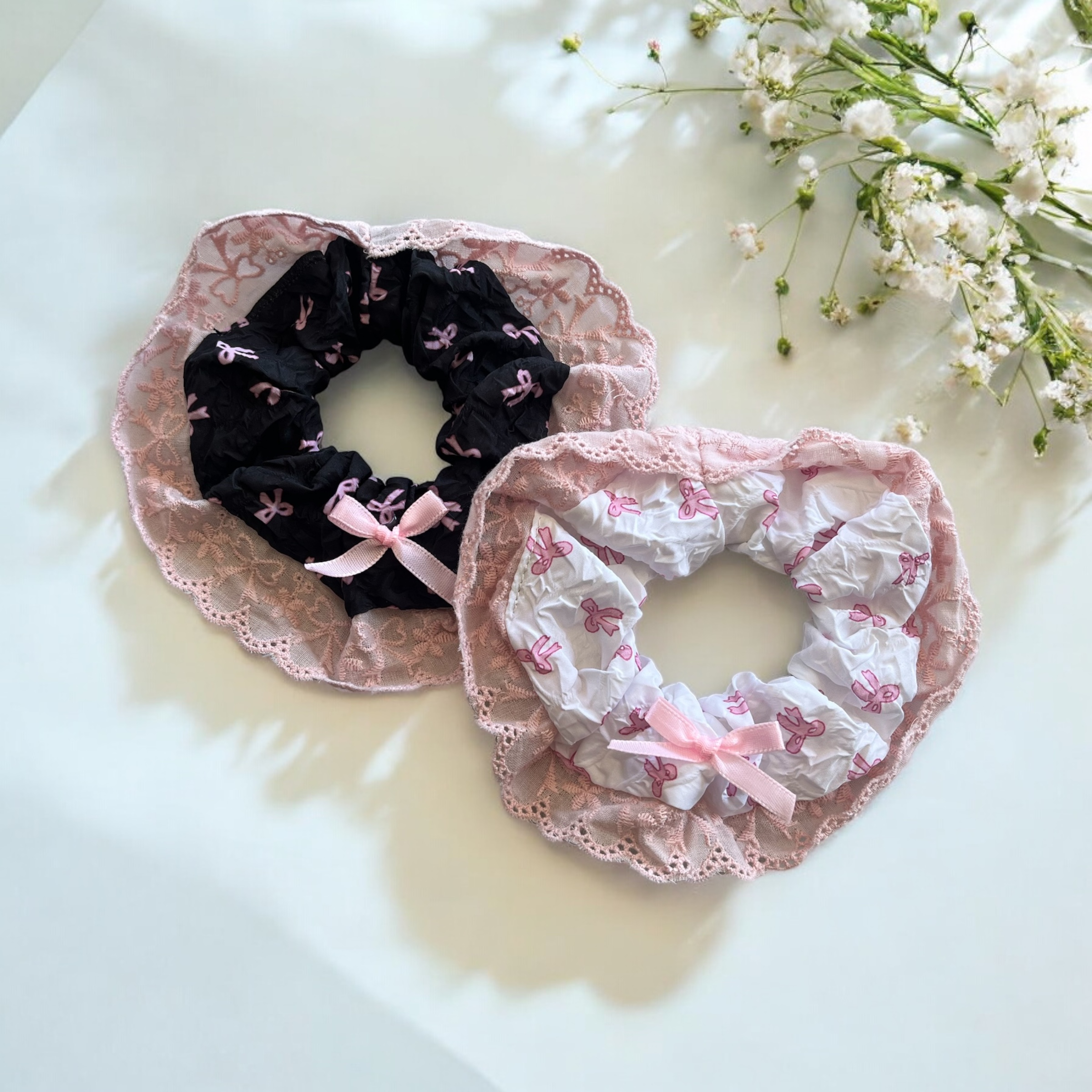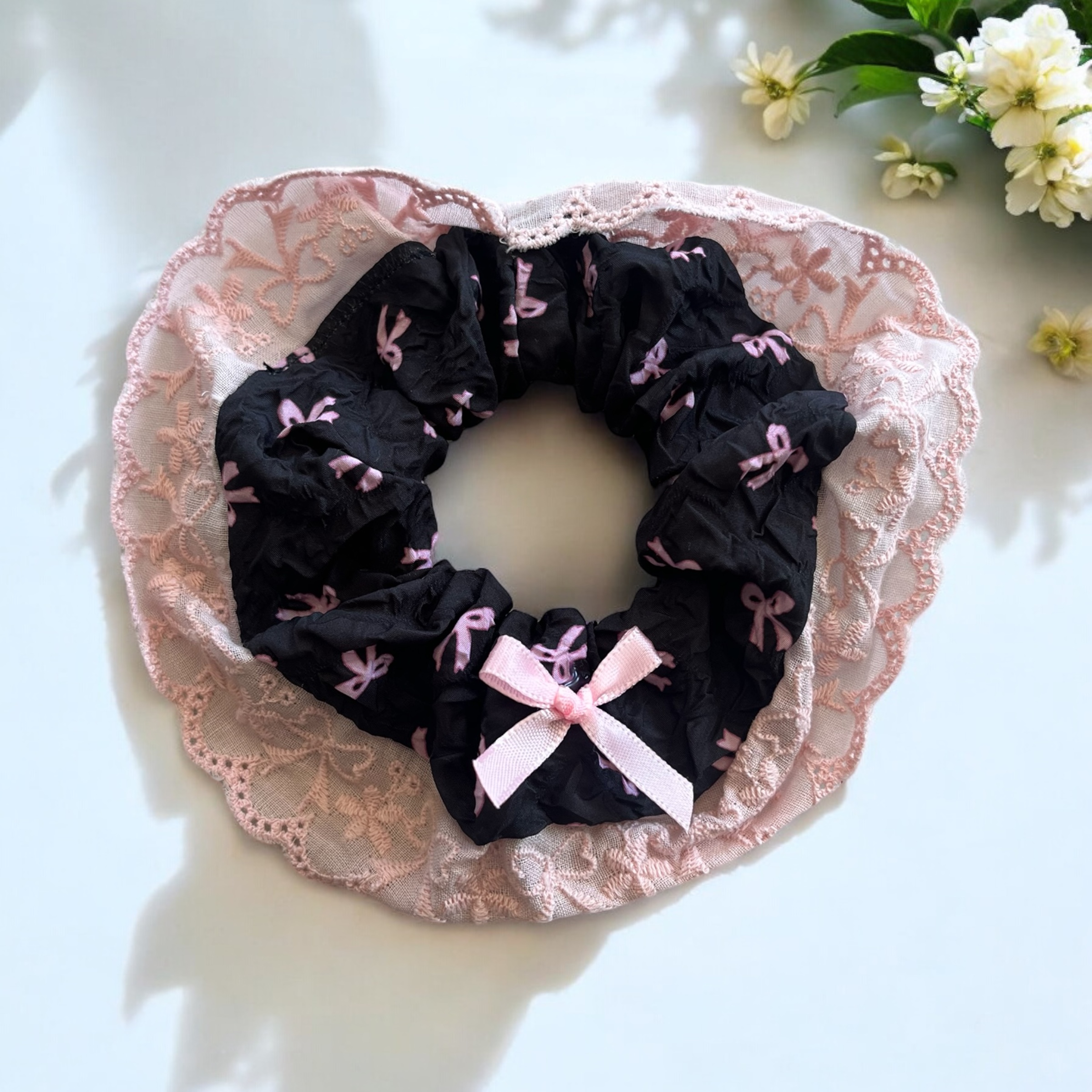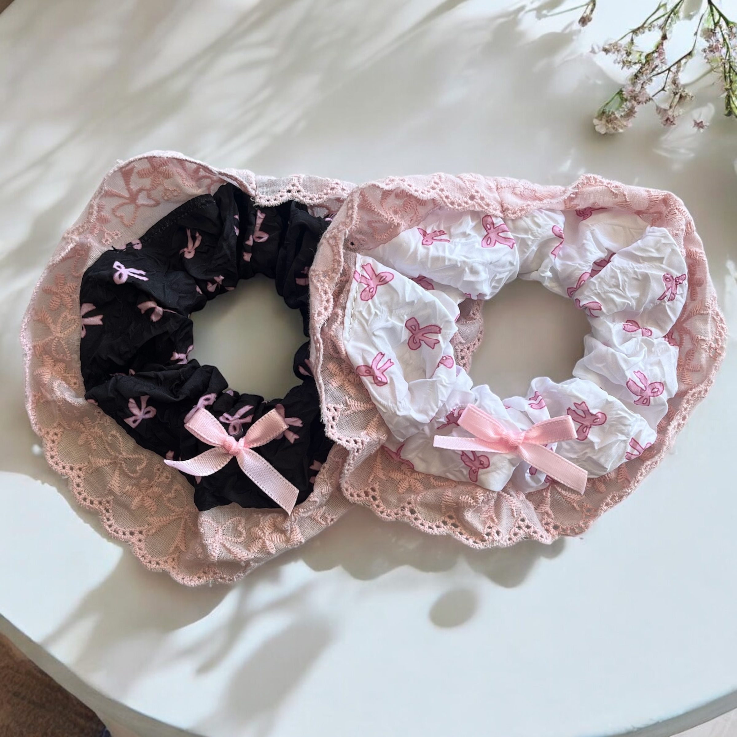 Gumki do włosów SCRUNCHIE czarna biała kokardki różowa koronka 2 szt para